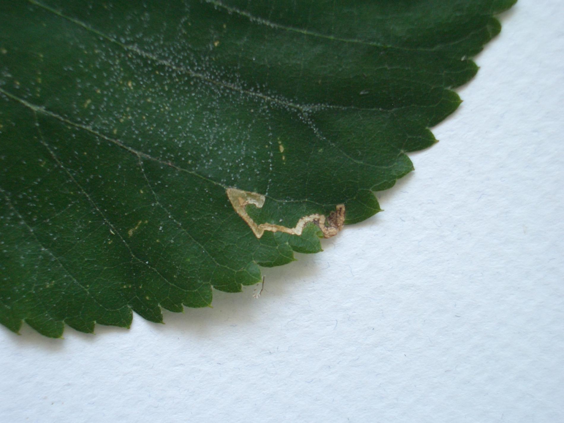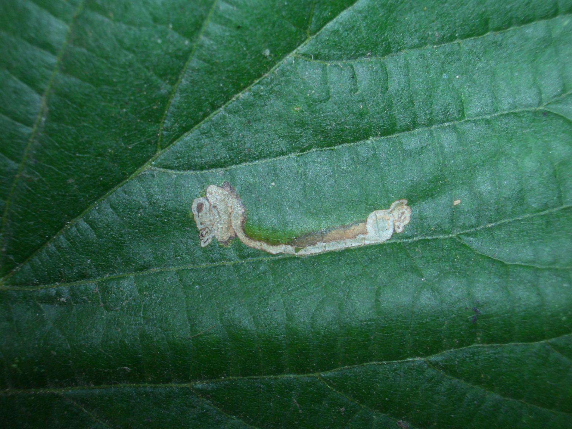 Leaves show gradually widening mines beginning as faint corridors on the leaf, with narrow or dispersed frass lines.