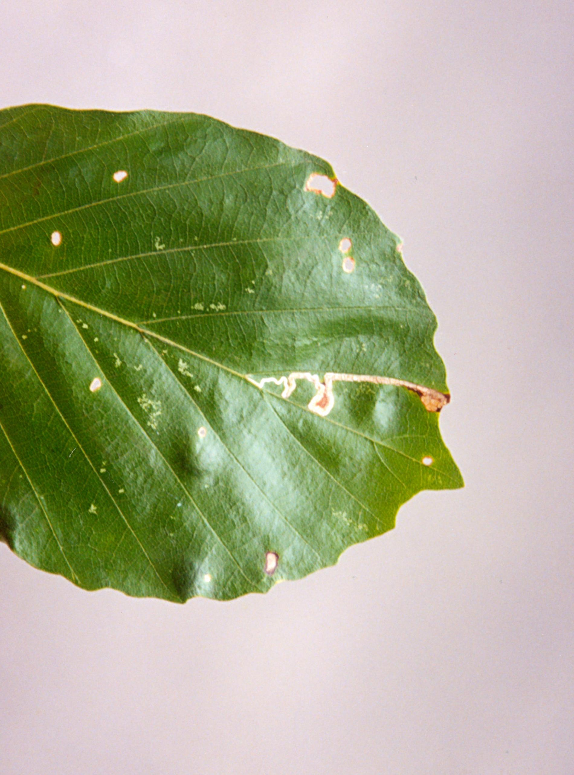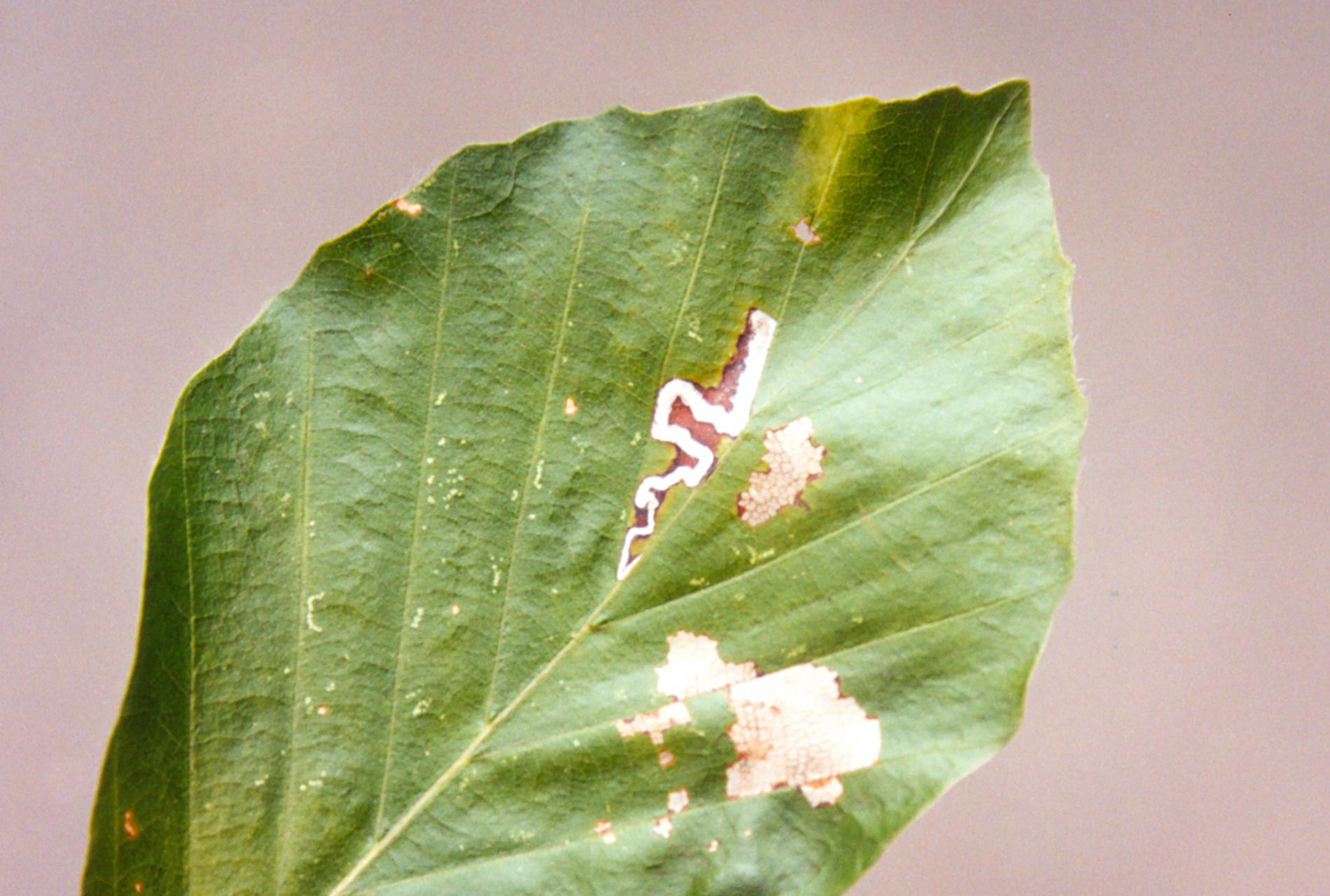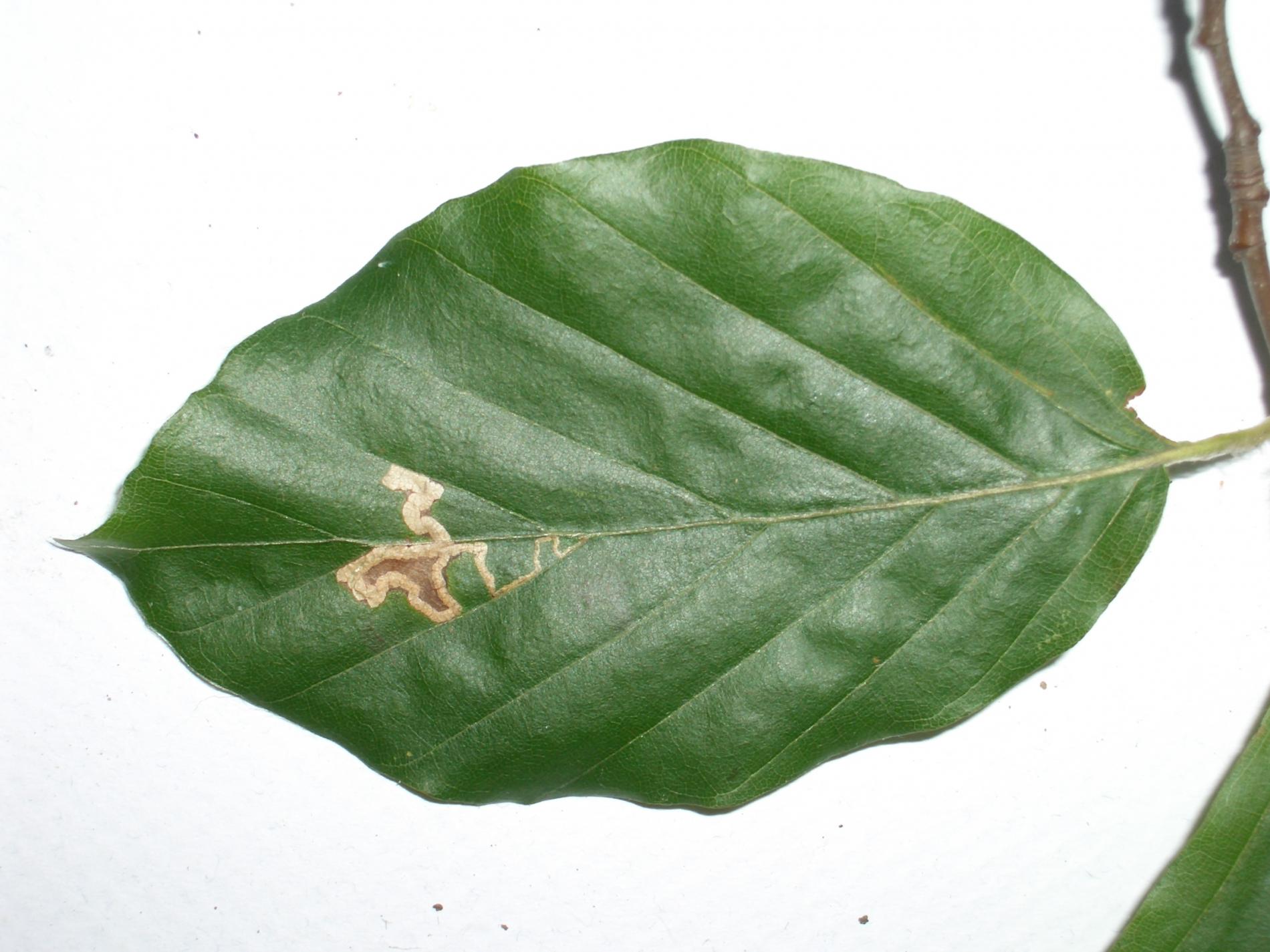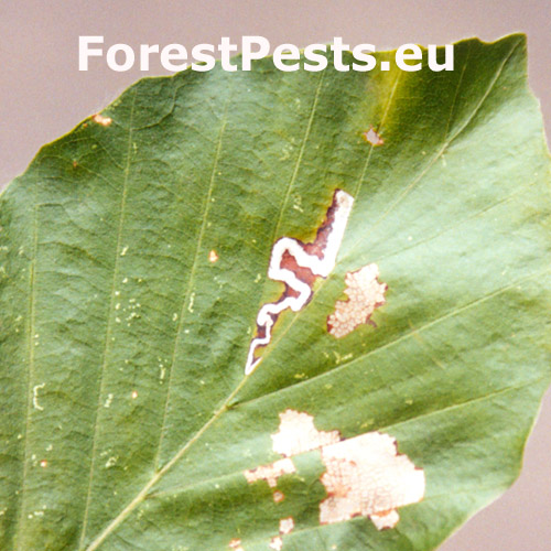 The wingspan of this tiny moth is 5-6 mm. It has two generations per year. The female lays eggs close to the central vein. Feeding trace (mine) starts at the central vein and it gradually goes in an S-shaped way to the edge, usually within the confines of two veins. In the mine lives the yellow larva of the pest. It can be common during the whole season.