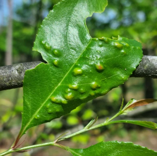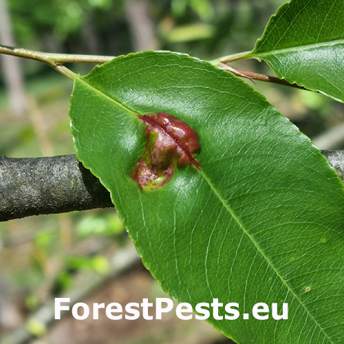 On infected black cherry trees, galls form on leaves, flowers, and fruits, causing twisting and swelling. Affected leaves become curled and deformed, while infested fruits often fail to develop properly. In severe cases, young shoots may wither and die.