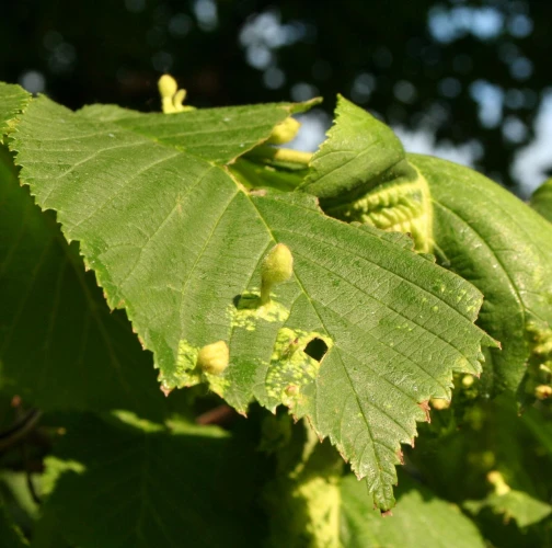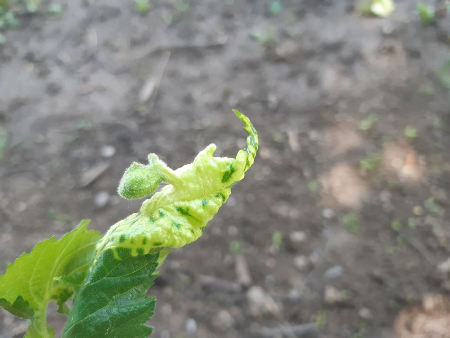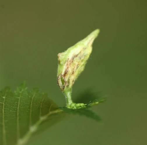 On the upper side of the leaf there are pocket galls up to 2 cm in size. They narrow at the point of contact with the leaf. The galls are hairy and dull.