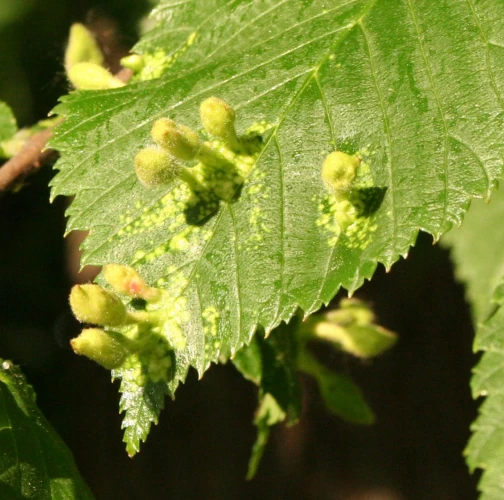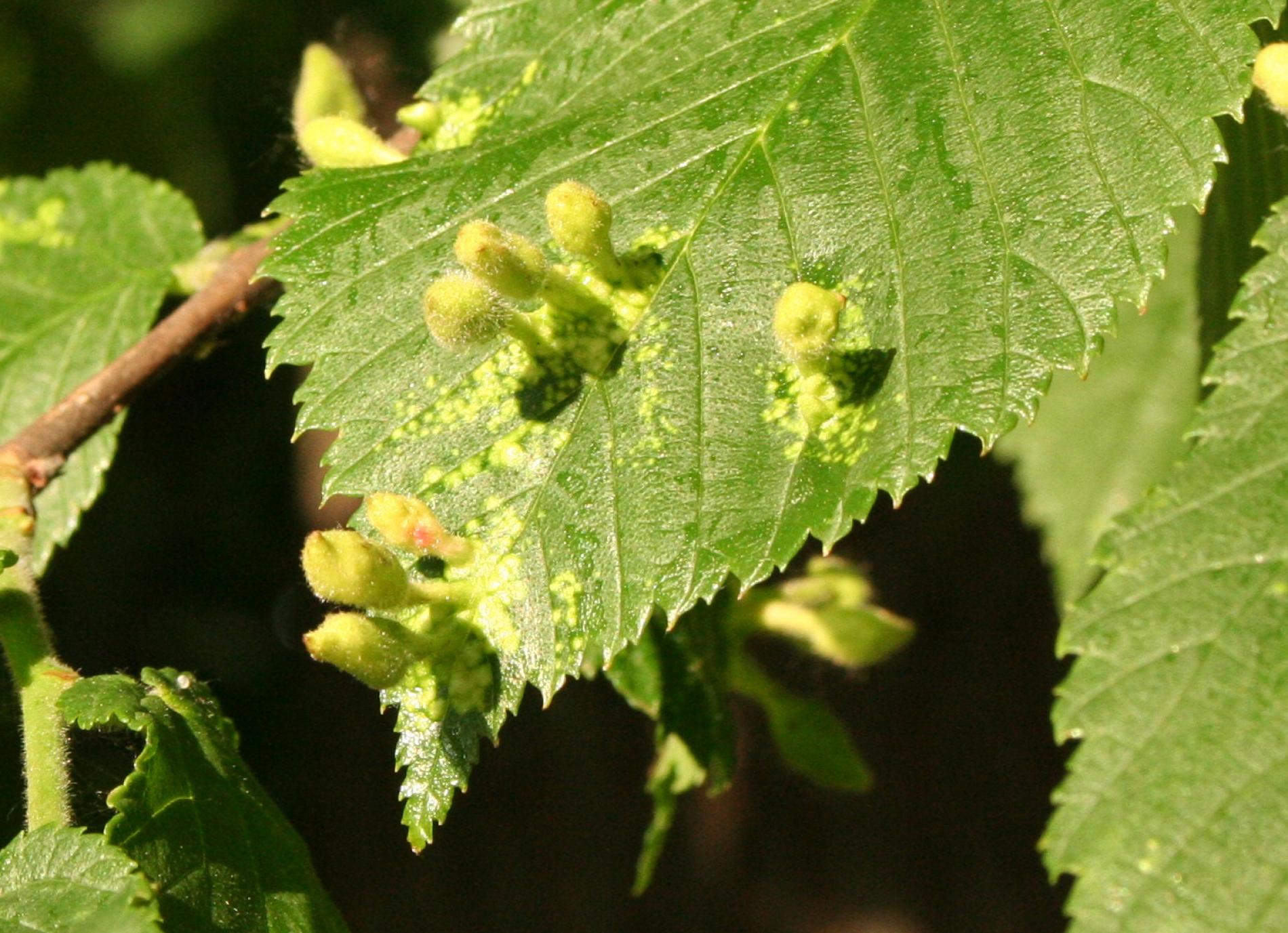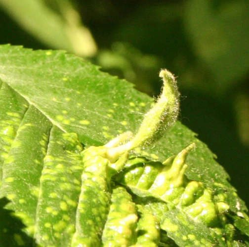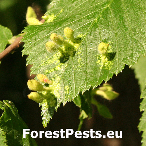 This species of aphid comes from Asia and has spread in Europe and North America. On the top side of the leaf are formed follicle-like galls up to 2 cm in size. They are at first green or yellow-green, later on reddish or rose-red. The galls are stalked, elongate, pubescent (hairy), not shiny, and often with a pointed apex. Inside the galls, a spacious cavity is formed where the development of fundatrices and the 2nd generation larvae takes place. Several galls are usually found on a single leaf. In the place of gall occurrence, the leaf is deformed and changes color from pale green to yellow. It attacks numerous species of elm (Ulmus ssp.) and often heavily infests them. It occurs on many places along with other representatives of this genus. It can be confused very easily with similar T. ulmi (which is widely distributed in Europe on Ulmus spp.) and which has shiny, hairless galls. Many times both species occurs on the same leaf. Further research is needed on the area of taxonomy and symptomatology of the genus Tetraneura.