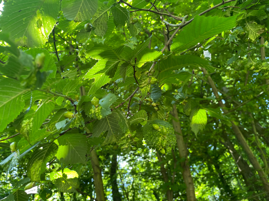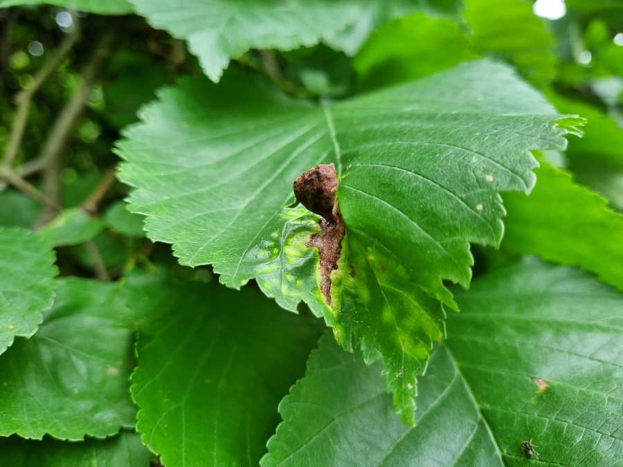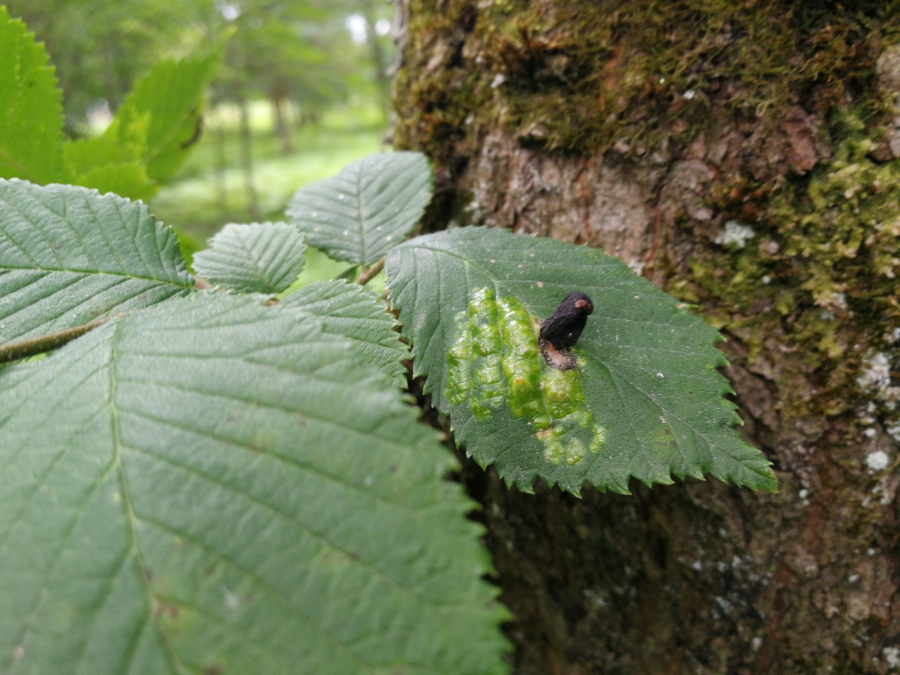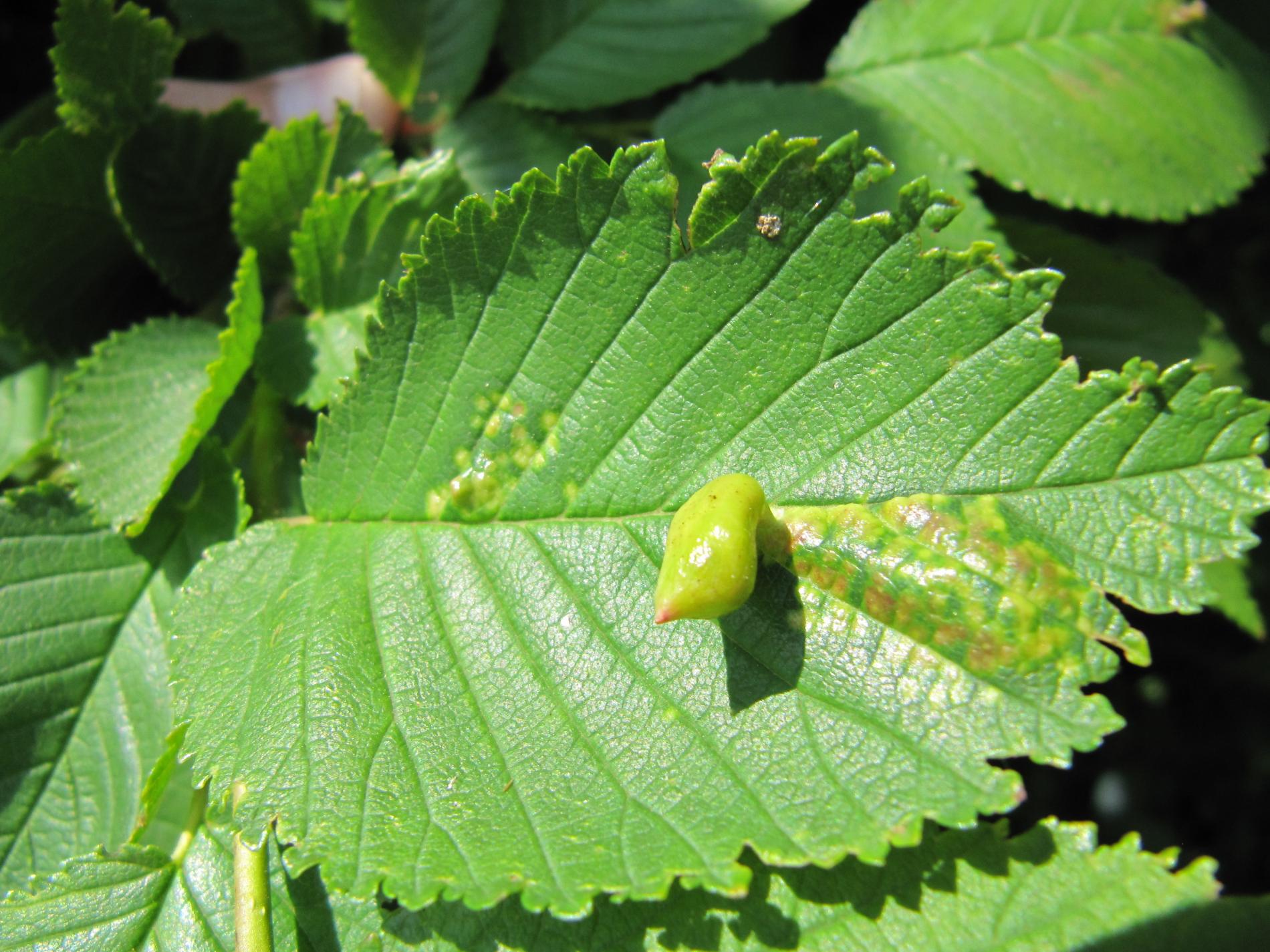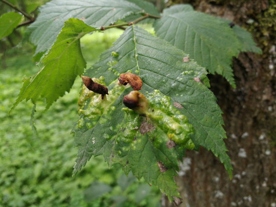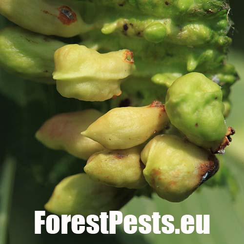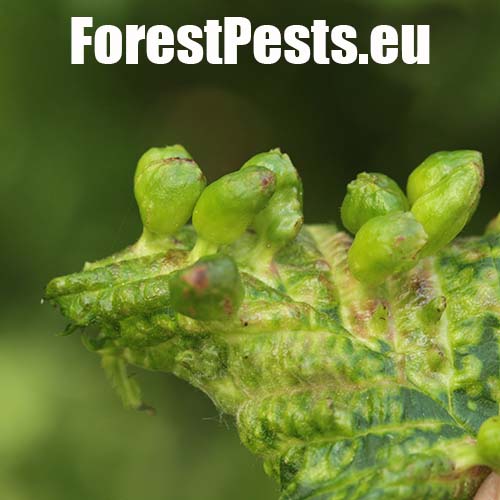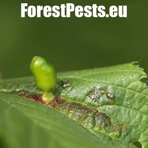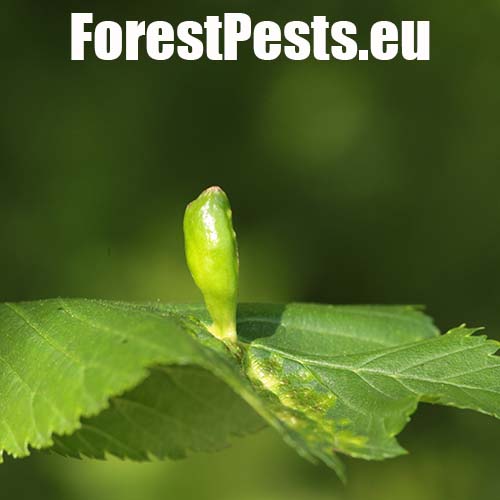 On the upper side of the leaf there are pocket galls up to 2 cm in size. They narrow at the point of contact with the leaf. The galls are hair-less and often shiny.