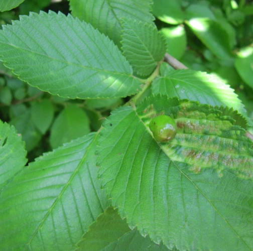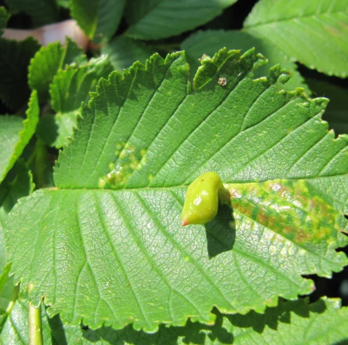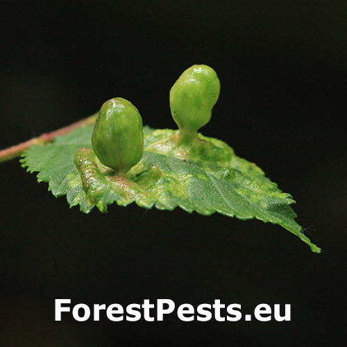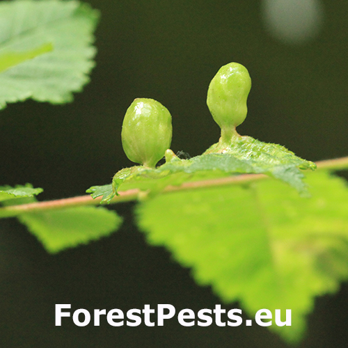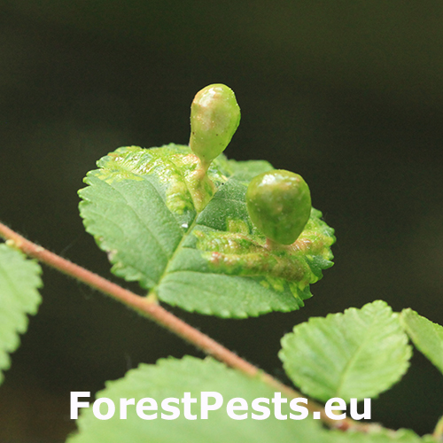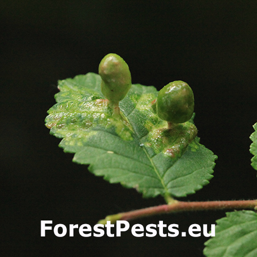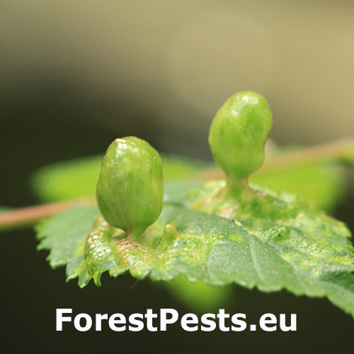 On the top side of the leaf are formed follicle-like galls up to 2 cm in size. Their surface is always smooth, hairless, at first green or yellow-green. They are narrowed at the point of contact with the leaf. Inside the galls, a spacious cavity is formed where the development of fundatrices and the 2nd generation established by them takes place. Several galls are usually found on a single leaf. In the place of gall occurrence, the leaf is deformed and changes colour from pale green to yellow. The galls are hairless and often shiny. It attacks numerous species of elm (it is the most abundant on Ulmus minor and much less on U. glabra and U. laevis) and often heavily infests them. It occurs on many places along with other representatives of this genus. It can be confused very easily with similar T. nigriabdominalis (which is widely distributed from East Asia to Europe on Ulmus spp.) and which has hairy (pubescent) galls. Further research is needed on the area of taxonomy and symptomatology of the genus Tetraneura.