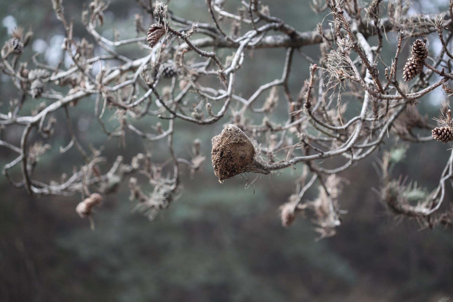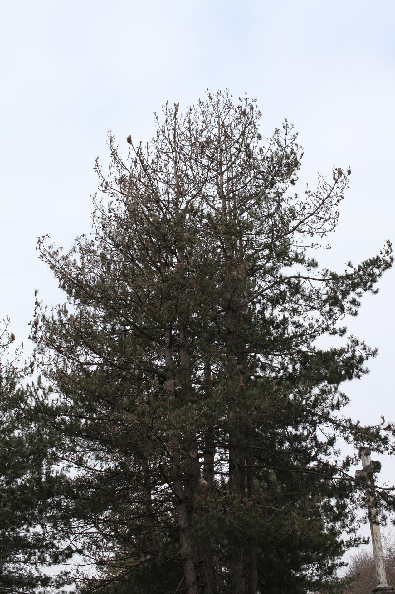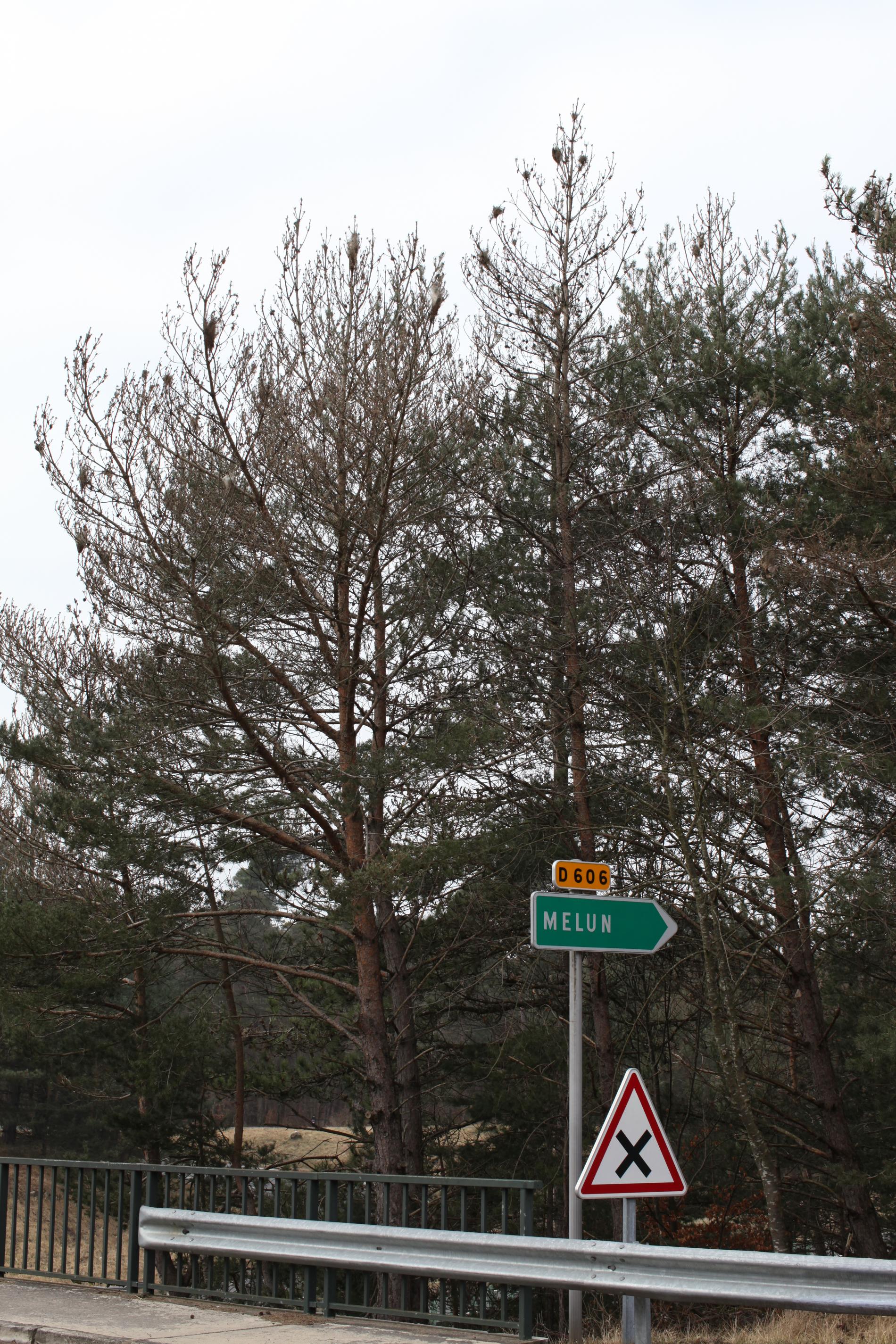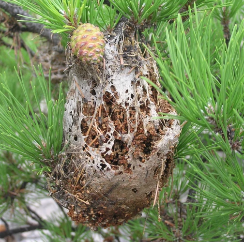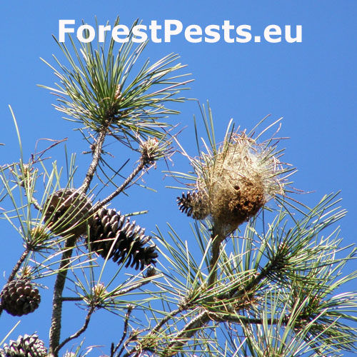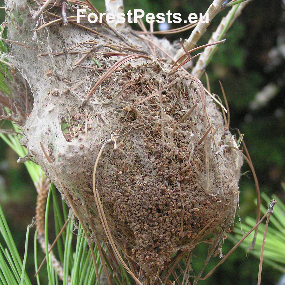 It creates a ´nest´ on the tree, in which the caterpillars spend the night and from where they travel out together in the rows for food in the morning and in the evening. It damages the upper part of the crown. The needles are consumed the whole so that only their base, 1-2 cm long, remain. It can cause up to 100% defoliation of pines.