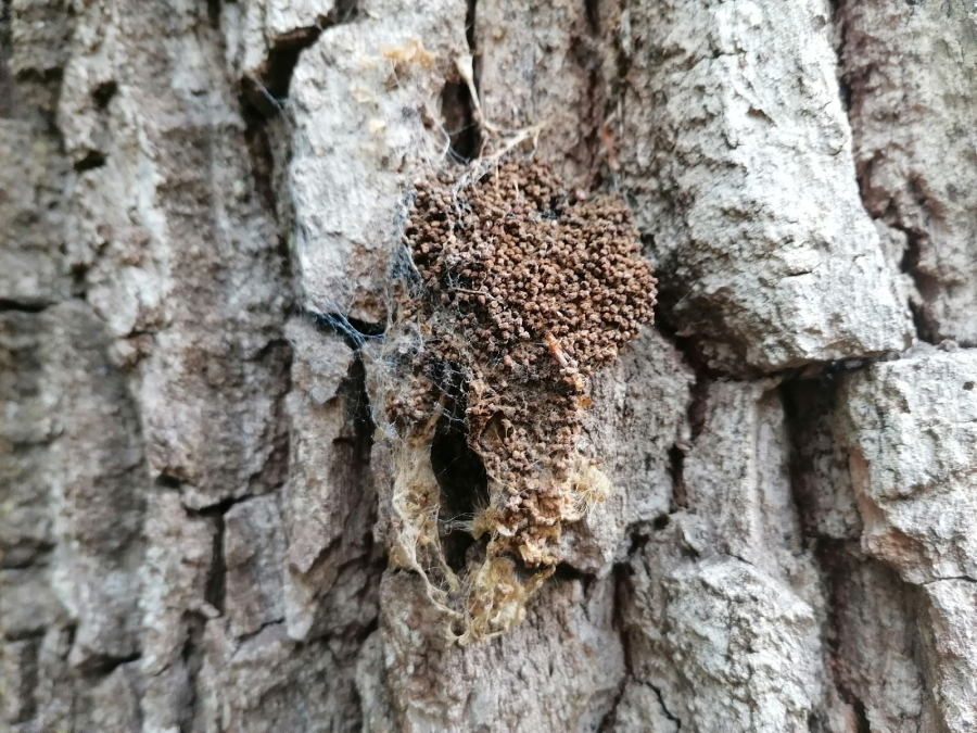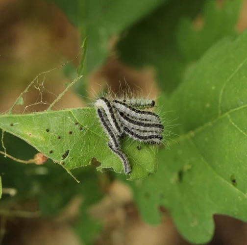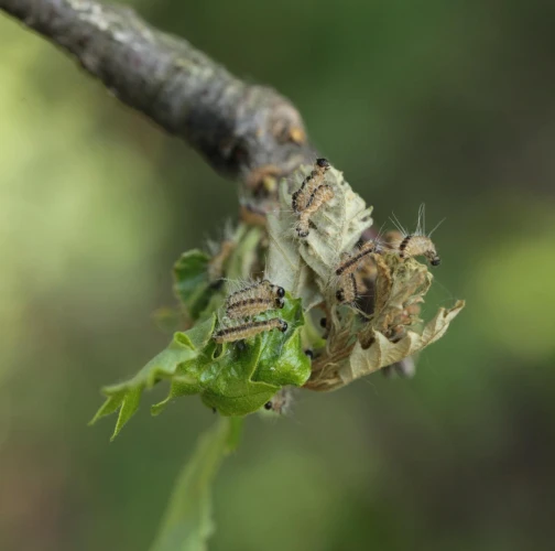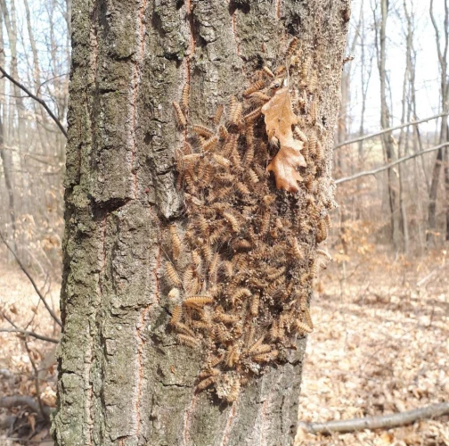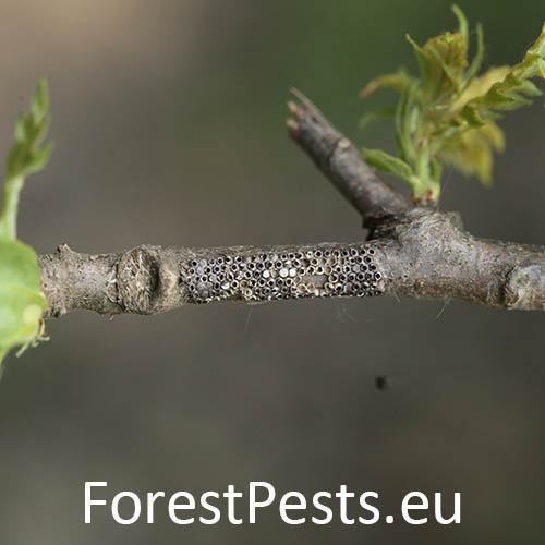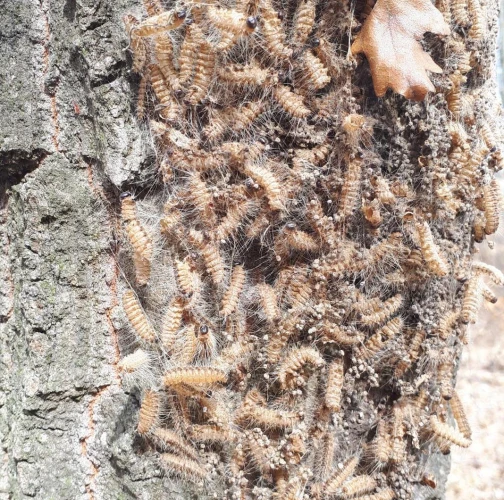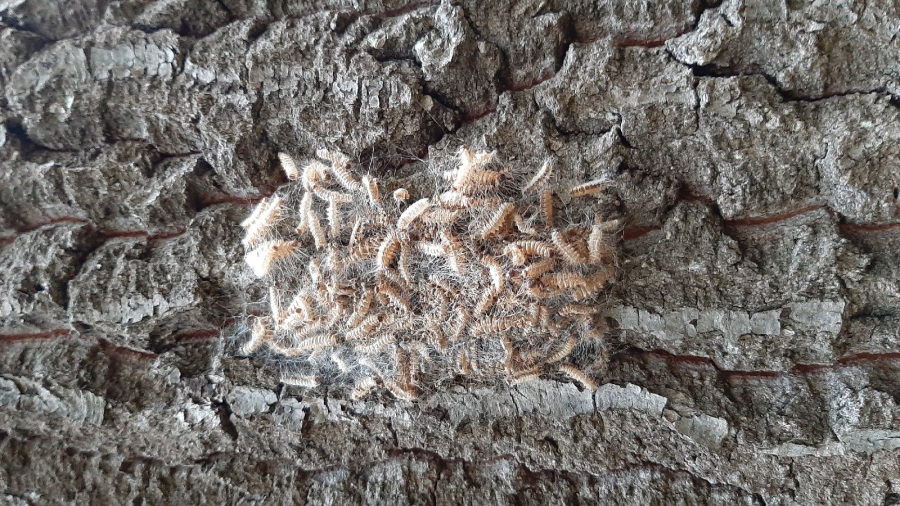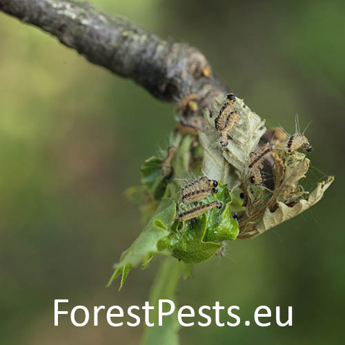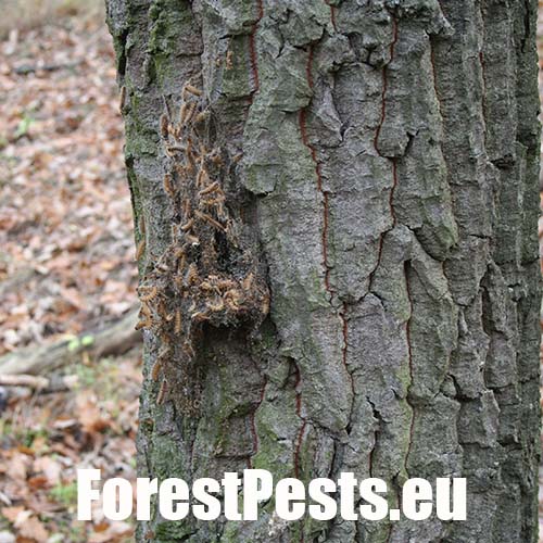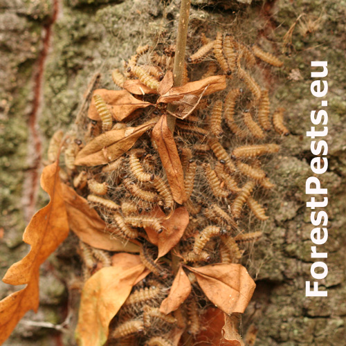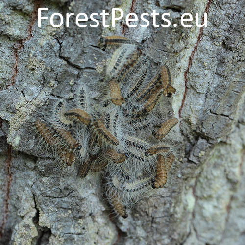 Moths with a 26–30 mm wingspan fly in July. Each female lays between 100 and 200 eggs on twigs and small branches in the canopy. The eggs are deposited in rows in a single layer. The larvae hatch from the overwintered eggs in May. This species is characteristic for the larvae living together in web nests on tree trunks. They crawl out for food, moving one after another in a row, sometimes even several meters long. They pupate in the nest or at the tree base in a cocoon. Beware of the larvae!!!! Their hair can cause allergic reactions in contact with skin.