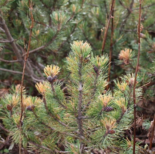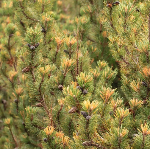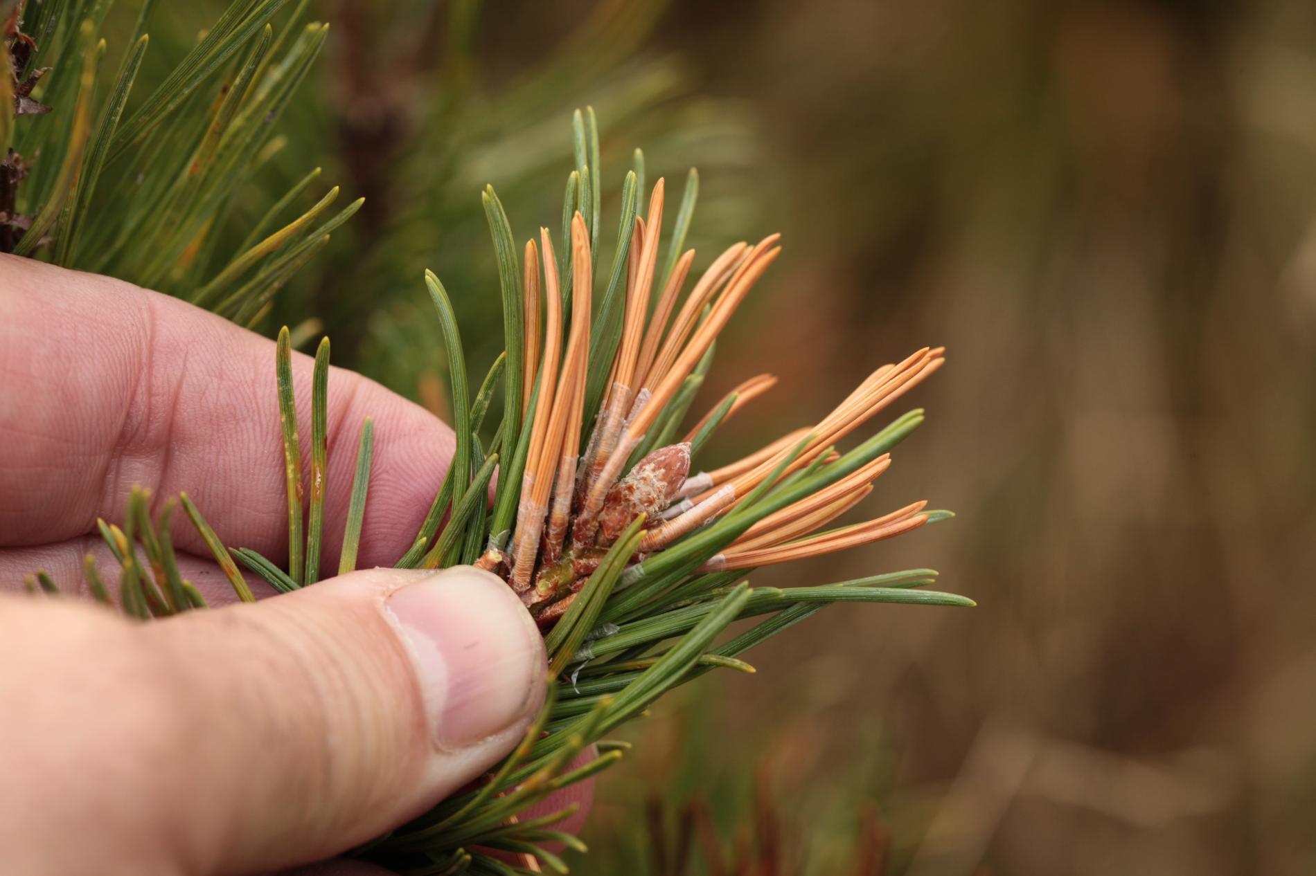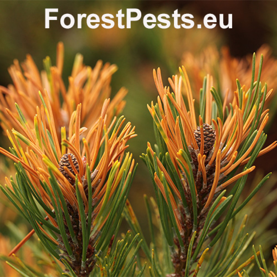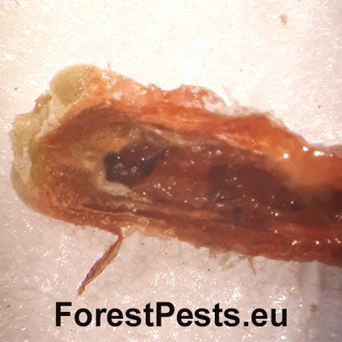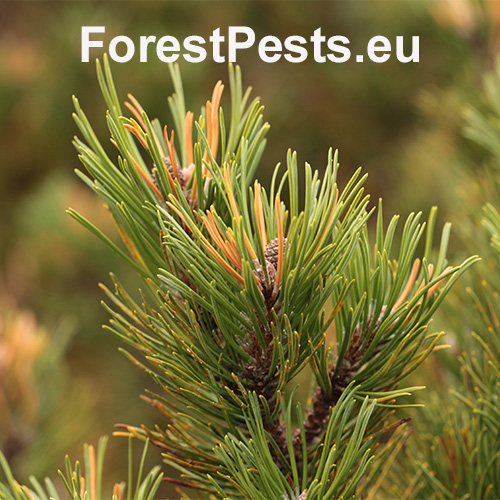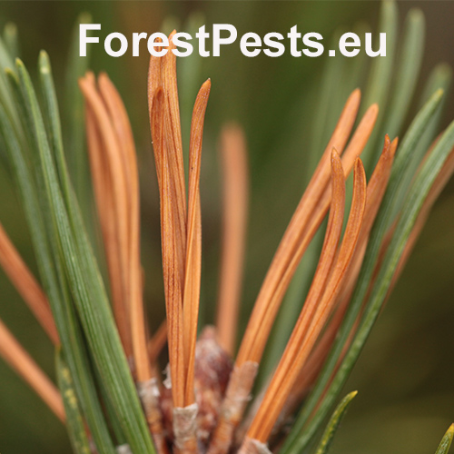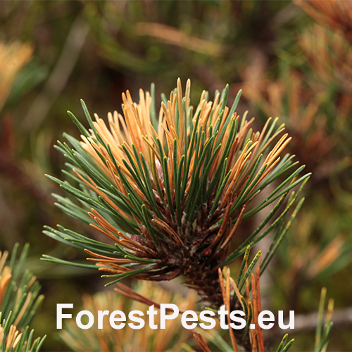 It is small insect, about 2-3 mm. Adults fly in May. Females lay 2-6 eggs to the base of needles of bud breaking pine trees. Larvae hatch already after few days. They hide under the scales of pines sheath where they suck juices from growing tissues. Needles at the place of sucking frequently get thicken. Until autumn the needles are green, however, later on they get brown colour and fall down. This pest causes damage mainly in pine forests within the age of 50 years. It is a significant pest of all pine species including Pinus mugo.