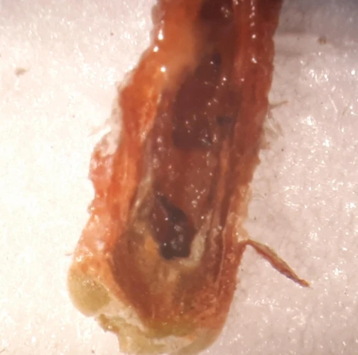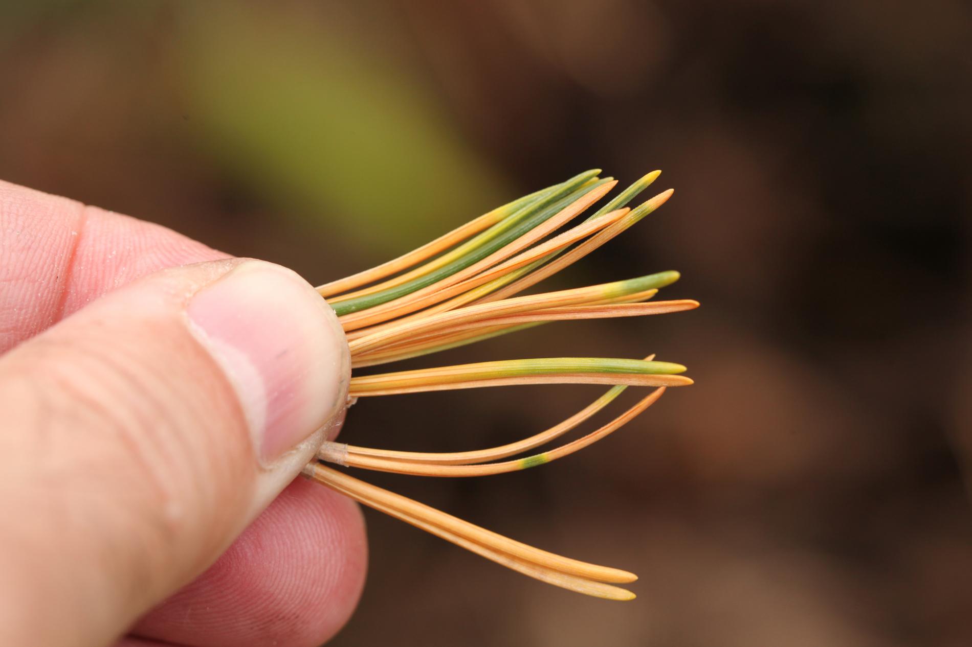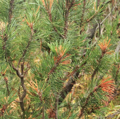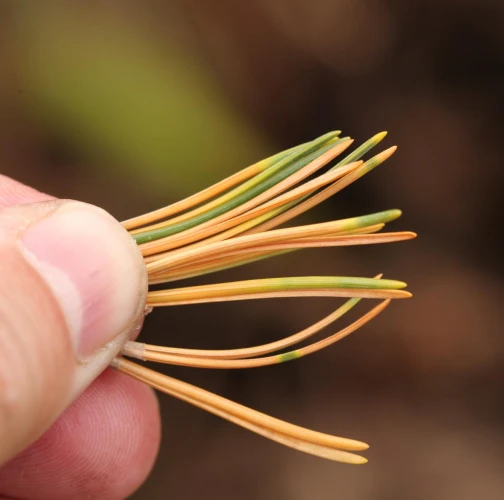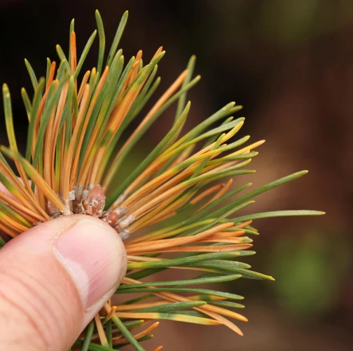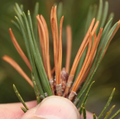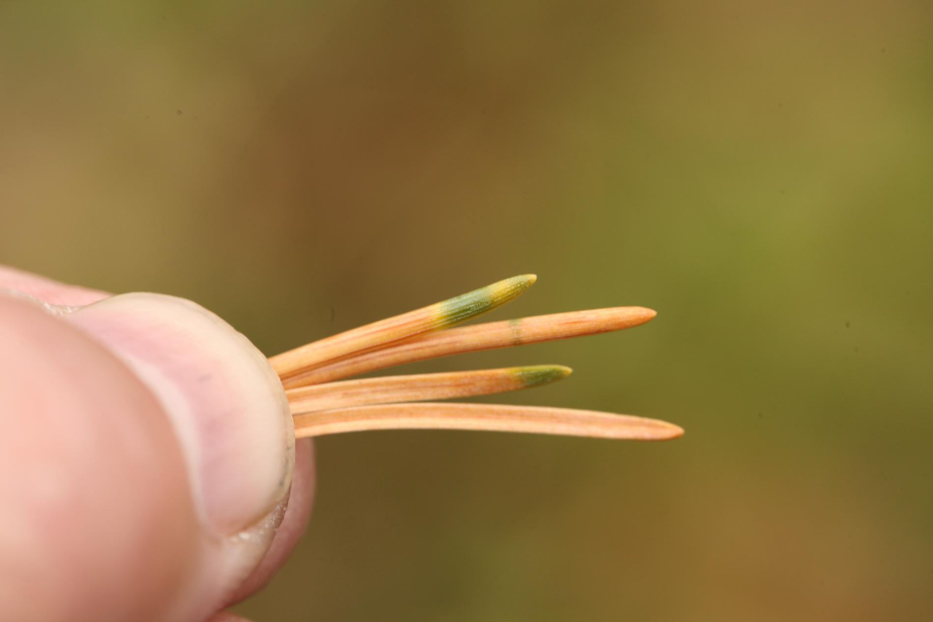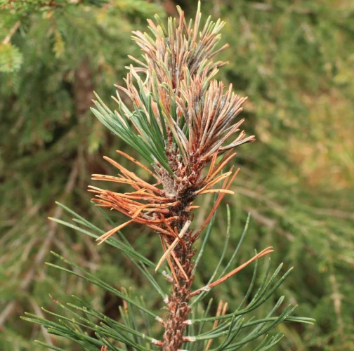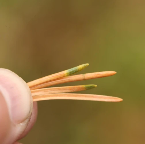 Needles are shortened and rusty. Needles at the place of sucking frequently thicken. Until autumn the needles are green, later on they get brown colour and fall down.