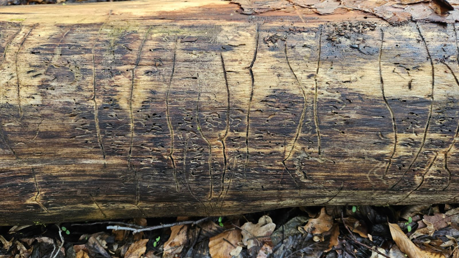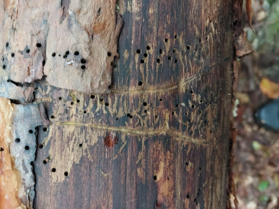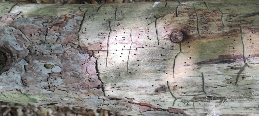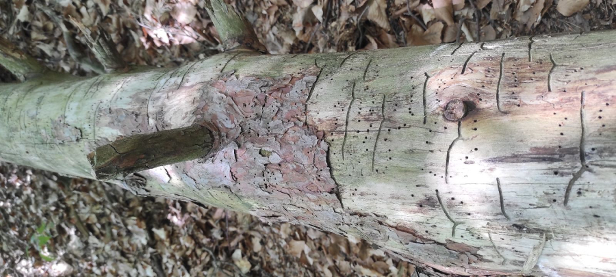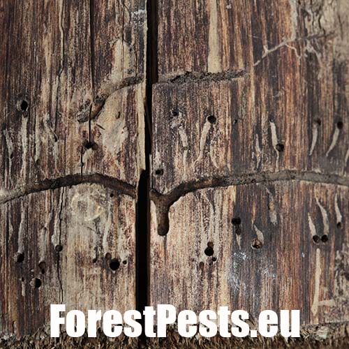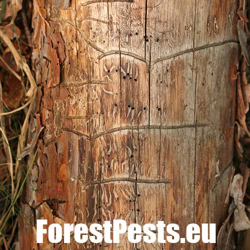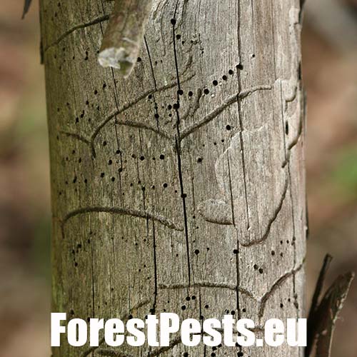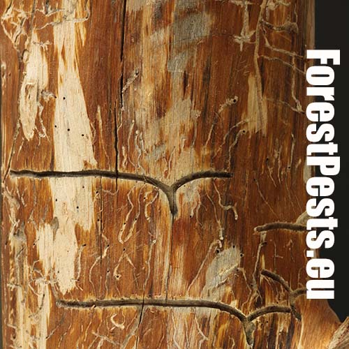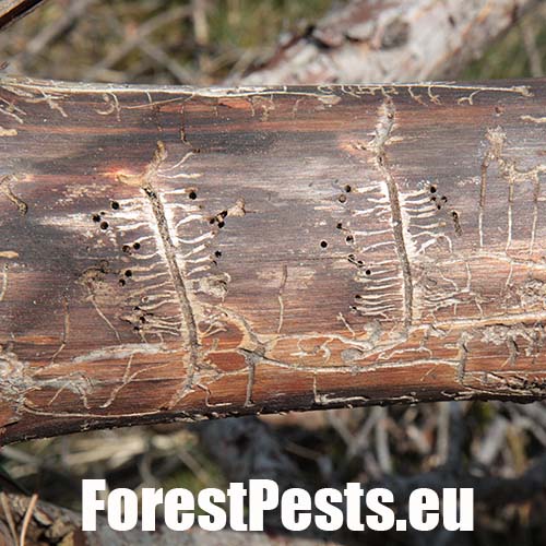 A bird-shaped galleries (up to 12 cm long and 2 mm wide) with sparse and short (2-3 cm) larval tunnels. They can be find mainly under the thin bark on standing trees.