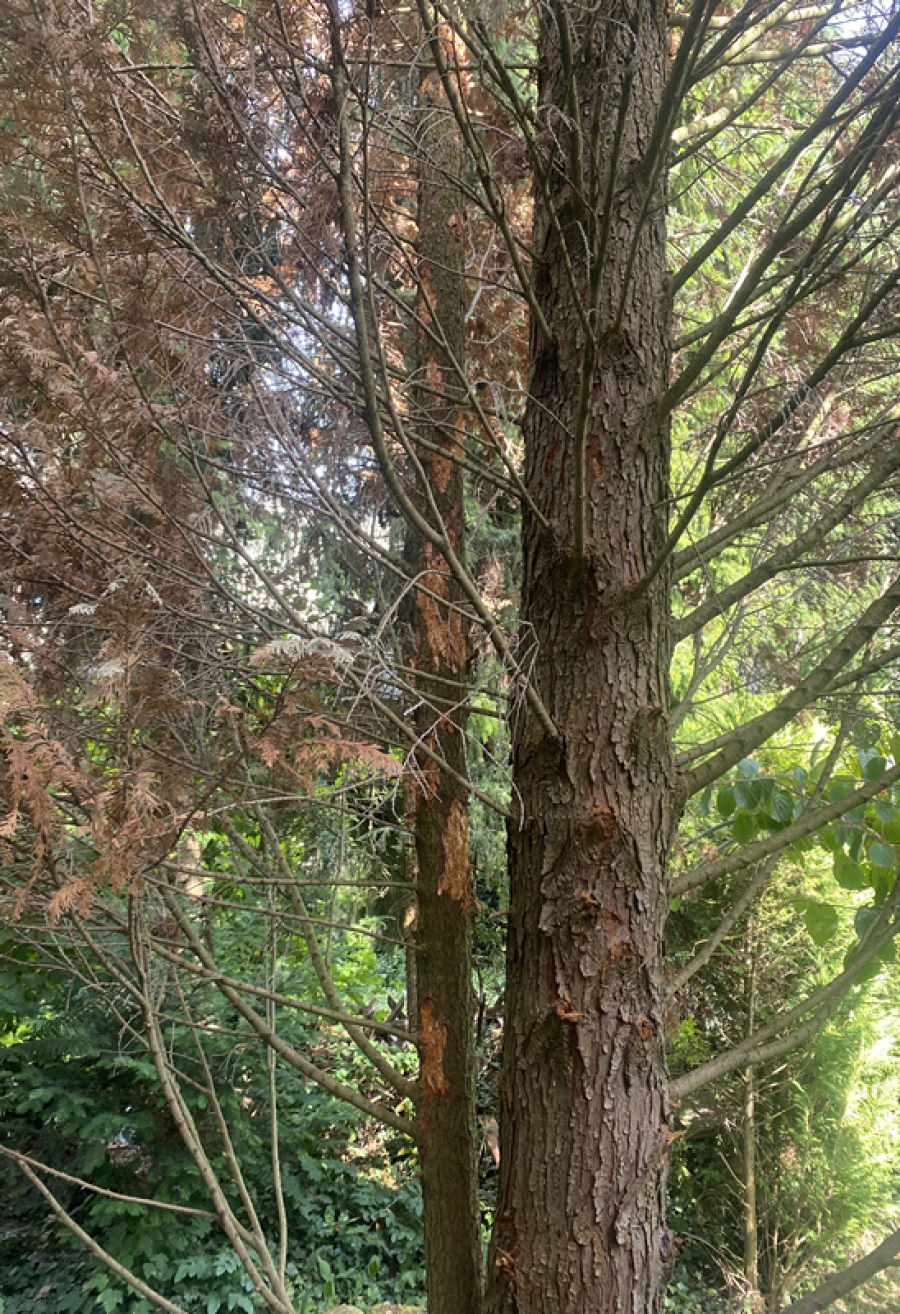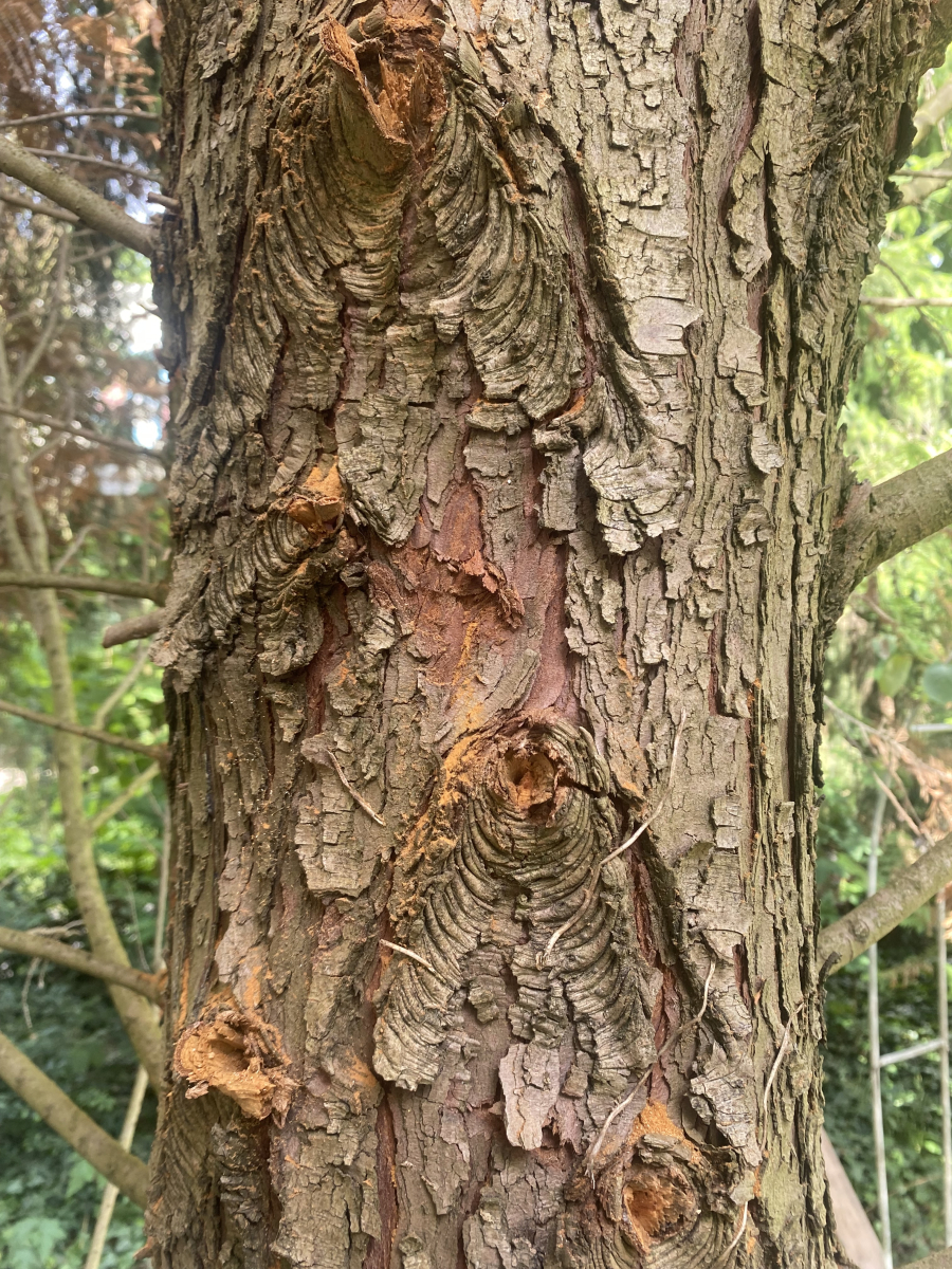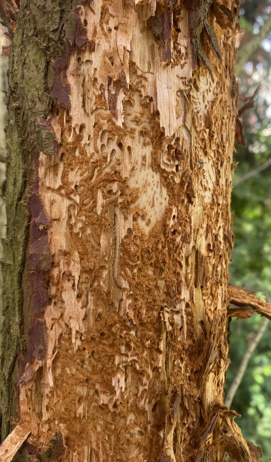 A bird-shaped galleries (up to 12 cm long and 2 mm wide) with sparse and short (2-3 cm) larval tunnels. They can be find mainly under the thin bark on standing trees.