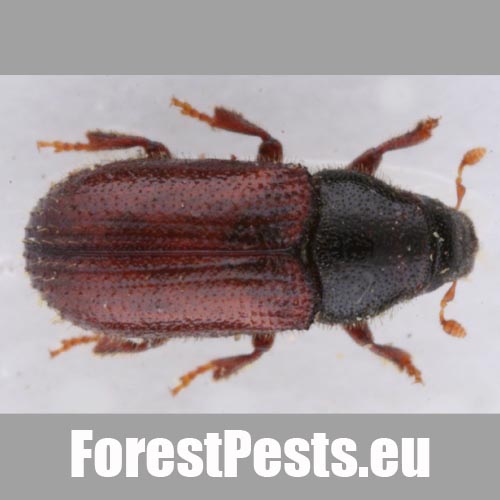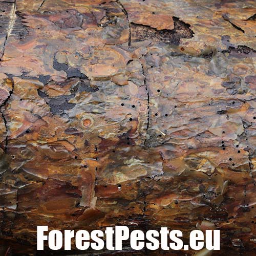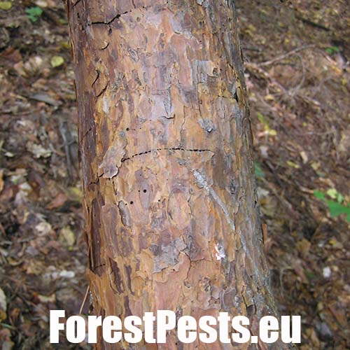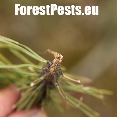 Adult beetles fly in very early spring, often as early as March and April. The female flies onto thin parts of pine trunks and branches. After mating, they construct horizontal bird-shaped galleries (up to 12 cm long and 2 mm wide) with sparse and short (2-3 cm) larval tunnels. The can be find mainly under the thin bark on standing trees. Above an egg gallery is located a series of ventilation holes. Larvae pupate deep in sapwood. Young adults fly into pine crowns and bore into healthy pine sprouts where they realize maturation-feeding inside the sprouts. Damaged trees can be later attacked by secondary insect species. This species is widespread in Europe and occasionally can cause serious damages in stands of middle age classes.