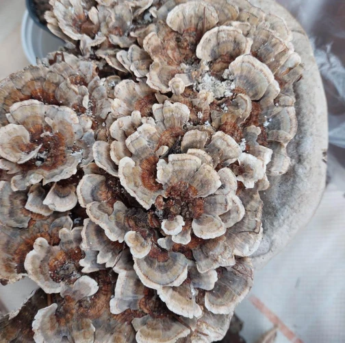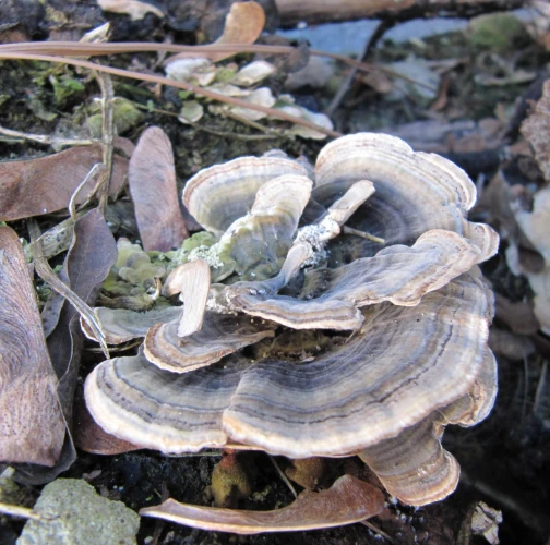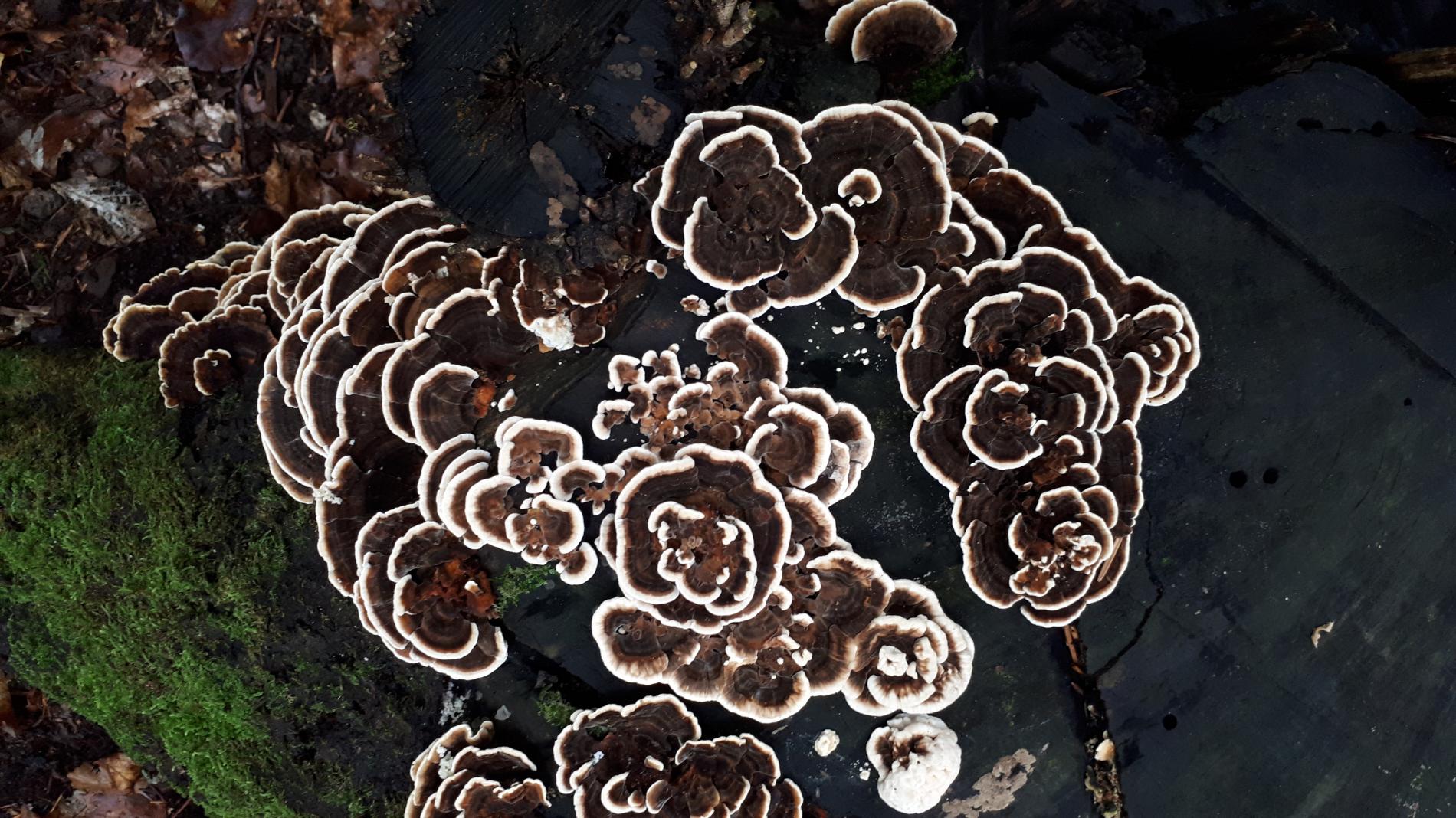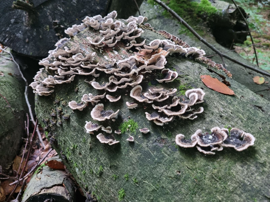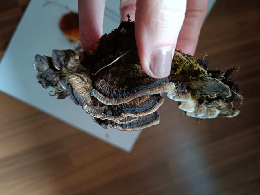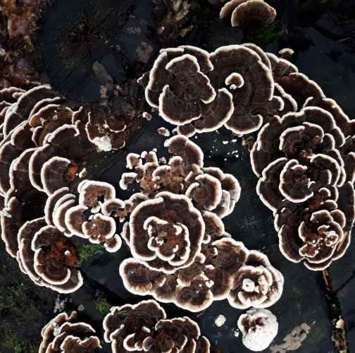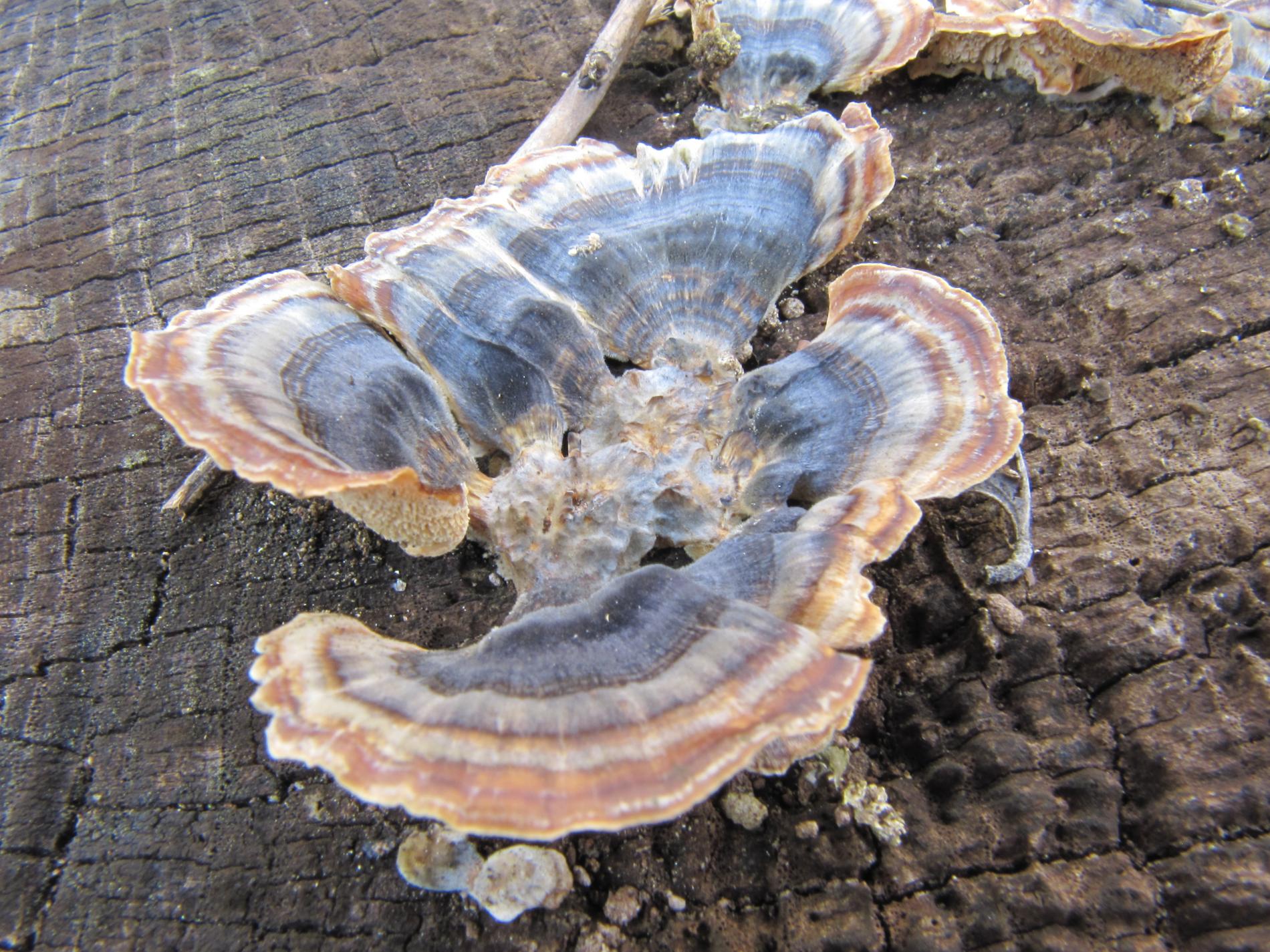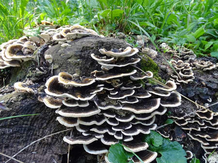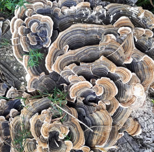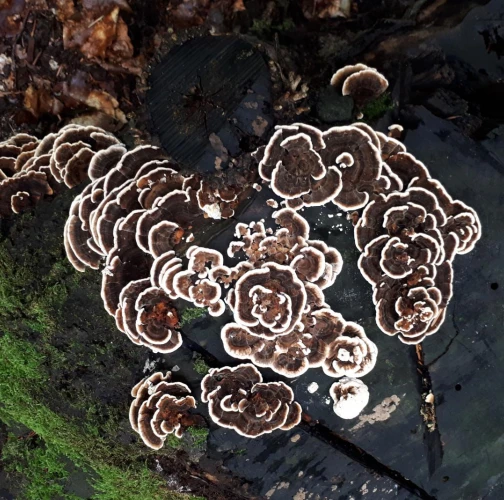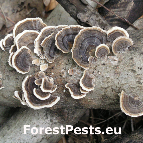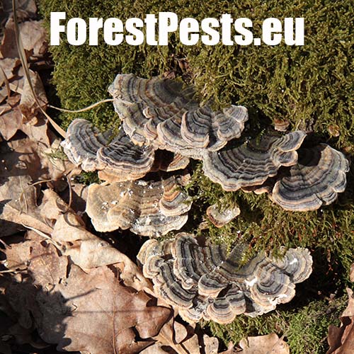 The fruiting bodies are thin, semicircular, arranged in roof-like formations one above the other, colourfully zoned. The pores are bright-coloured, tiny and difficult to recognize. It belongs to the most vital wood “decomposers”. It causes white rot of attacked wood, sometimes the rot is a straw-yellow shade.