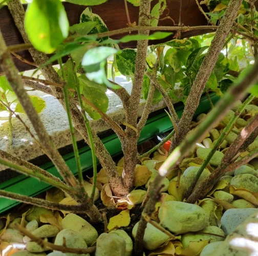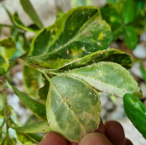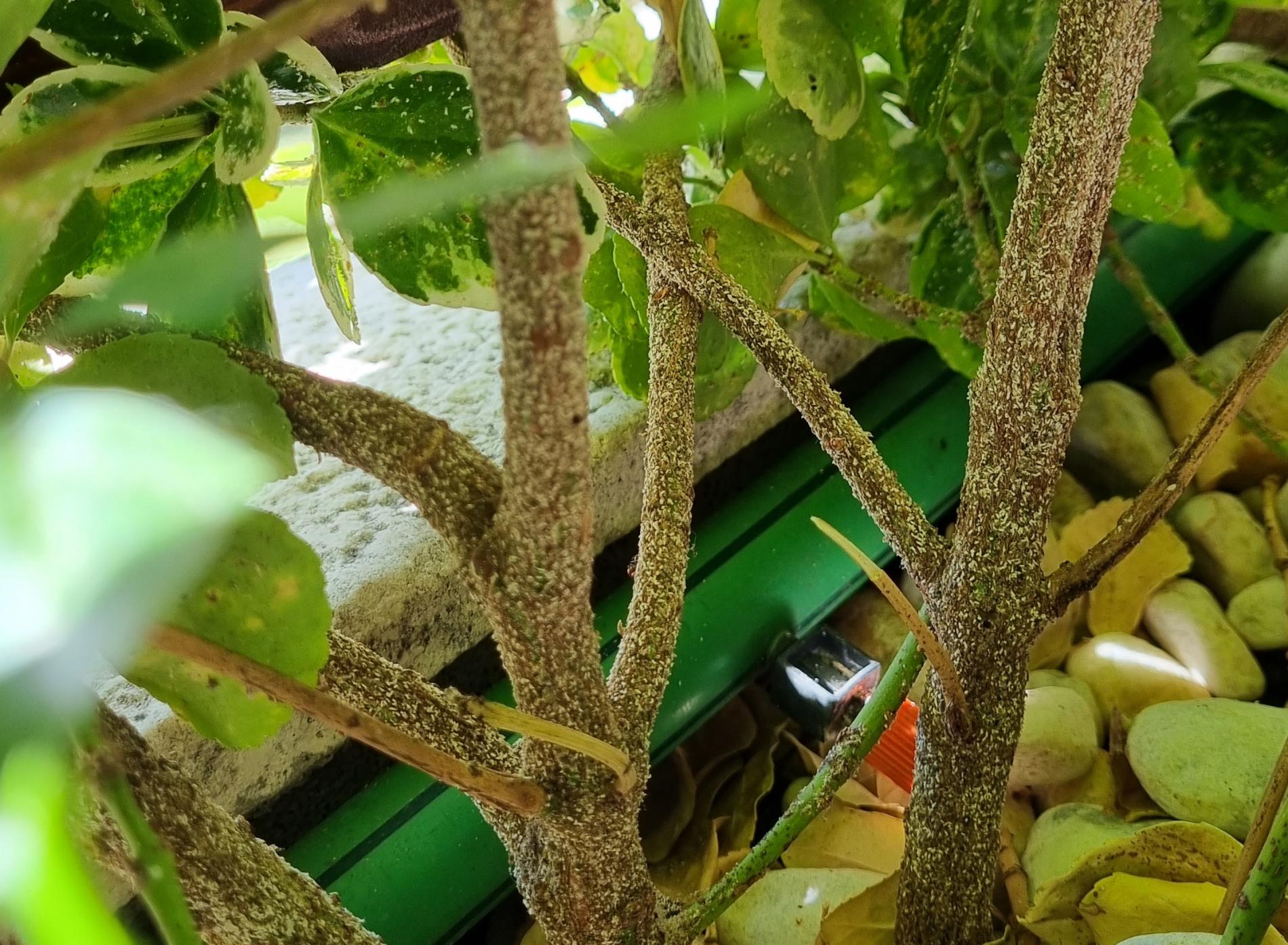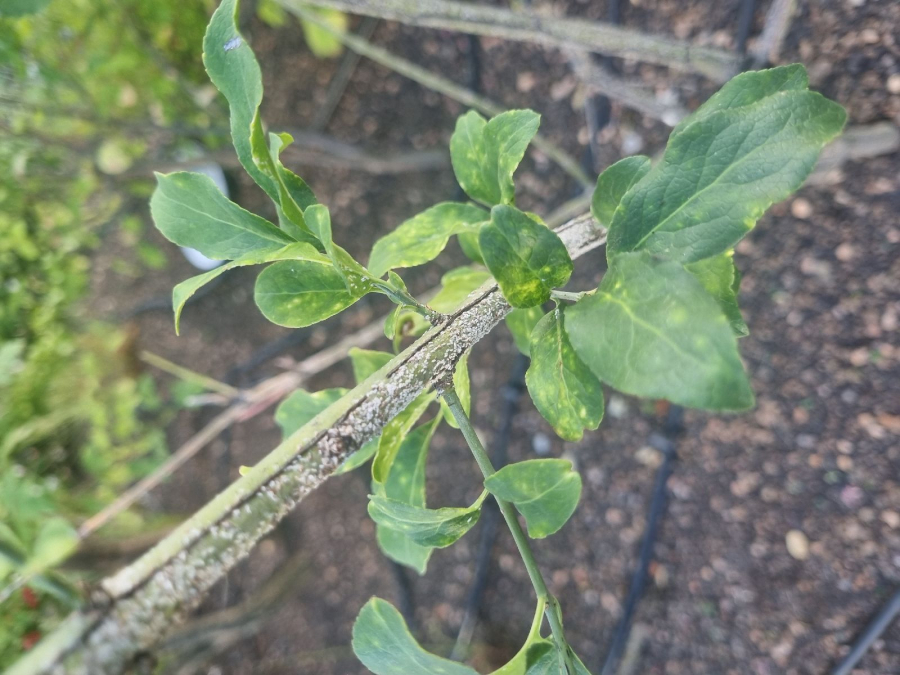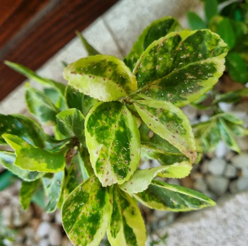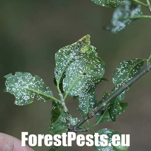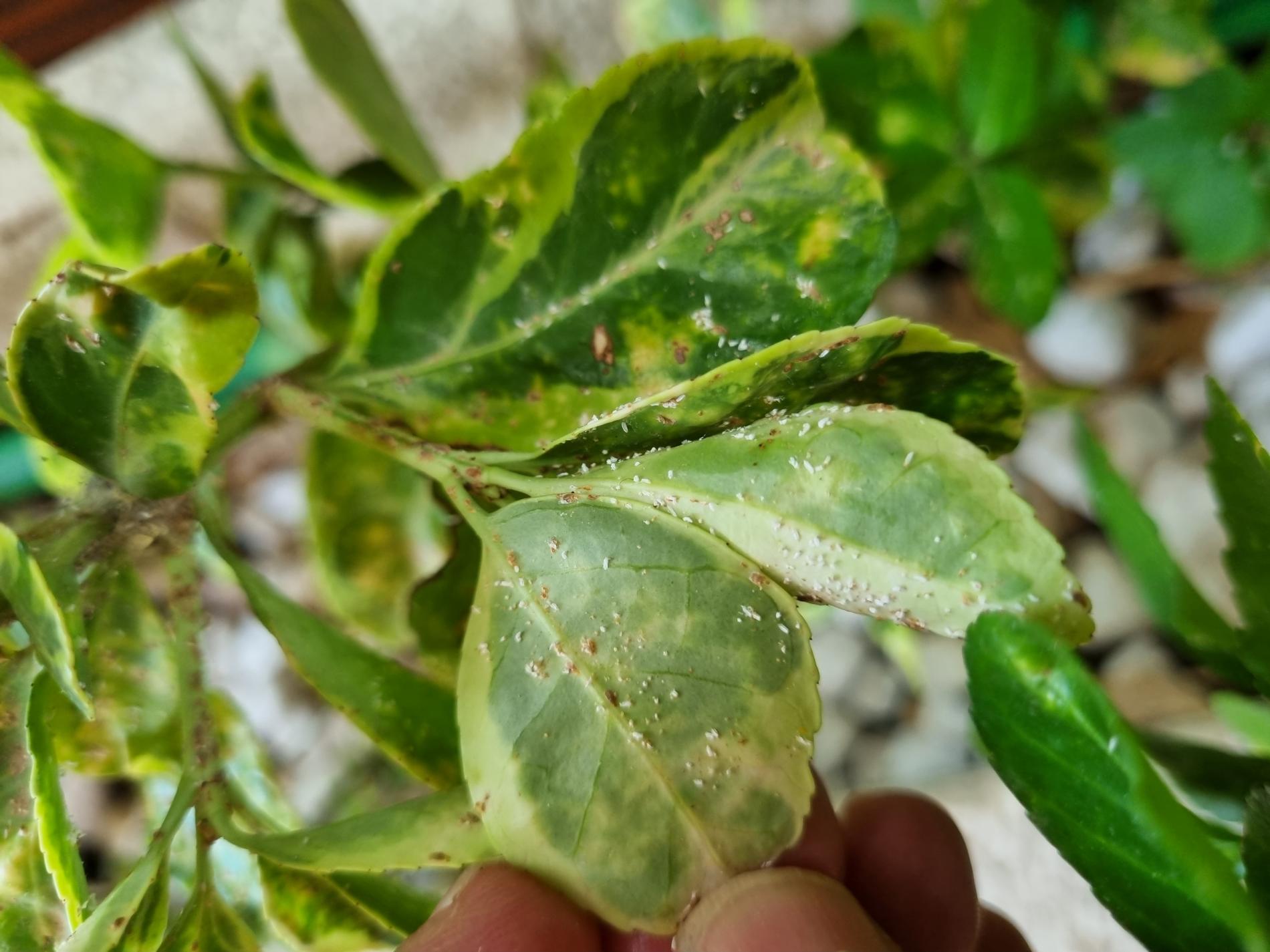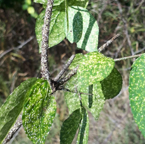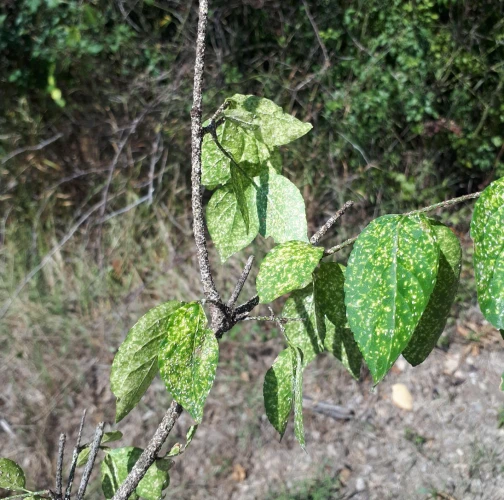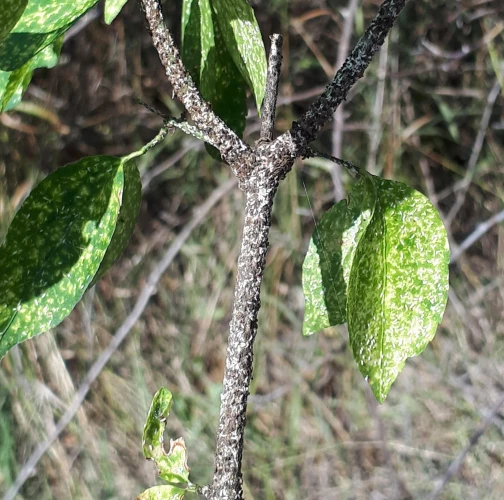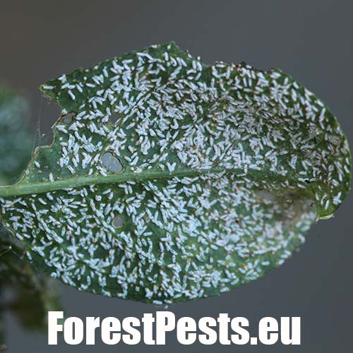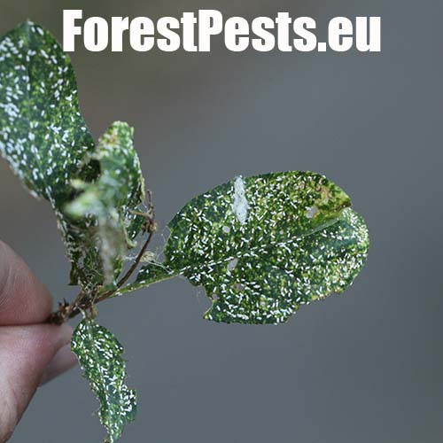 Tiny light dots, later surface damage on the leaves manifesting as yellow to reddish-brown spots. Dying of branches and whole shrubs.