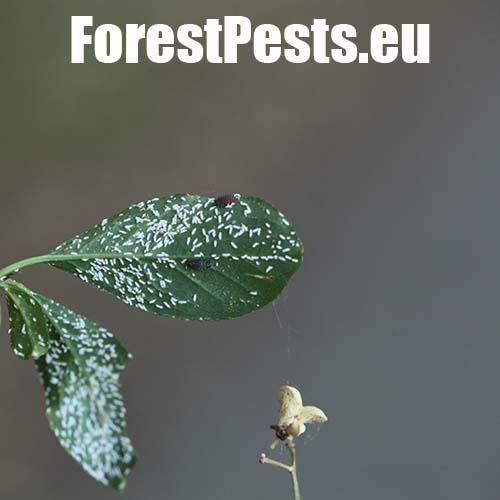 Unaspis euonymi, also known as the euonymus scale, is a pest that primarily attacks plants in the genus Euonymus. Unaspis euonymi is a bivoltine species, and the mated females overwinter. The females primarily infest branches, while males are mainly found on leaves. A heavy infestation of Unaspis euonymi can cause both aesthetic and physiological damage to plants. Infested leaves become spotted, and the plant may lose vigor and even die. Infestations can be controlled through the use of insecticides, as well as through the removal and destruction of heavily infested plant material.