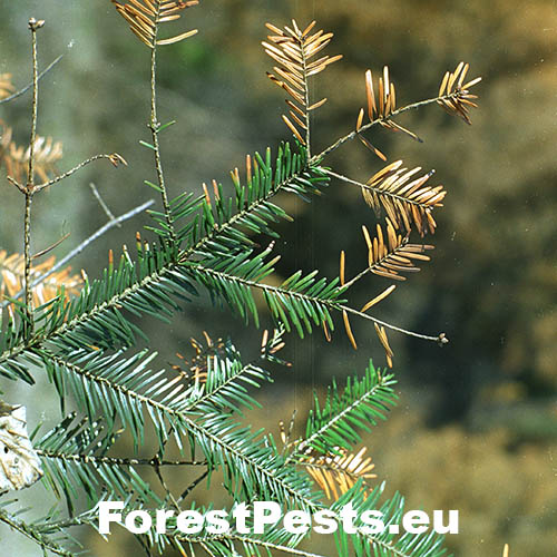 The lumps on needles are pycnidia of asexual stage Cytospora pinastri in which conidiospores are created. In the time of fir flushing, they infect the youngest needles just in bud. Needles older than two years as well as the unwounded bark of branches are resistant to infection. However, once the infection occurs, the mycelium spreads out through the plant tissues under the bark towards the trunk of the tree, but the infection does not proceed to the trunk. Weakened trees, e.g. in the dry spring season, have a predisposition to disease development.