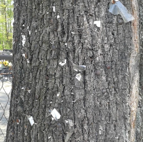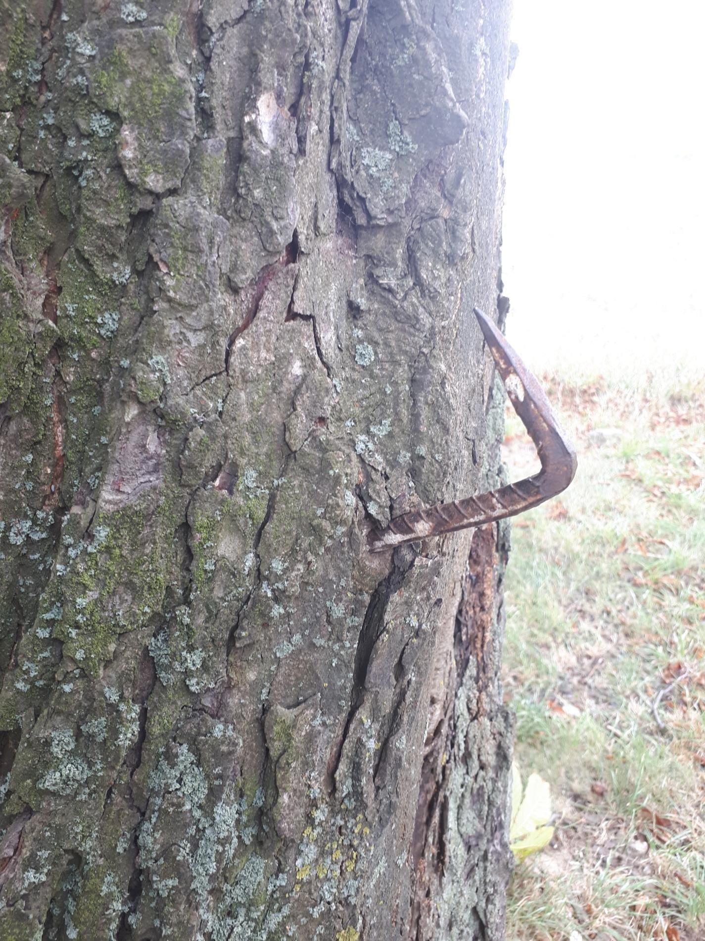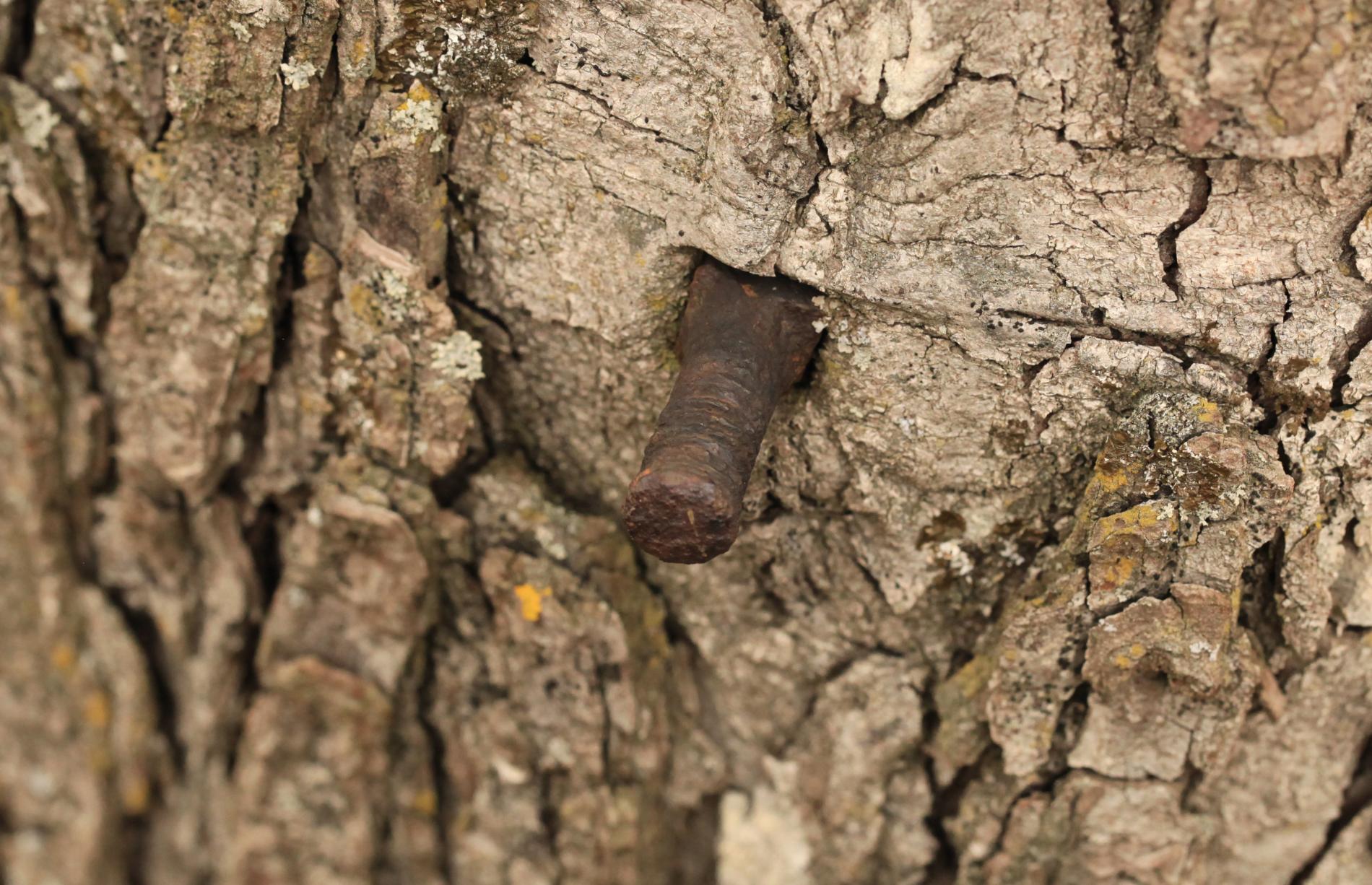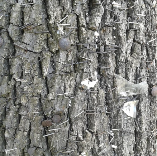 Bark damaged by carving names and initials, hammering nails, screwing in bolts, wrapping them with wires, and similar actions can lead to several distressing symptoms in trees. Discoloration of the bark, such as yellowing, browning, or blackening, often indicates infection or decay. Trees may begin to ooze sap or resin from the injured areas as they attempt to seal off the damage. The bark might peel away or develop cracks, exposing the inner wood and increasing vulnerability to pests and diseases.