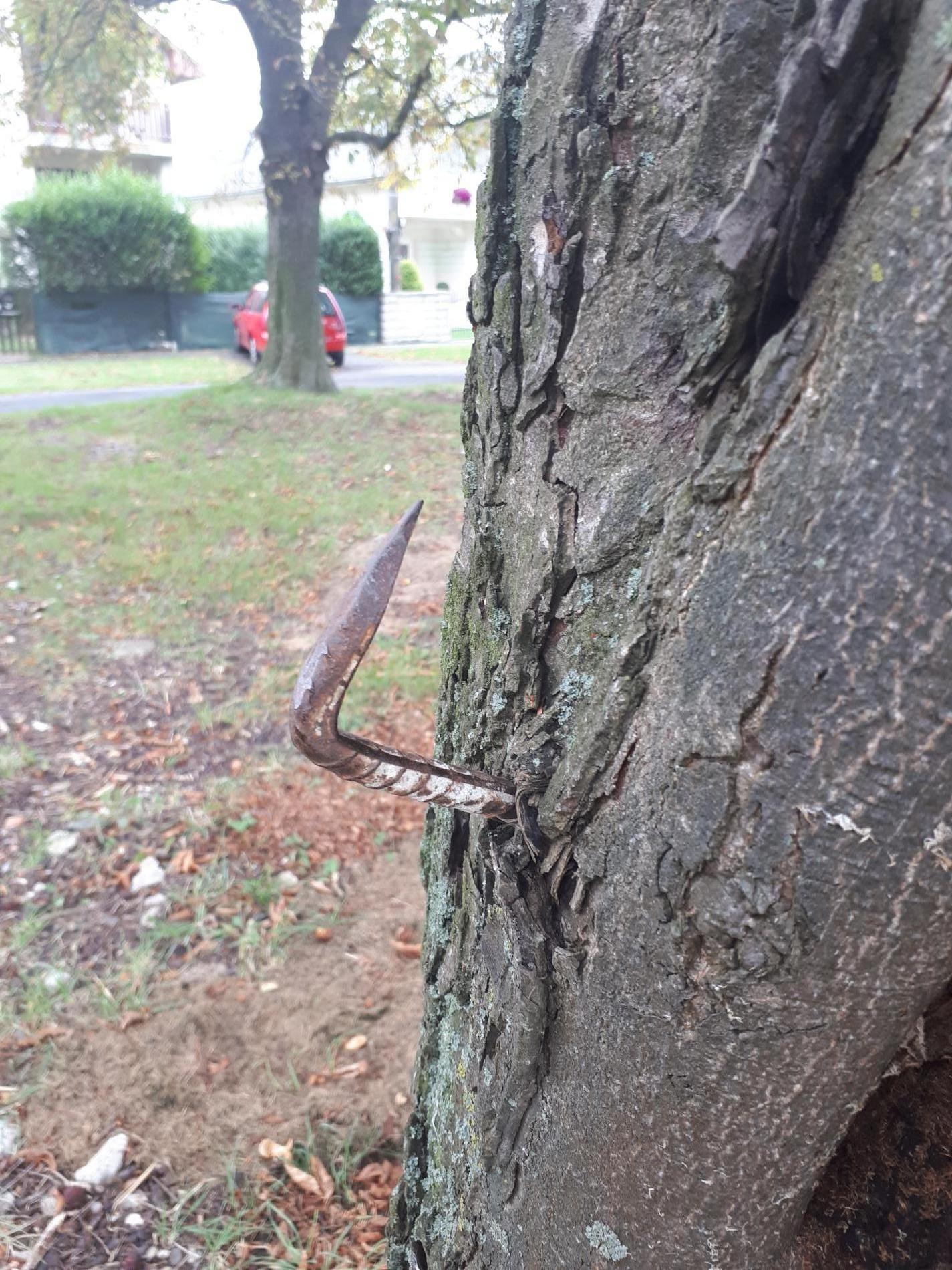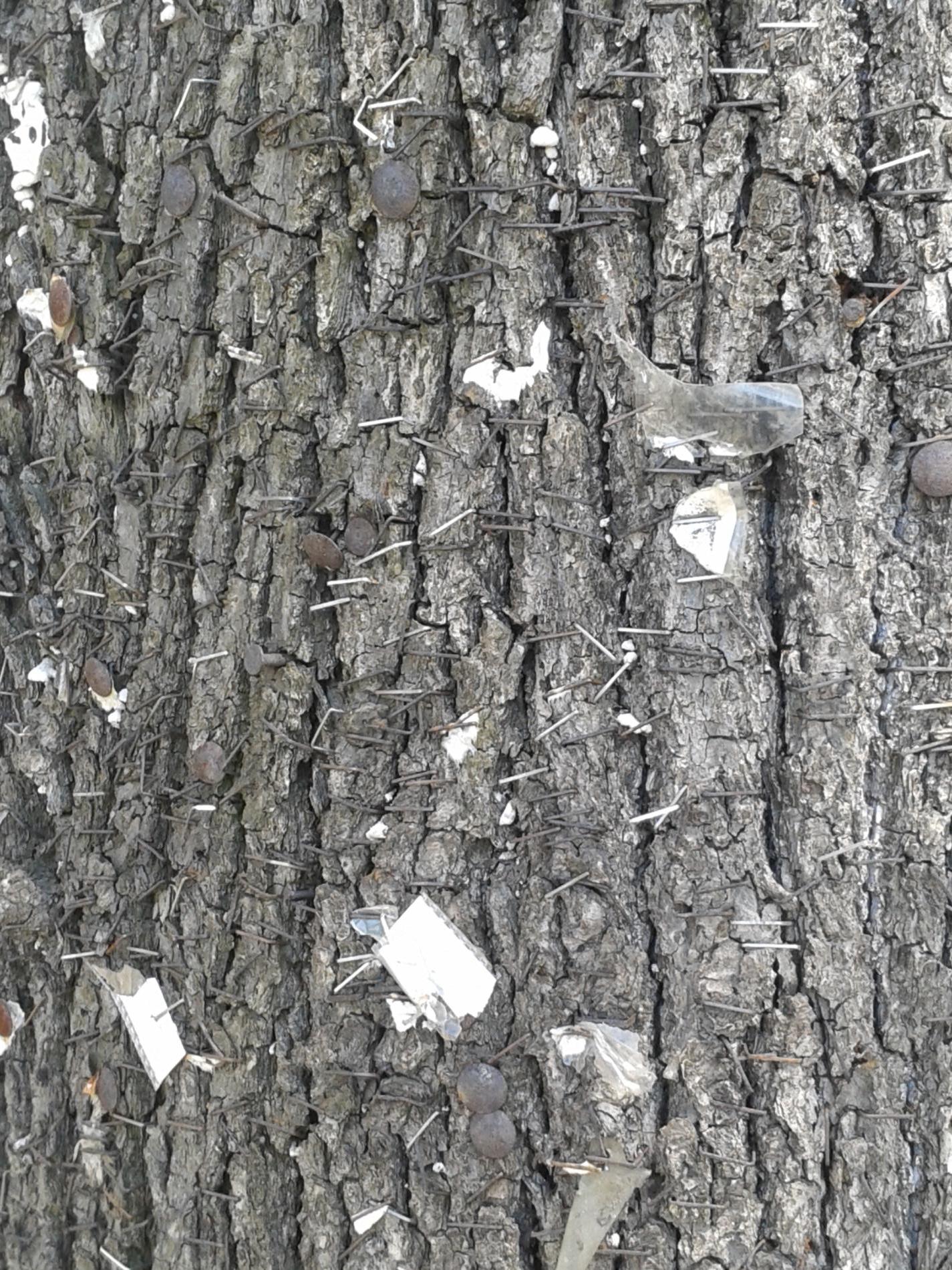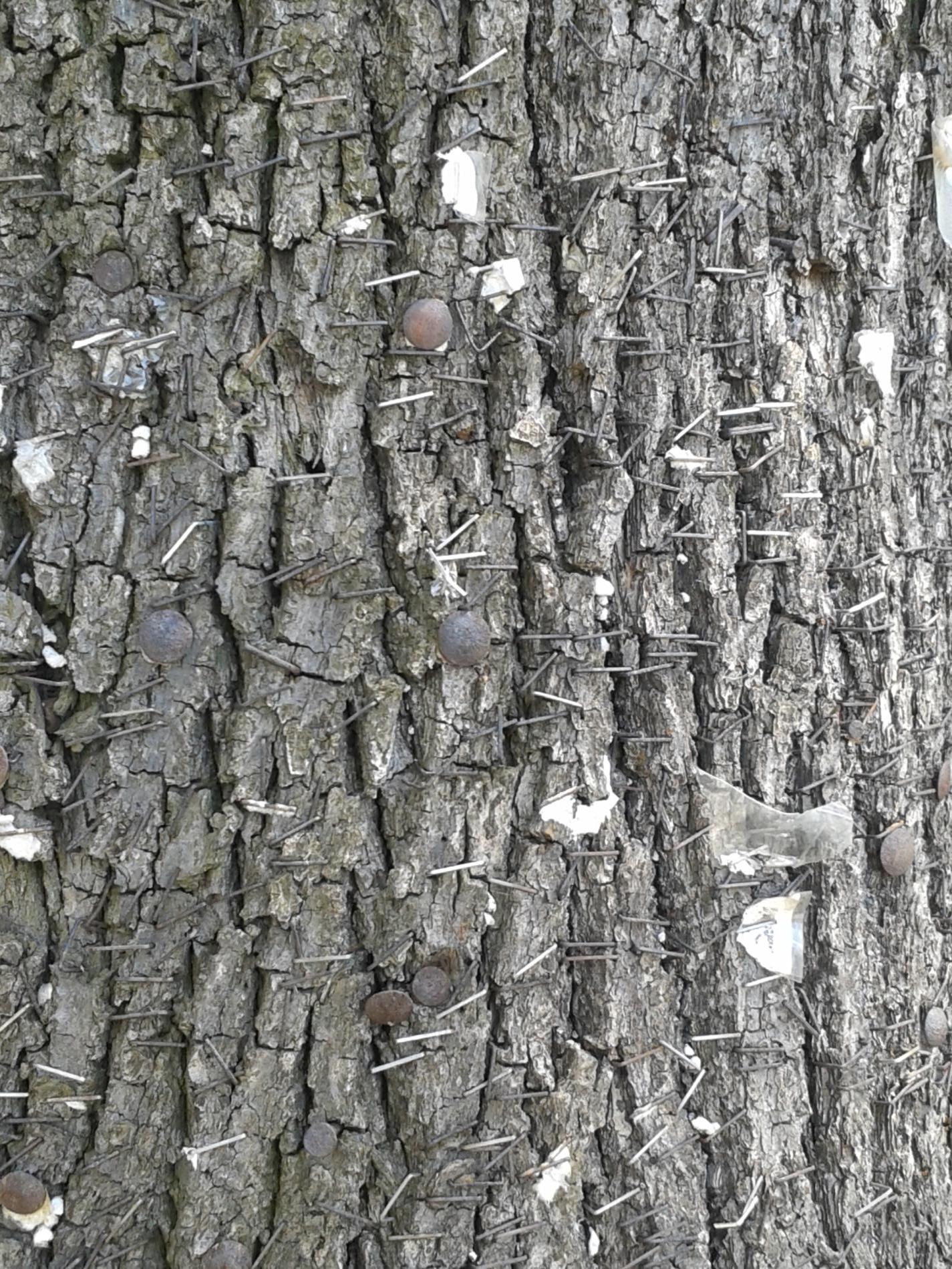 Bark damaged by carving names and initials, hammering nails, screwing in bolts, wrapping them with wires, and similar actions can lead to several distressing symptoms in trees. Discoloration of the bark, such as yellowing, browning, or blackening, often indicates infection or decay. Trees may begin to ooze sap or resin from the injured areas as they attempt to seal off the damage. The bark might peel away or develop cracks, exposing the inner wood and increasing vulnerability to pests and diseases.