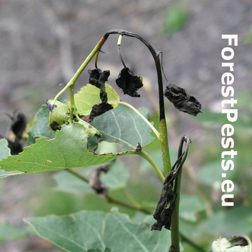 The first symptoms of the infection are black spots on leaves. In the course of spring and summer, the spots increase and join together, they cover the entire leaf and it wilts. Also infection of shoots develops similarly, they also wilt and bend. The infection appears in spring and its source are the infected shed leaves from the previous vegetation period  which overwinter on the ground under trees. During very wet spring, on the infected parts of leaves can appear an olive green exsudate containing fungus spores. Development and spreading of the spores is supported by cold and wet spring. Spreading of the disease slows down in warm and dry summer months.