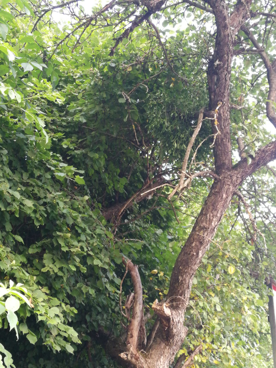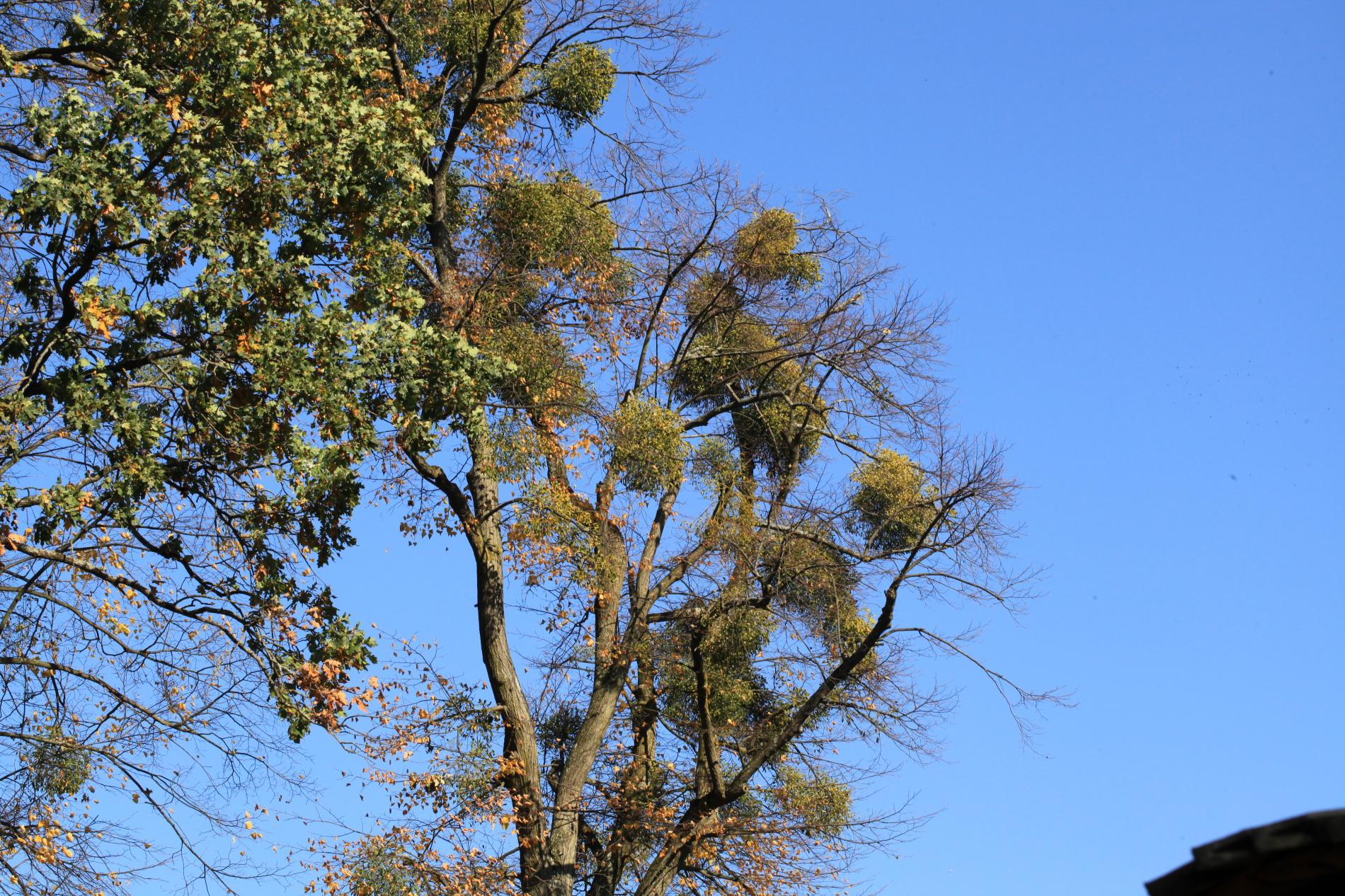 Parasitic plant in the crown. White fruits. Evergreen branches.