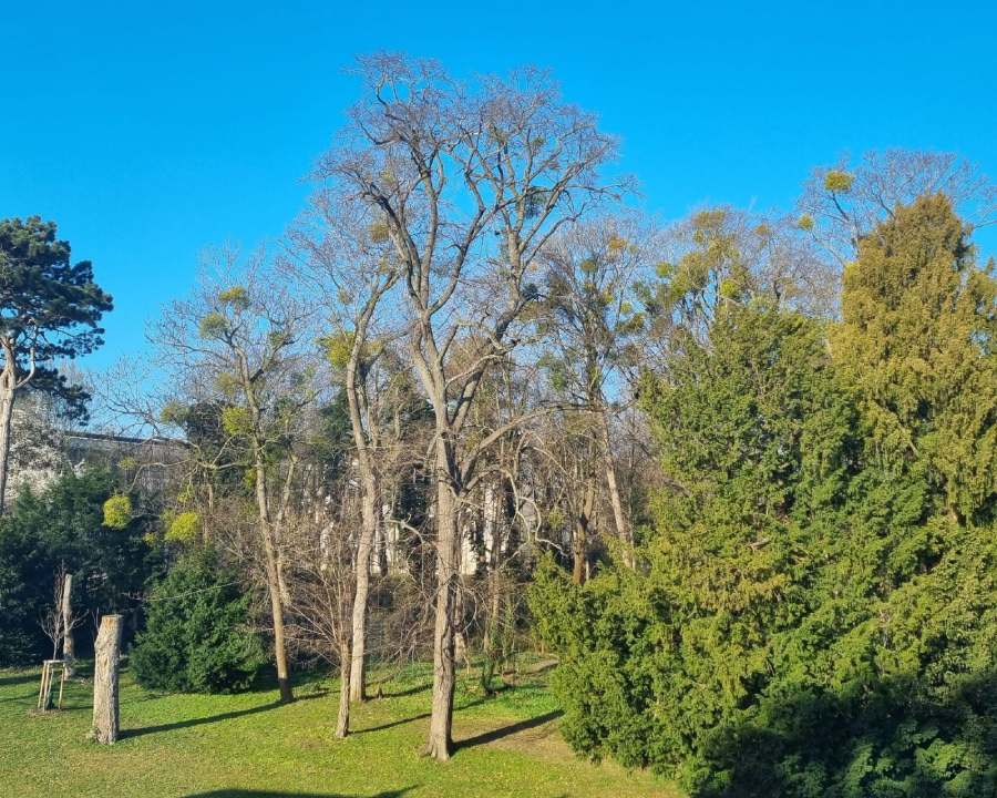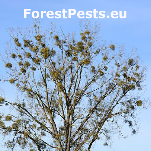 It is a semi-parasite, as it has a green part and can provide some nutrients by itself. However, it takes water and mineral substances from the host tree. European mistletoe has white fruits and leaves do not fall. The fruits are almost spherical, false berries of white color. The fruit contains a milky mucilaginous sticky pulp and one seed. Its evergeen branches are used as a decoration for Christmas in some countries of Europe. It often grows on apple trees, poplars, firs, oaks and other trees. A similar species is Yellow mistletoe (Loranthus europaeus), which you can find mostly on deciduous trees, especially oaks. Striking especially after leaf fall (it is a deciduous species) with lots of yellow fruits.