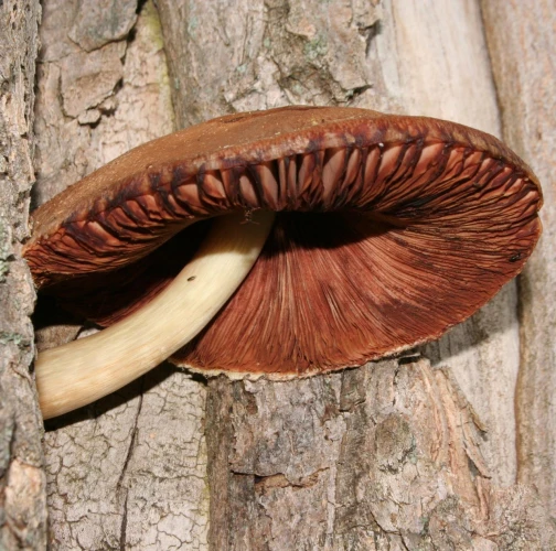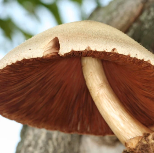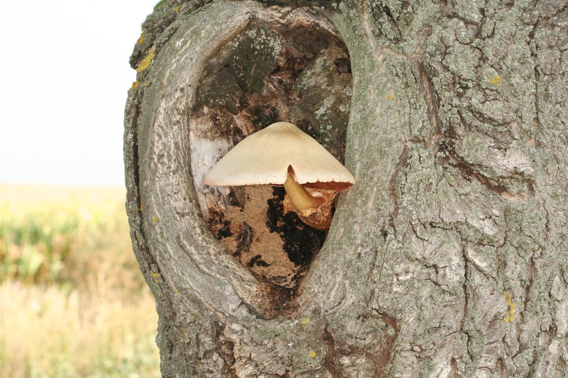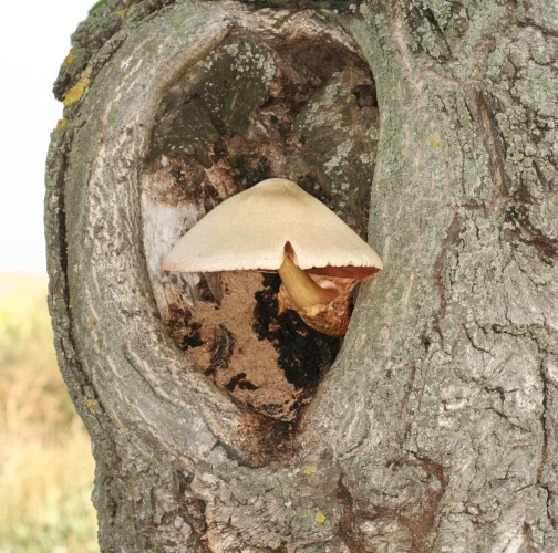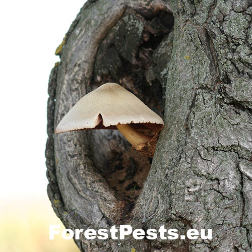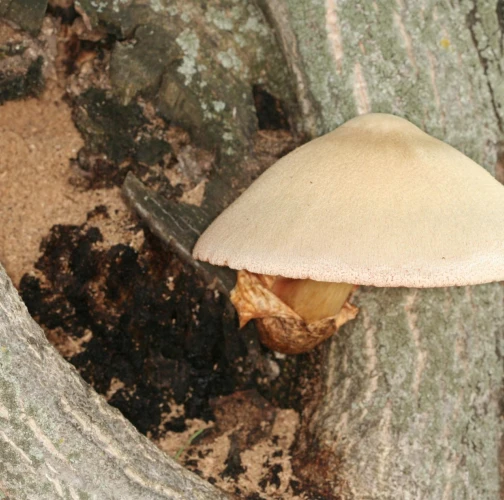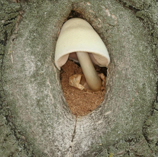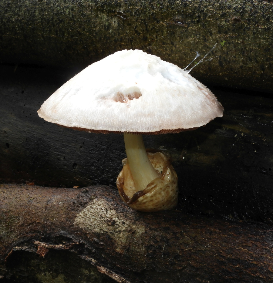 Cap is 5–20 cm across, ovate then bell-shaped, whitish, covered in long, fine, yellowish, silky, almost hair-like fibres. Stem is 70–150 × 10–20 mm, often curved, tapering upwards from the bulbous base; volva membranous, large, and persistent, somewhat viscid, white at first discolouring to dingy brown. White flesh yellows faintly with time. Tastes slight, smell pleasant, like that of bean sprouts. Gills are crowded, white at first then flesh-pink. Spores are print pink. Spores are elliptic, 8.5–10 × 5–6 μm. It grows on dead frondose trees, maple, elm, and others, often in knot-holes or hollow trunks. It can be found from early summer to autumn.