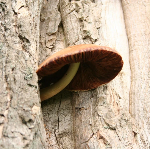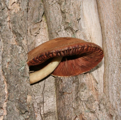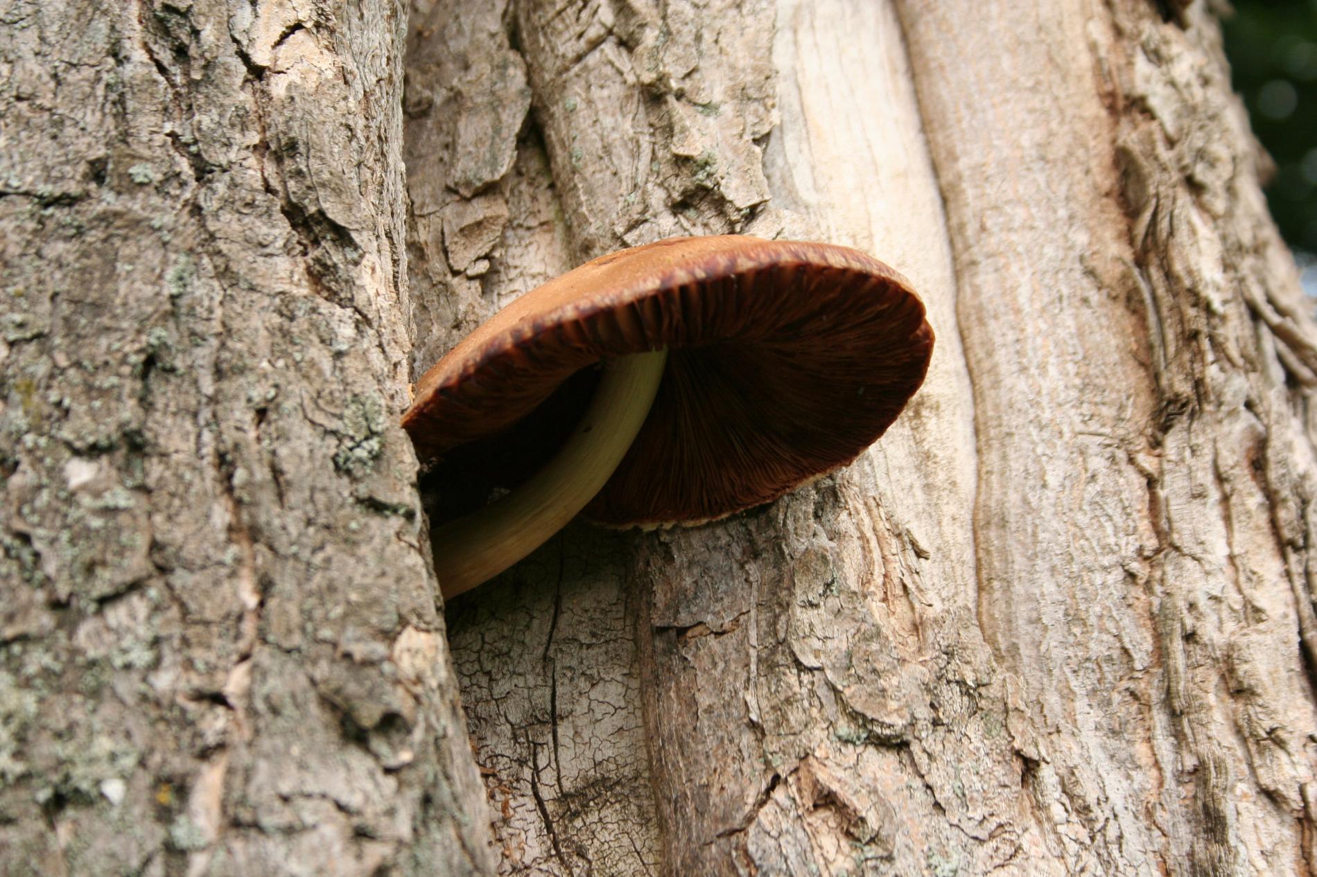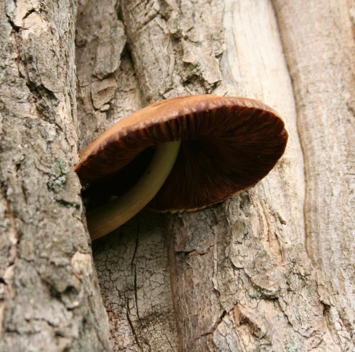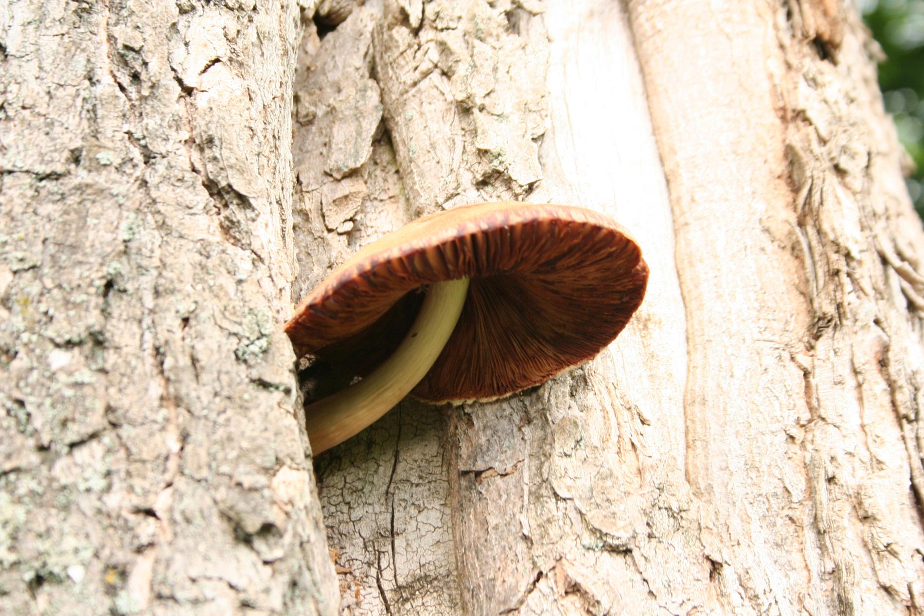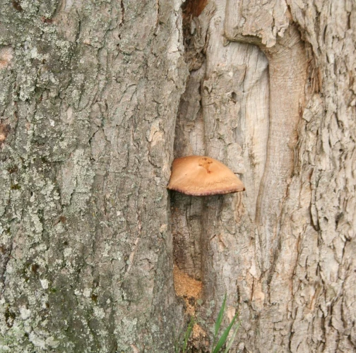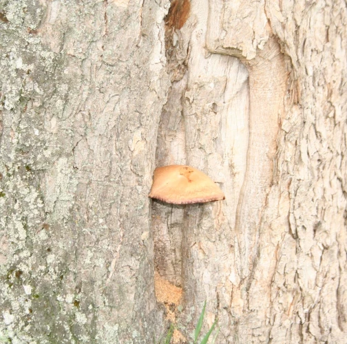 Cap is 5–20 cm across, ovate then bell-shaped, whitish, covered in long, fine, yellowish, silky, almost hair-like fibres. Stem is 70–150 × 10–20 mm, often curved, tapering upwards from the bulbous base; volva membranous, large, and persistent, somewhat viscid, white at first discolouring to dingy brown. White flesh yellows faintly with time. Tastes slight, smell pleasant, like that of bean sprouts. Gills are crowded, white at first then flesh-pink. Spores are print pink. Spores are elliptic, 8.5–10 × 5–6 μm. It grows on dead frondose trees, maple, elm, and others, often in knot-holes or hollow trunks. It can be found from early summer to autumn.