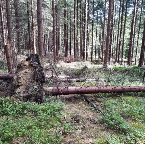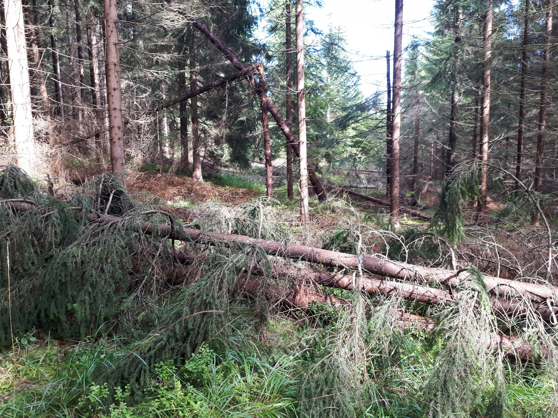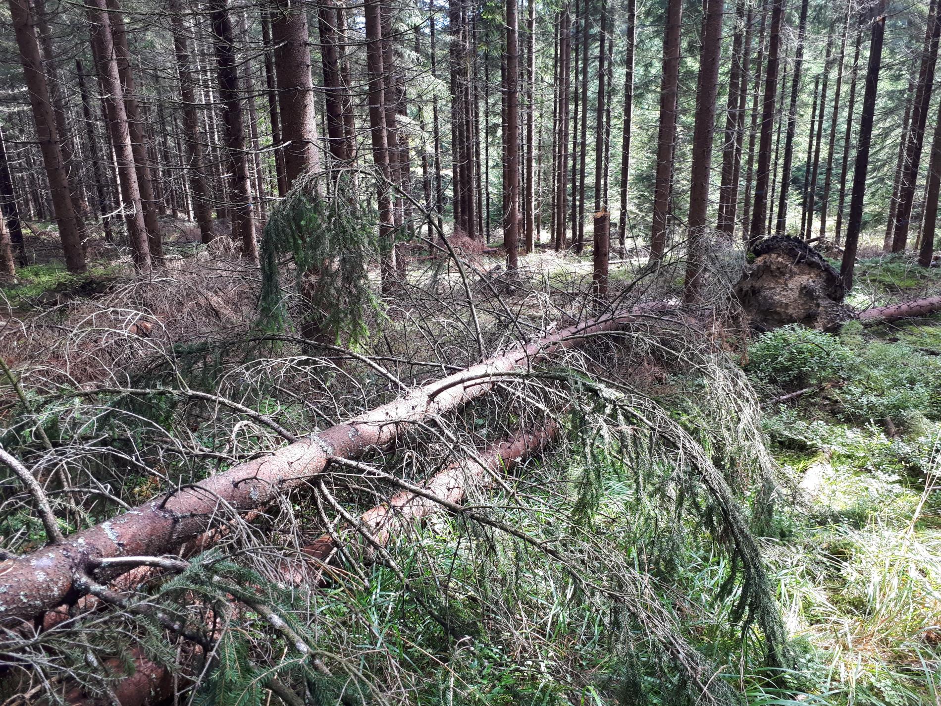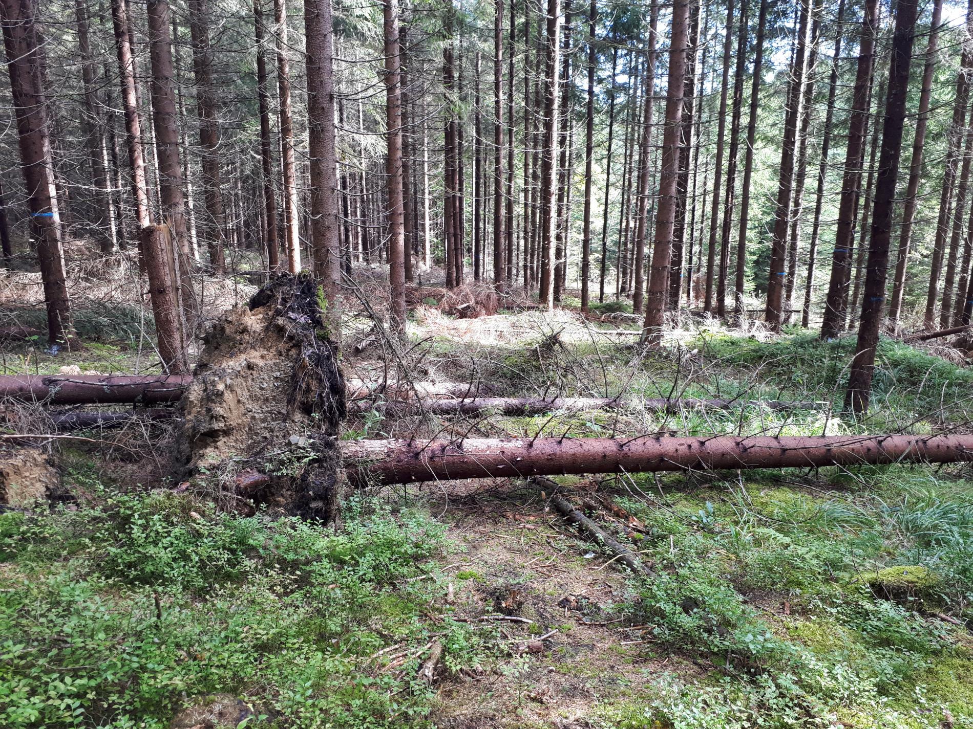 The most endangered species by wind is Norway spruce, especially mono-cultural plantations with low stability, over-dense stands with short crowns, slender and high stems. Besides Norway spruce, silver fir and European beech are also endangered. Most uprooted trees occur under the conditions of permanently or temporary wet soils.
