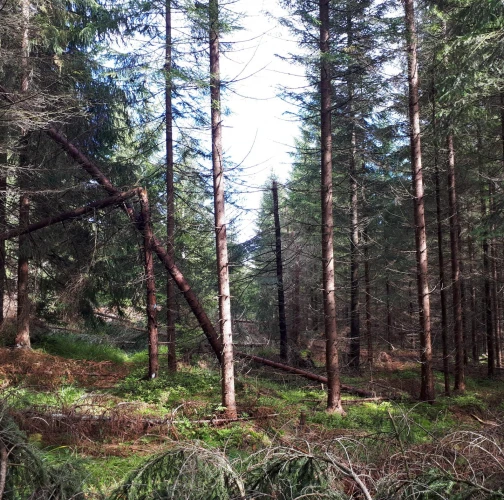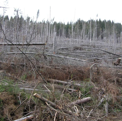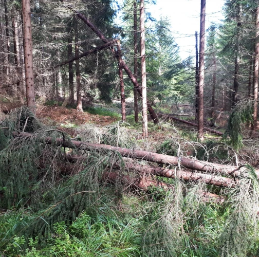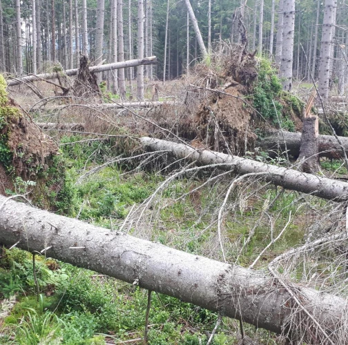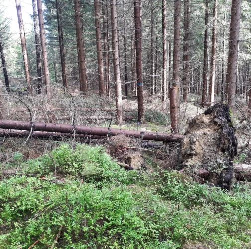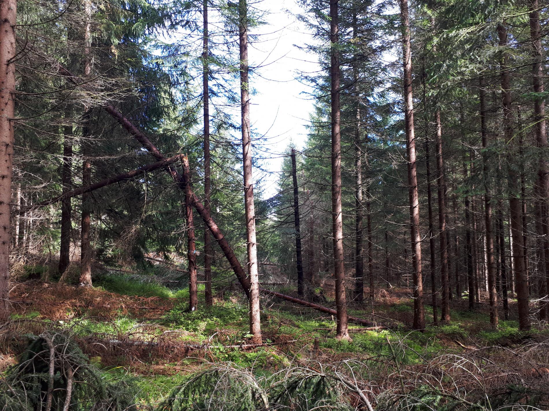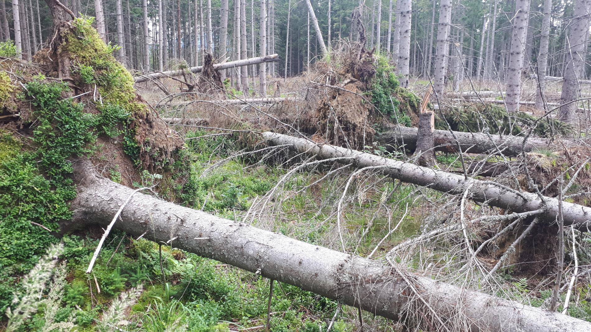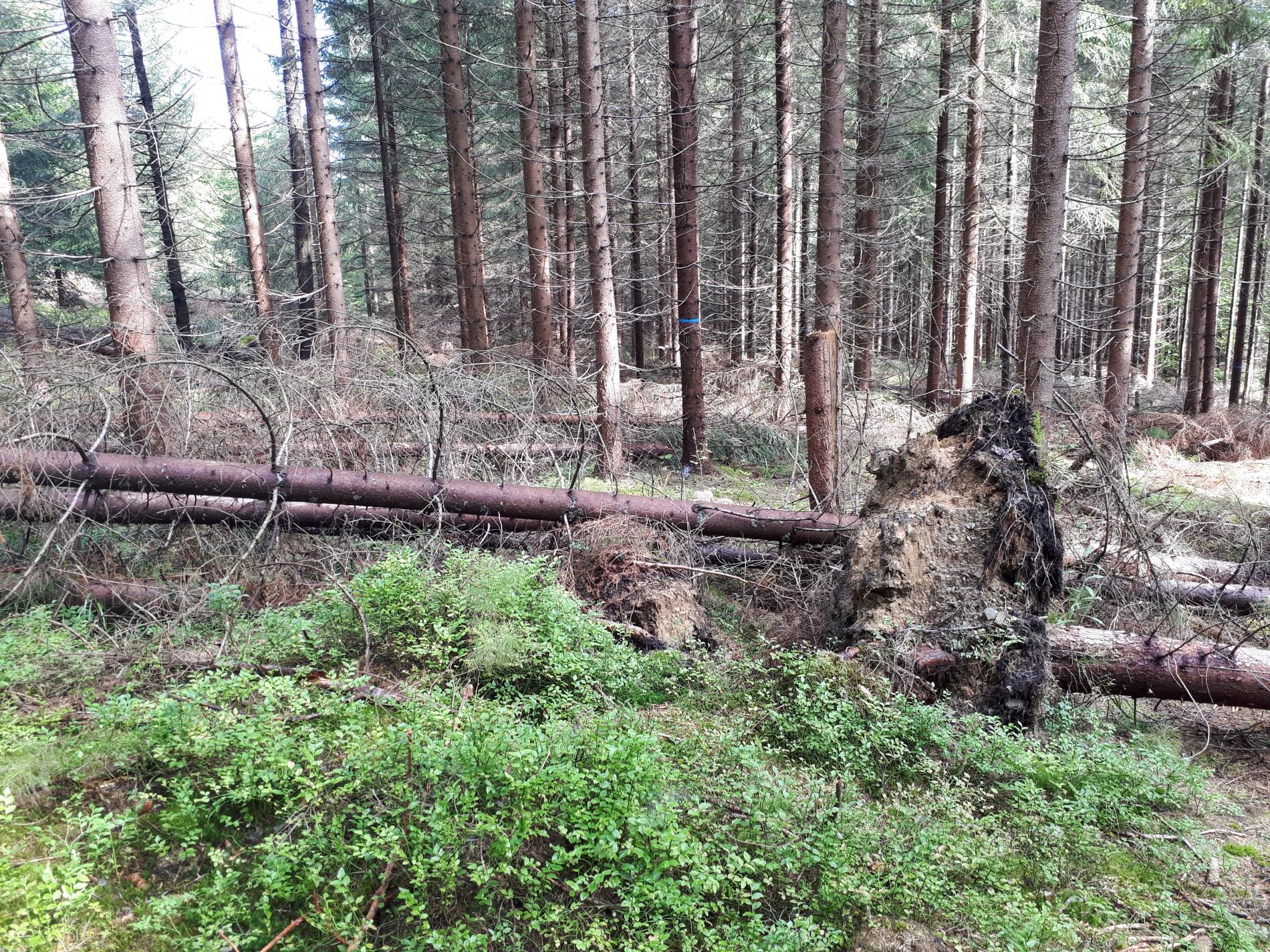 The most endangered species by wind is Norway spruce, especially mono-cultural plantations with low stability, over-dense stands with short crowns, slender and high stems. Besides Norway spruce, silver fir and European beech are also endangered. Most uprooted trees occur under the conditions of permanently or temporary wet soils.