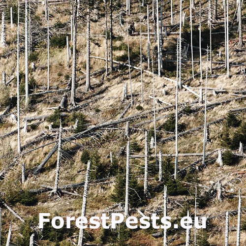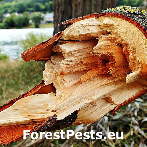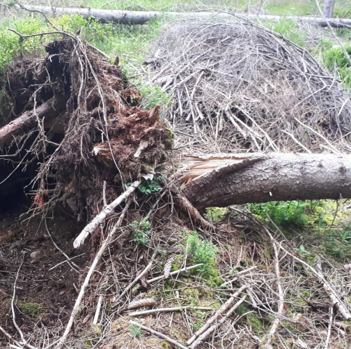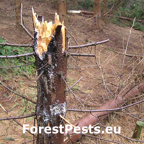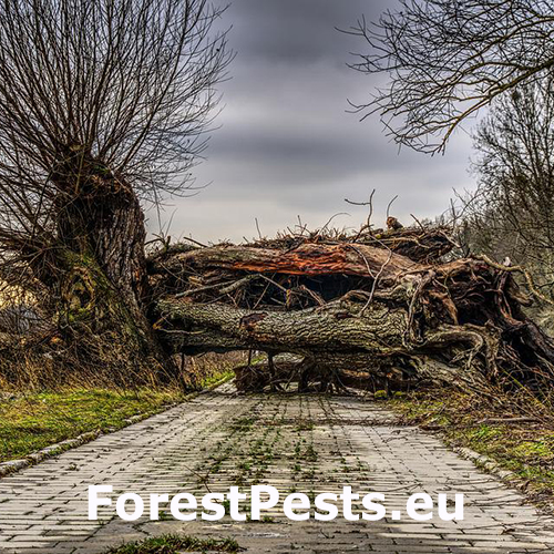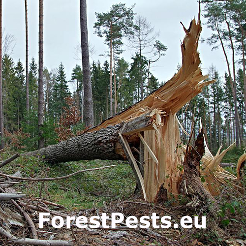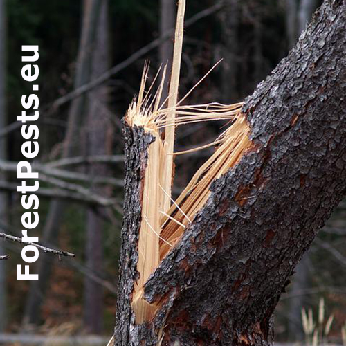 Wind casus tree uproots, stem breaks, branch breaking. Wind damage in stands arise individually, in groups as well as in entire, often large, areas. Extend and intensity of wind damage depends on the wind speed as well as stability of forest stands. At lower altitudes, dry winds cause wilting and subsequent loss of assimilative organs, especially in young forest stands.