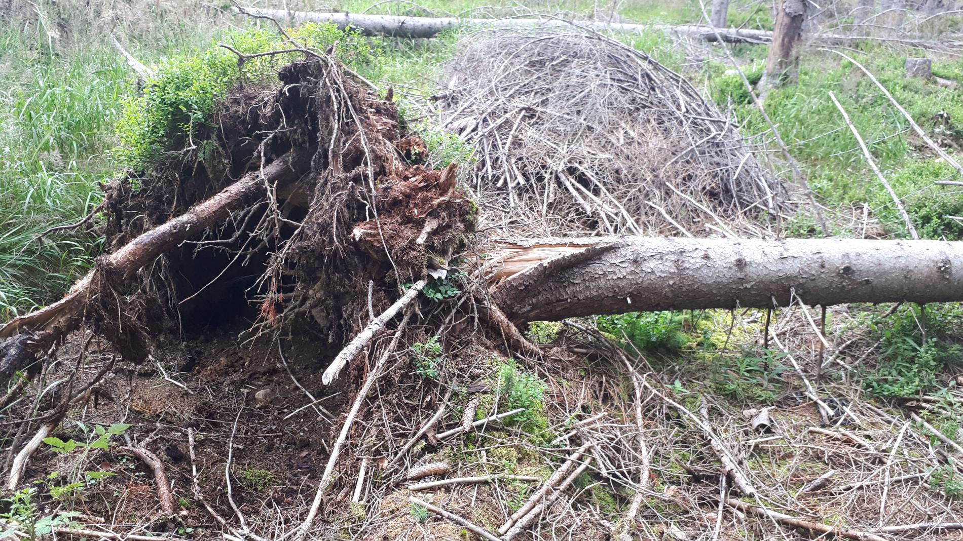 The wind causes both uprooting and breakages. The ratio of uprooted and broken trees is mainly related to the actual anchoring of root systems in the soil. In the winter, when the soil is frozen and the roots are well fixed in the ground, mostly stem breakages occur. In general, however, uprooting prevails over breakage (ratio mostly between 2:1 and 3:1).