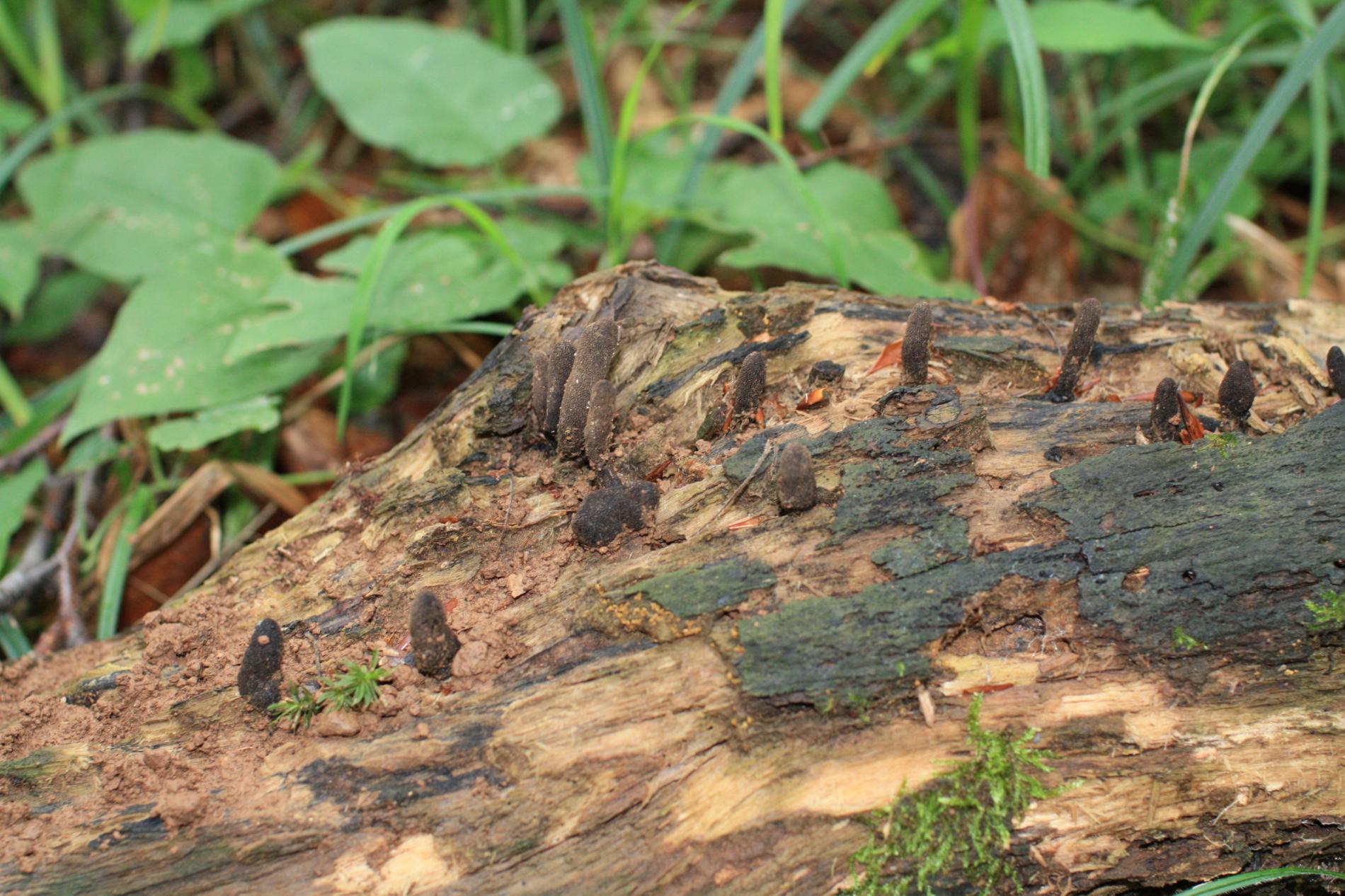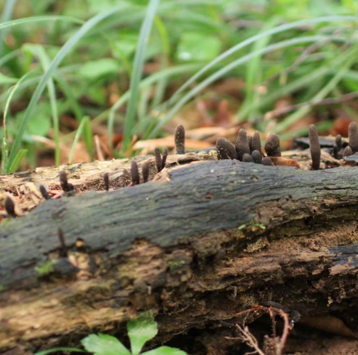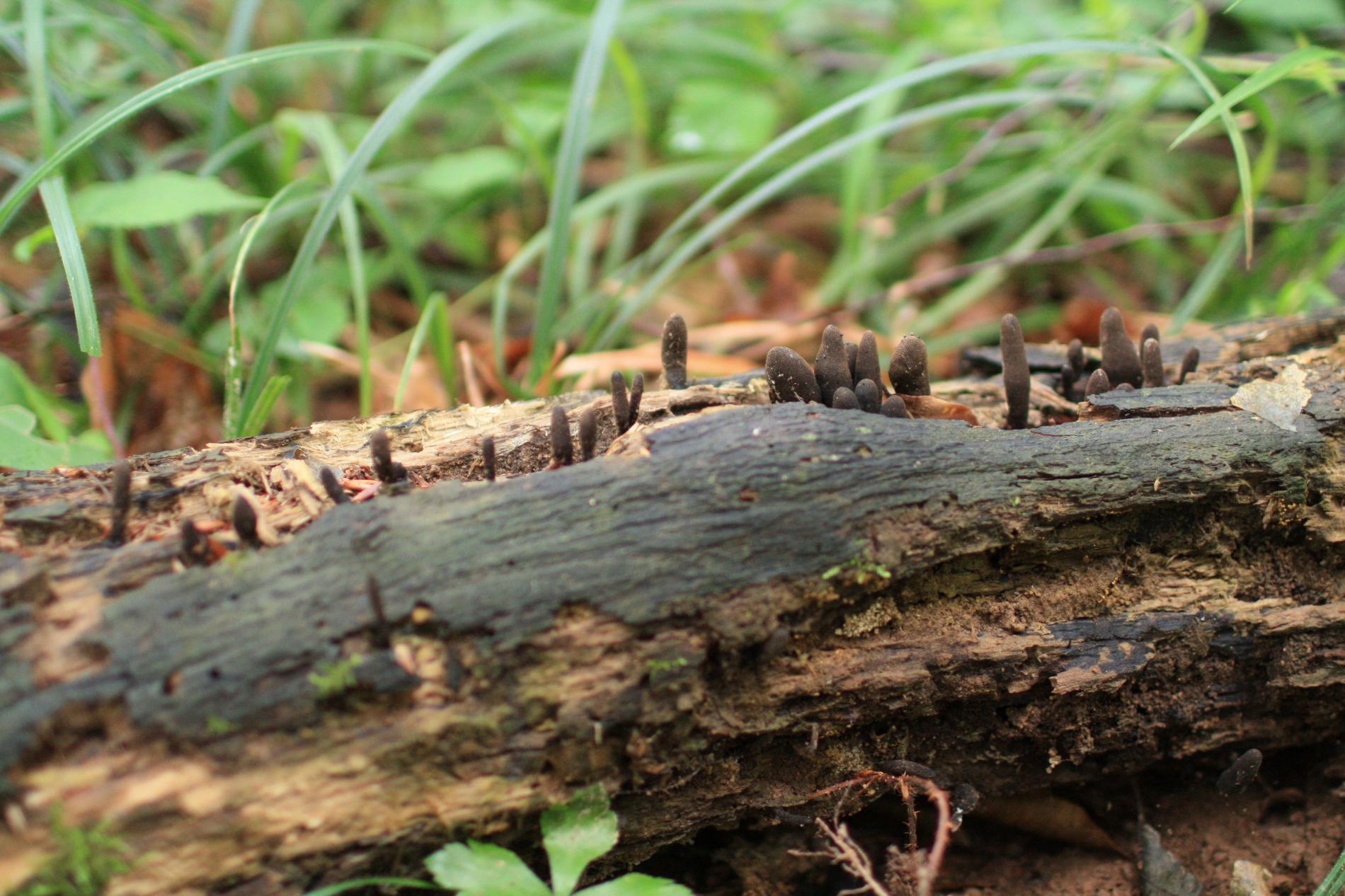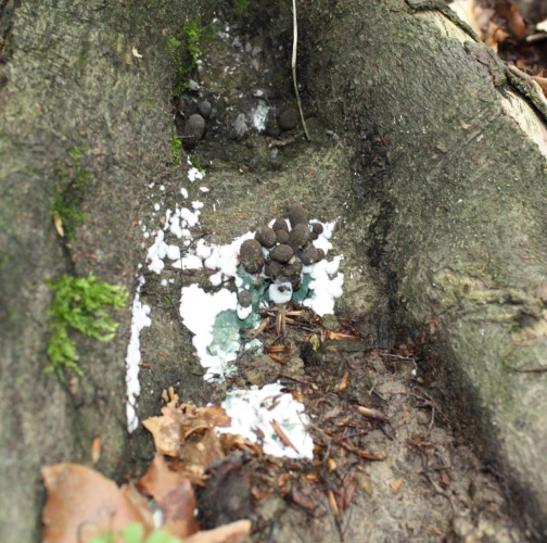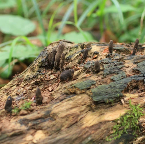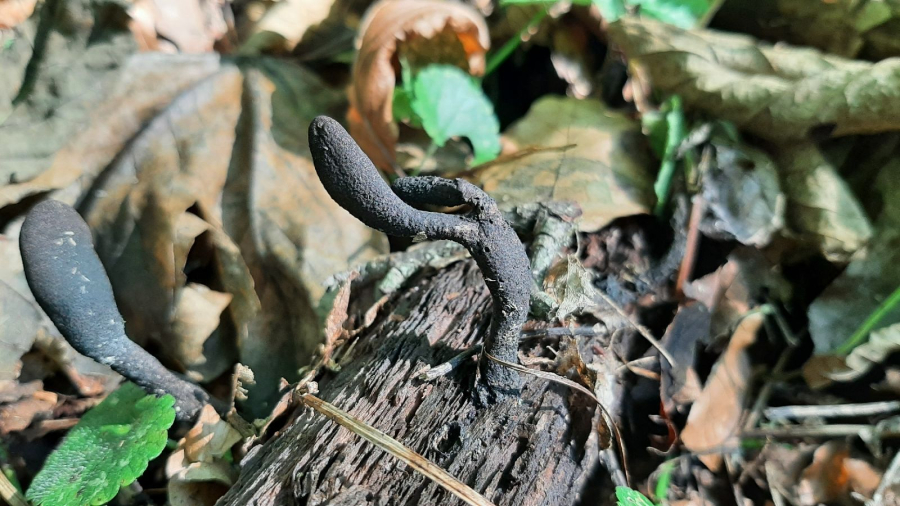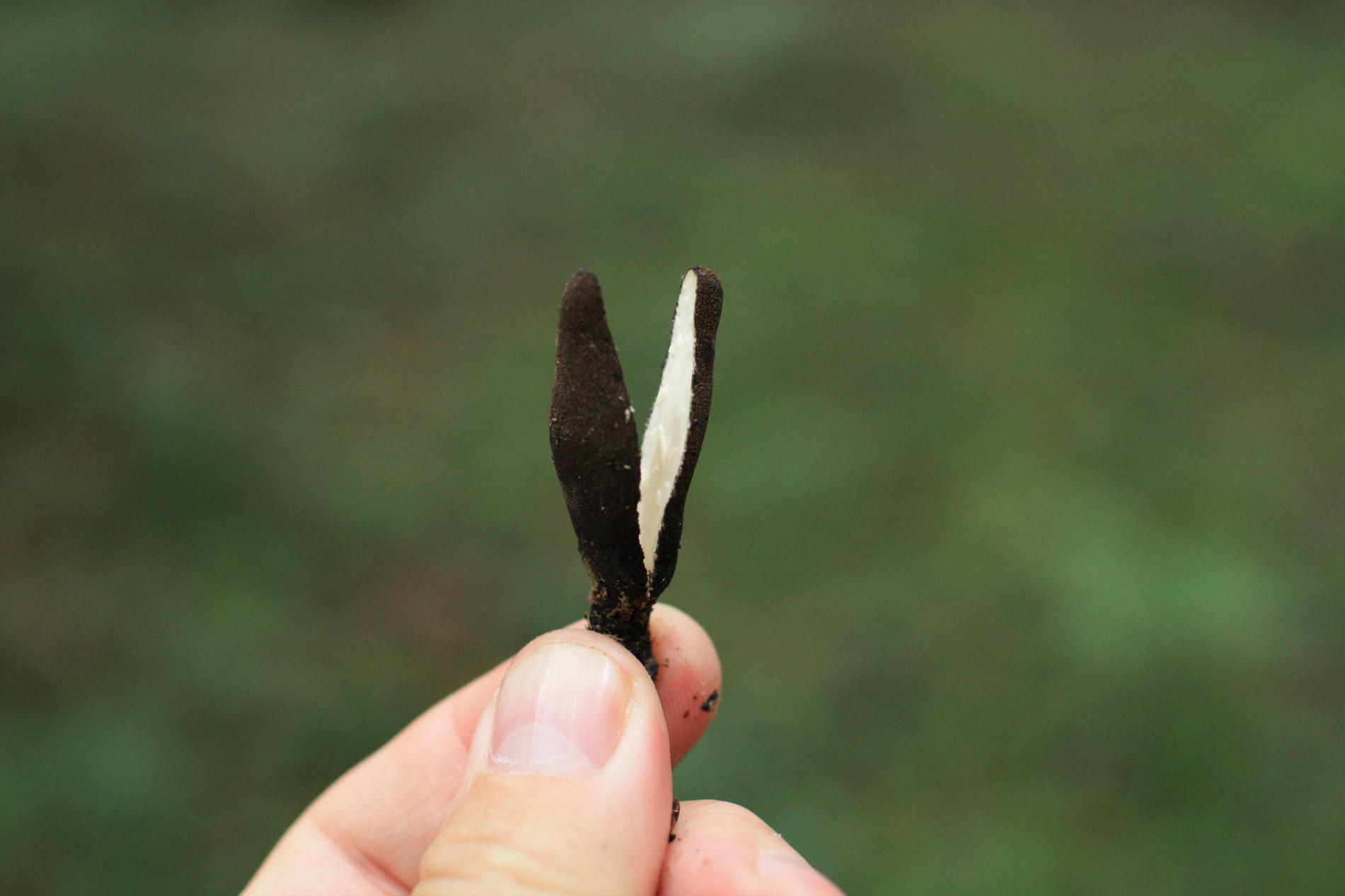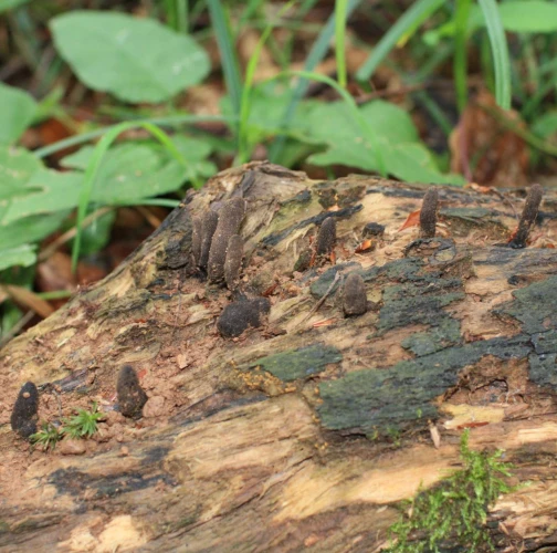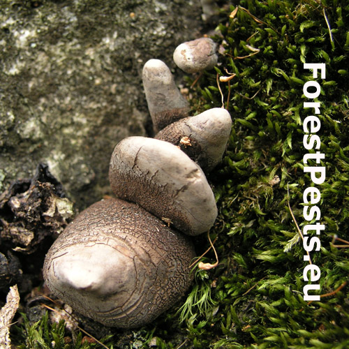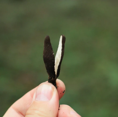 The shape of the fruiting bodies and formation of distinctive clumps on root swellings or on thicker roots contributed to the fungus’ common name “dead man’s fingers”. The term “xylaria”, freely translated, means “growing on wood”, while “polymorpha” stands for “many shapes”. In spring the entire face of the pileus is white due to formation of conidia, while in summer tiny perithecia chambers with asci and ascospores are coated with a black cover. The stroma flesh is white. The influence of mycelium results in the so-called black root rot after consumption of glucane in wood, leaving a residue of lignin and cellulose.