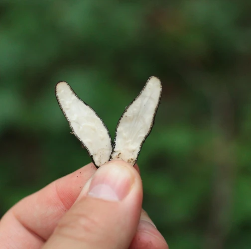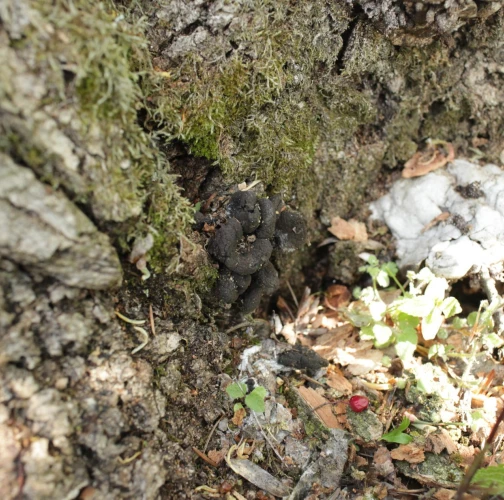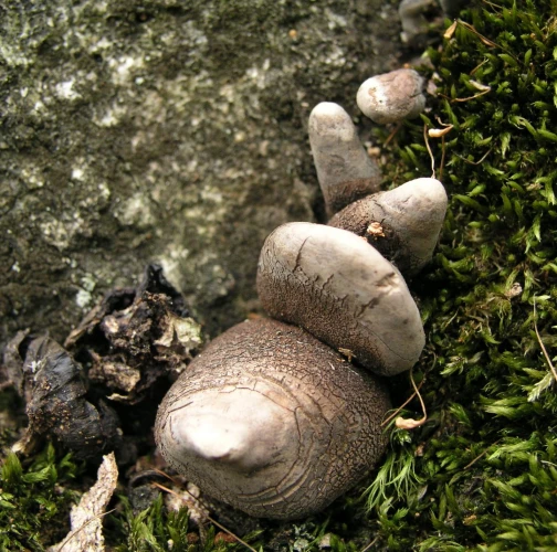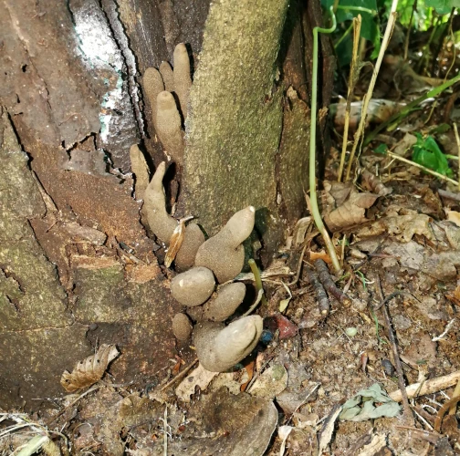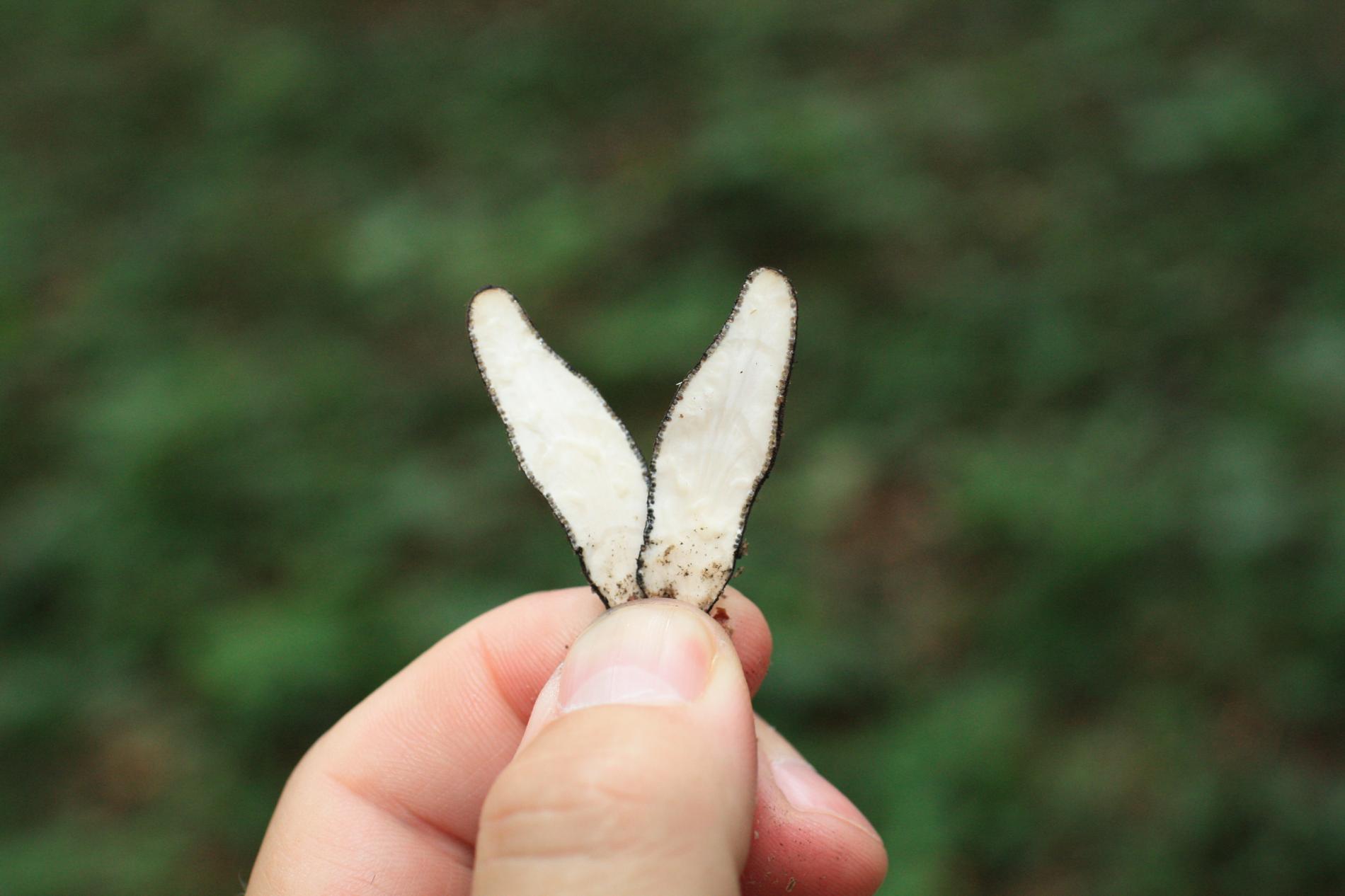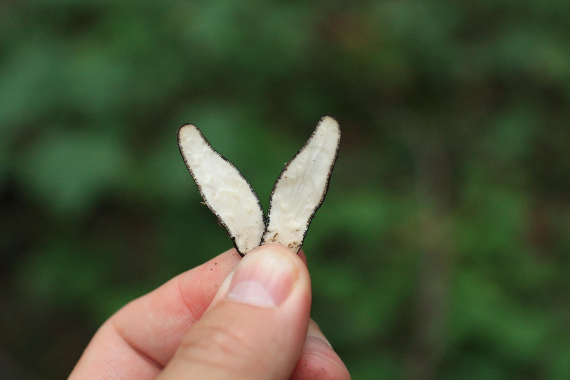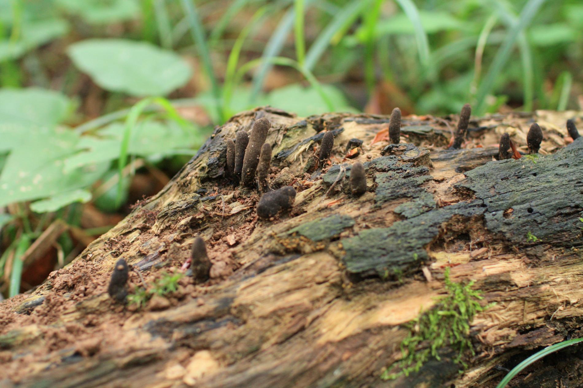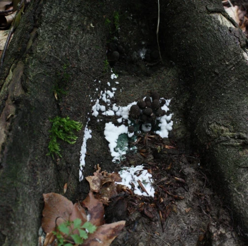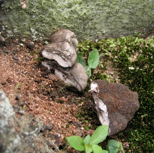 The shape of the fruiting bodies and formation of distinctive clumps on root swellings or on thicker roots contributed to the fungus’ common name “dead man’s fingers”. The term “xylaria”, freely translated, means “growing on wood”, while “polymorpha” stands for “many shapes”. In spring the entire face of the pileus is white due to formation of conidia, while in summer tiny perithecia chambers with asci and ascospores are coated with a black cover. The stroma flesh is white. The influence of mycelium results in the so-called black root rot after consumption of glucane in wood, leaving a residue of lignin and cellulose.