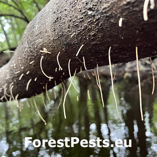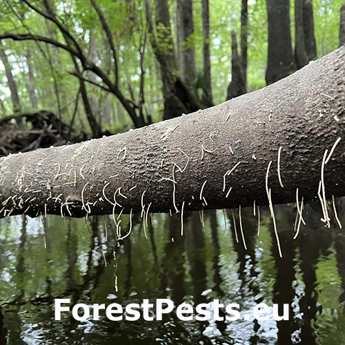 Ambrosia beetles generally attack stressed or damaged trees, not healthy ones. Infested trees may show signs of weakening, wilting, branch dieback, and even death. Young seedlings can also be attacked, often being girdled at the root collar, leading to rapid death. Infested plum trees (Prunus) often produce excessive liquid around attacked area. In the U.S., Xylosandrus crassiusculus causes significant damage in orchards, particularly after overwatering or late frosts. Urban and park trees, as well as forest nurseries, are also frequently affected.