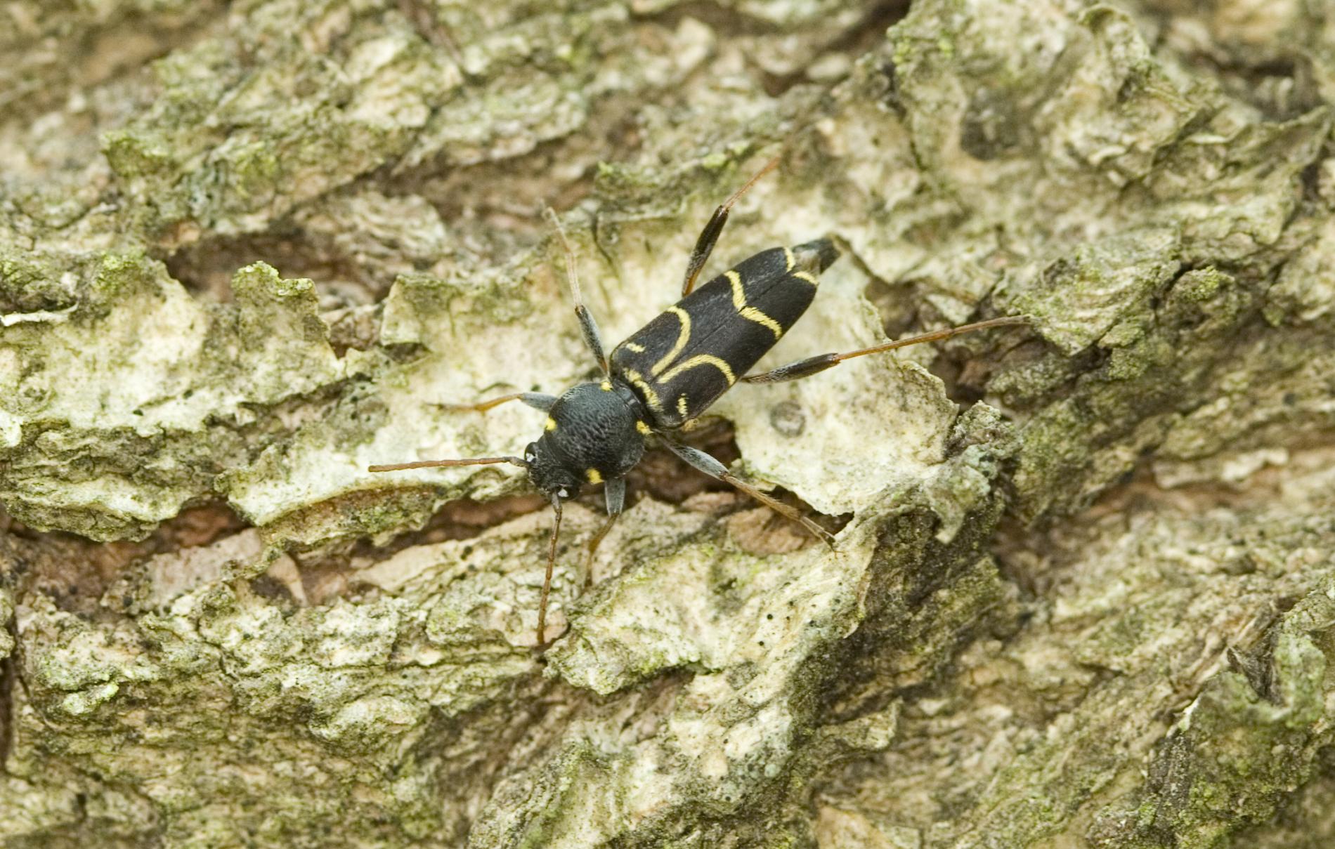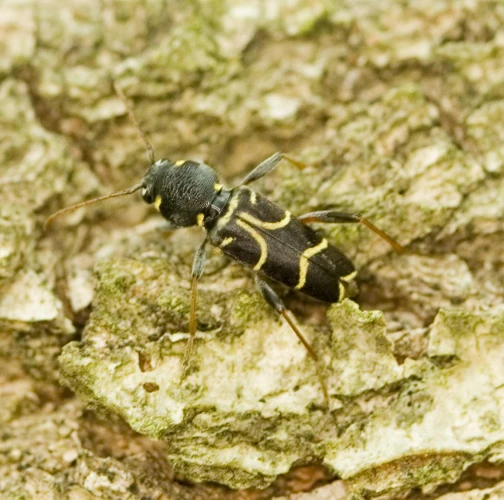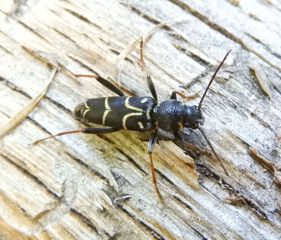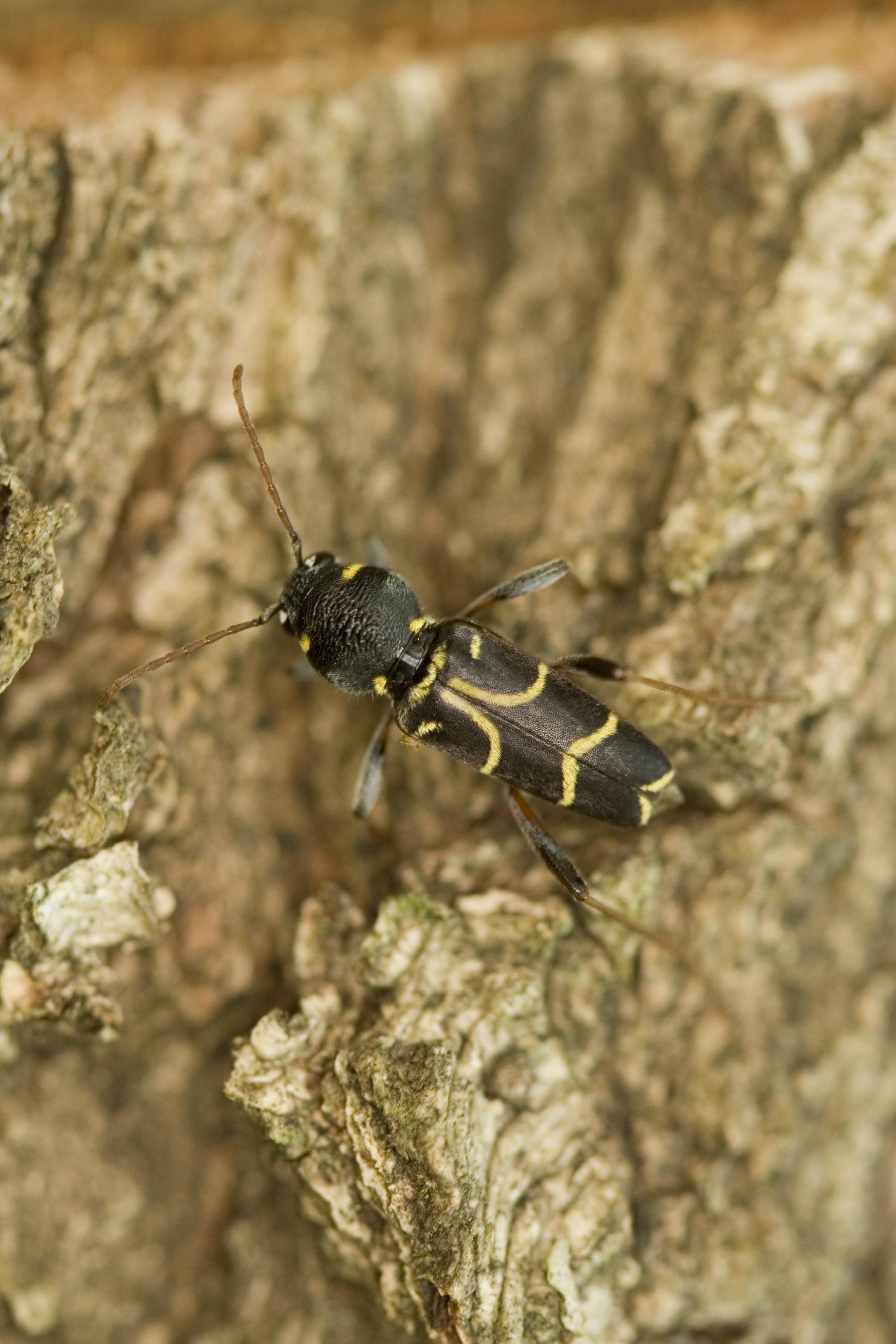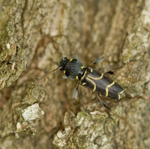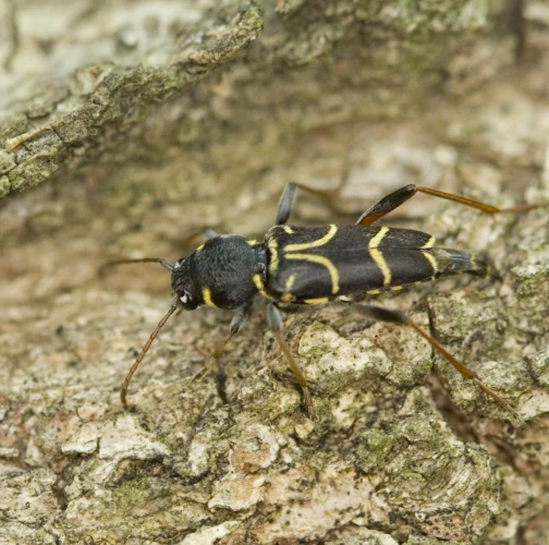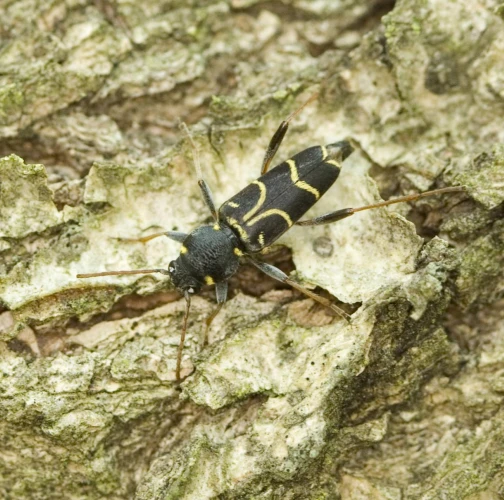 Long-horned beetle Xylotrechus antilope is a fascinating beetle species. It typically measures around 12 to 15 mm in length. This beetle stands out with its distinctive brown elytra adorned with narrow, yellow stripes. These adult beetles are active from May to August, and they can be commonly found on oak logs, fallen or felled trees, as well as dead or dying standing host trees. During the reproductive phase, females lay their eggs on the bark of oak trees. The eggs are carefully placed in small clusters on the tree's surface. Following this stage, the larvae hatch and begin their development under the tree's bark. The larval stage of the Xylotrechus antilope lasts for two years. Localy common species. Prefers oaks (Quercus spp.)