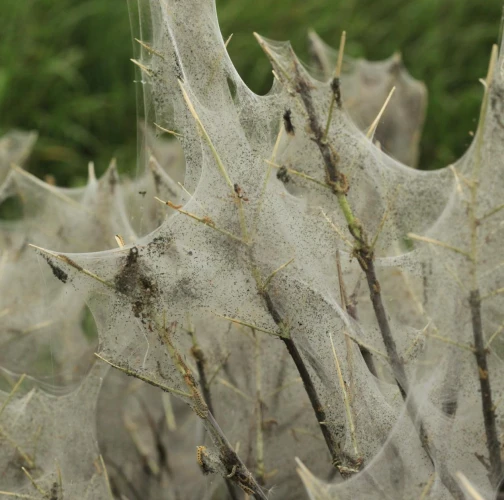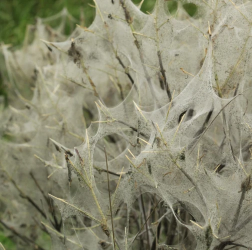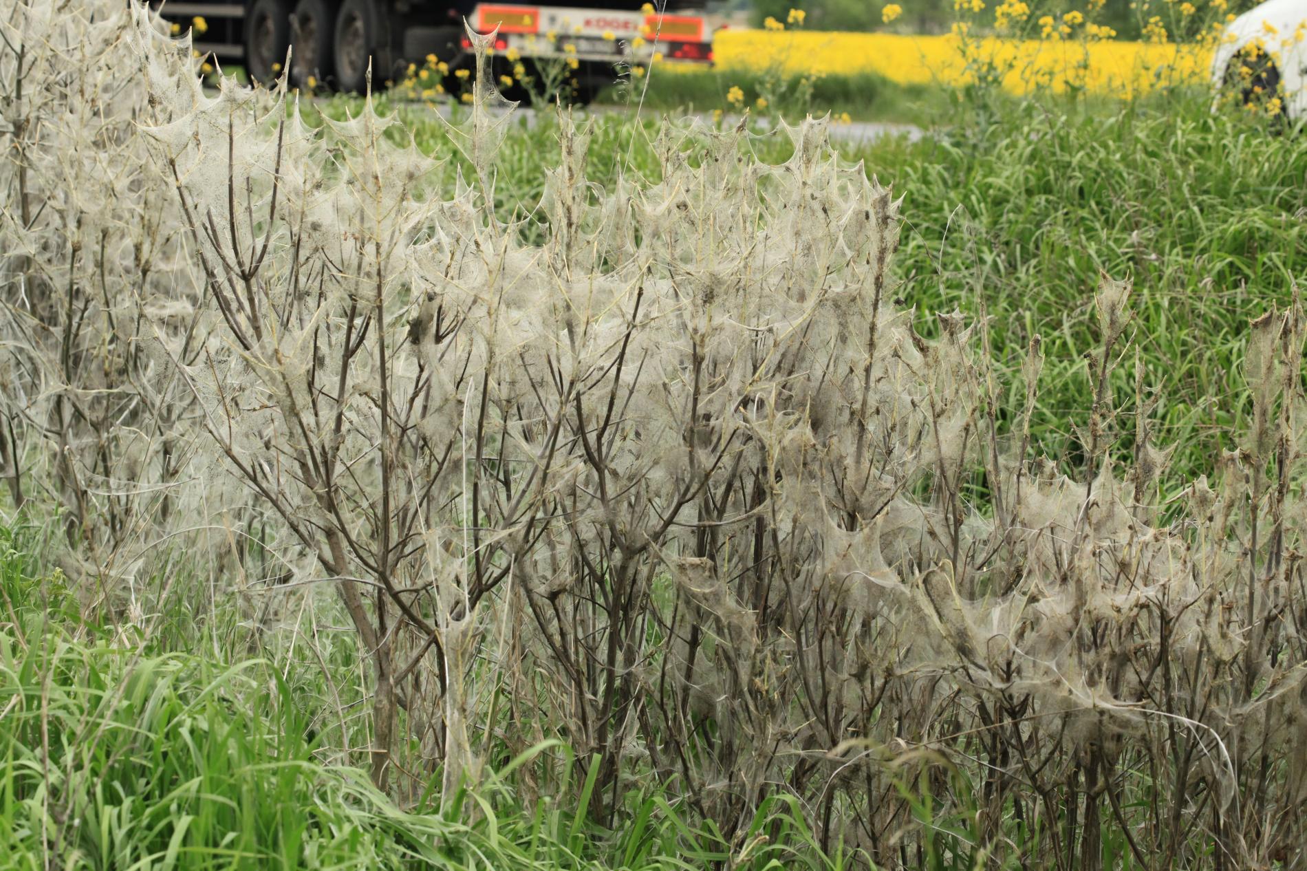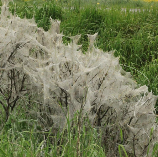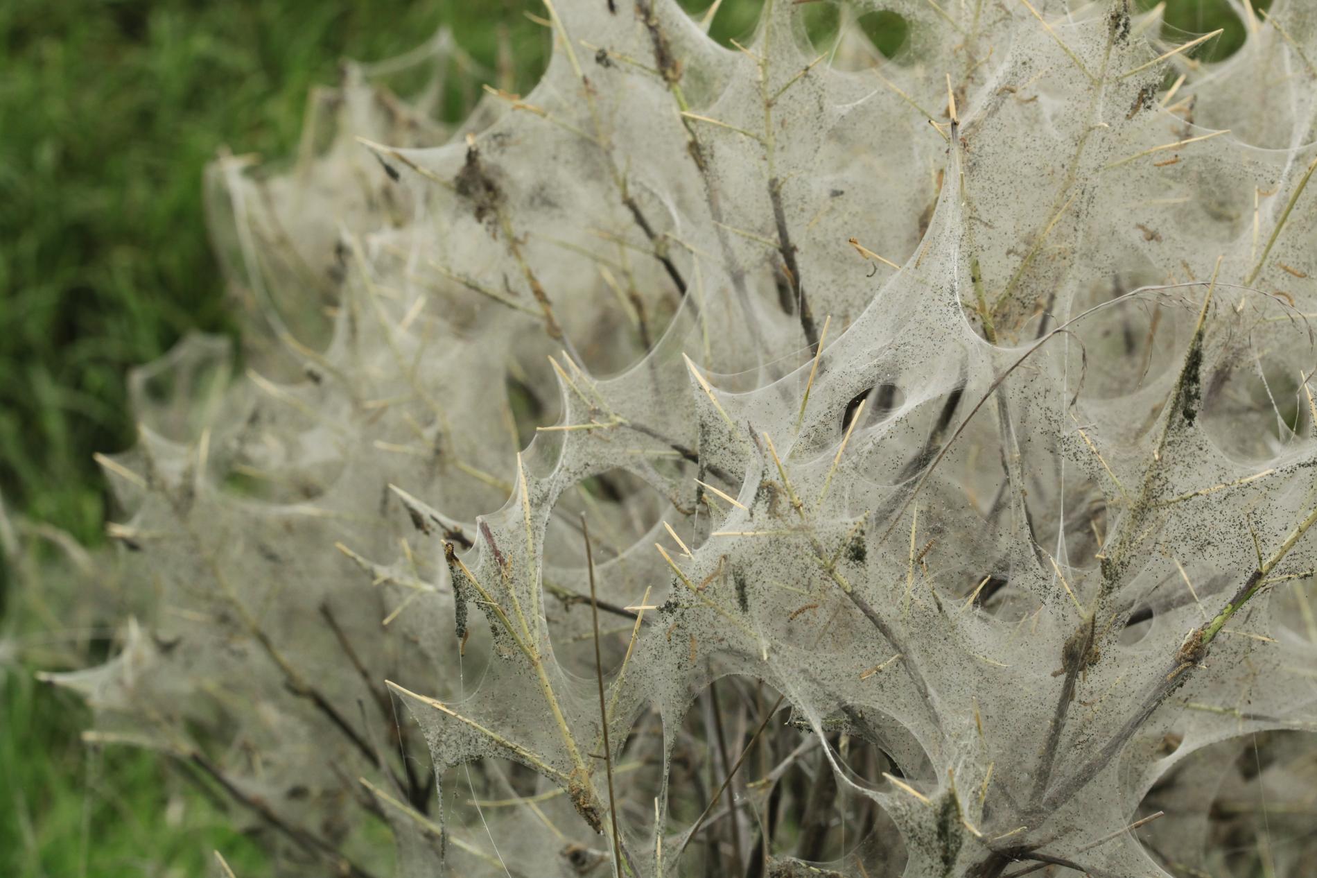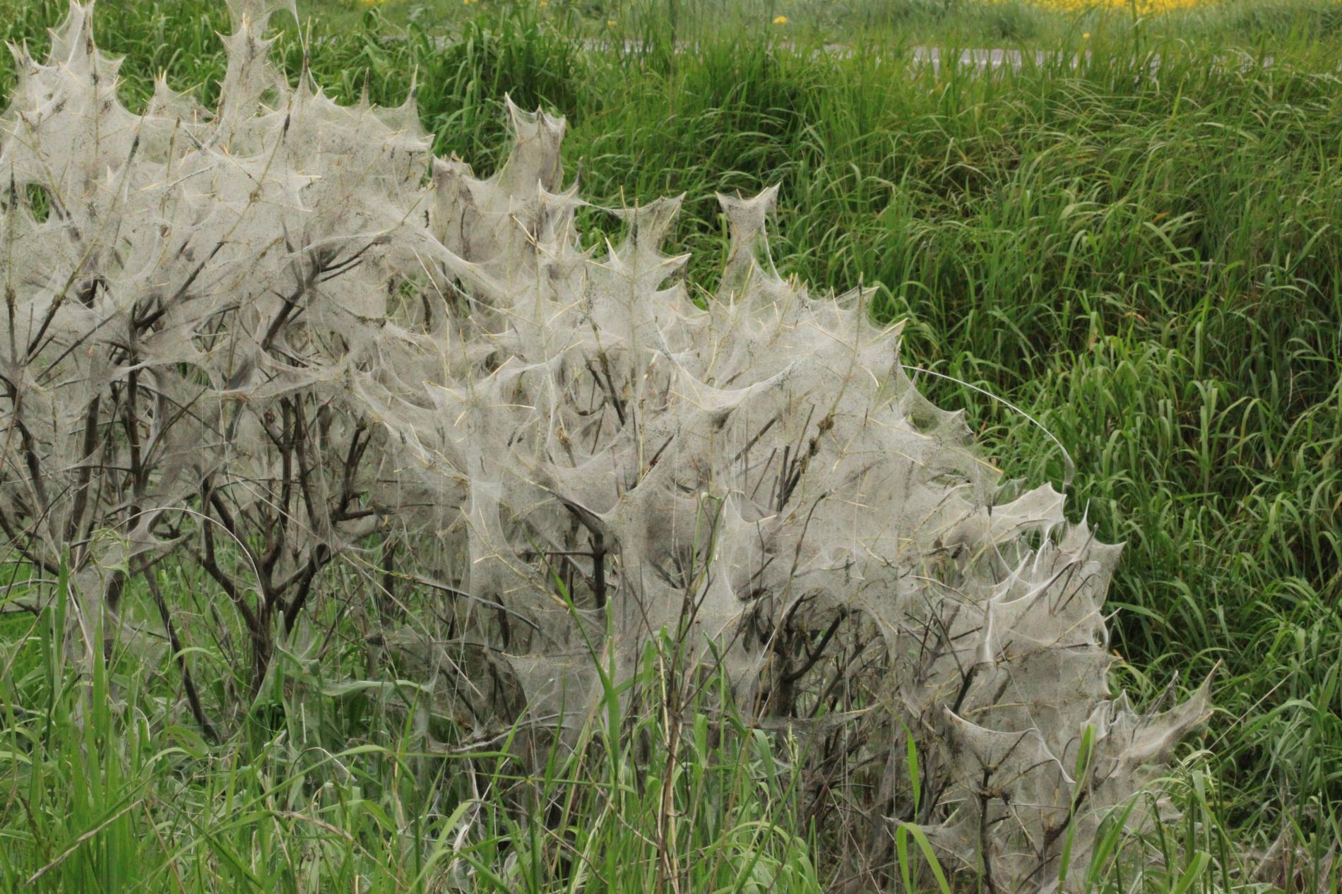 Bushes wrapped in cobwebs.