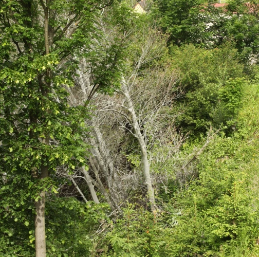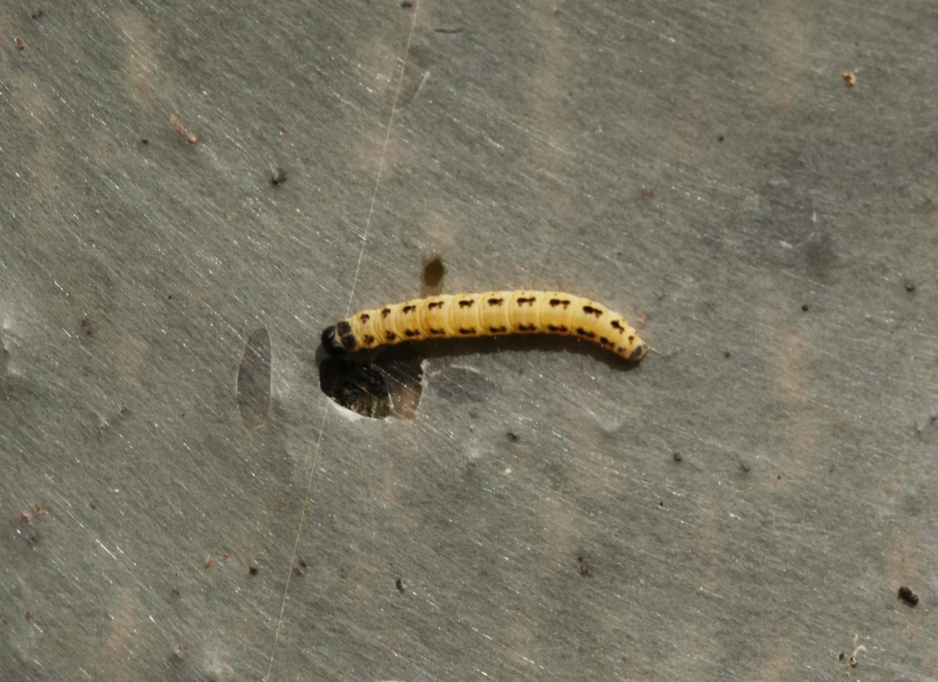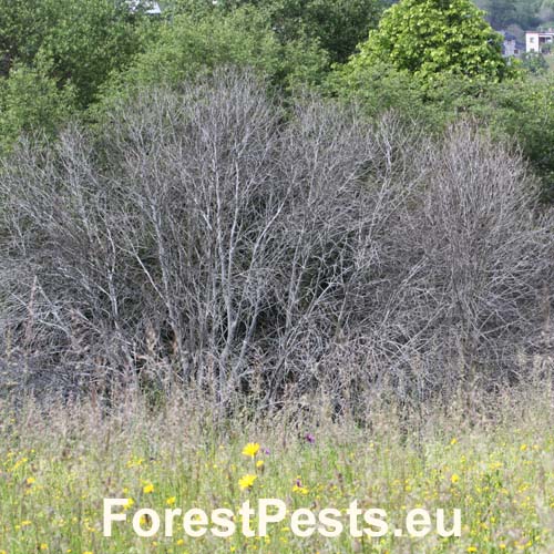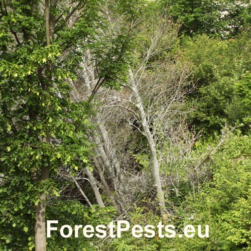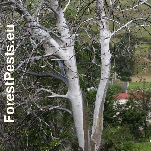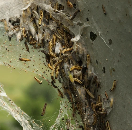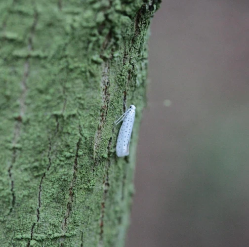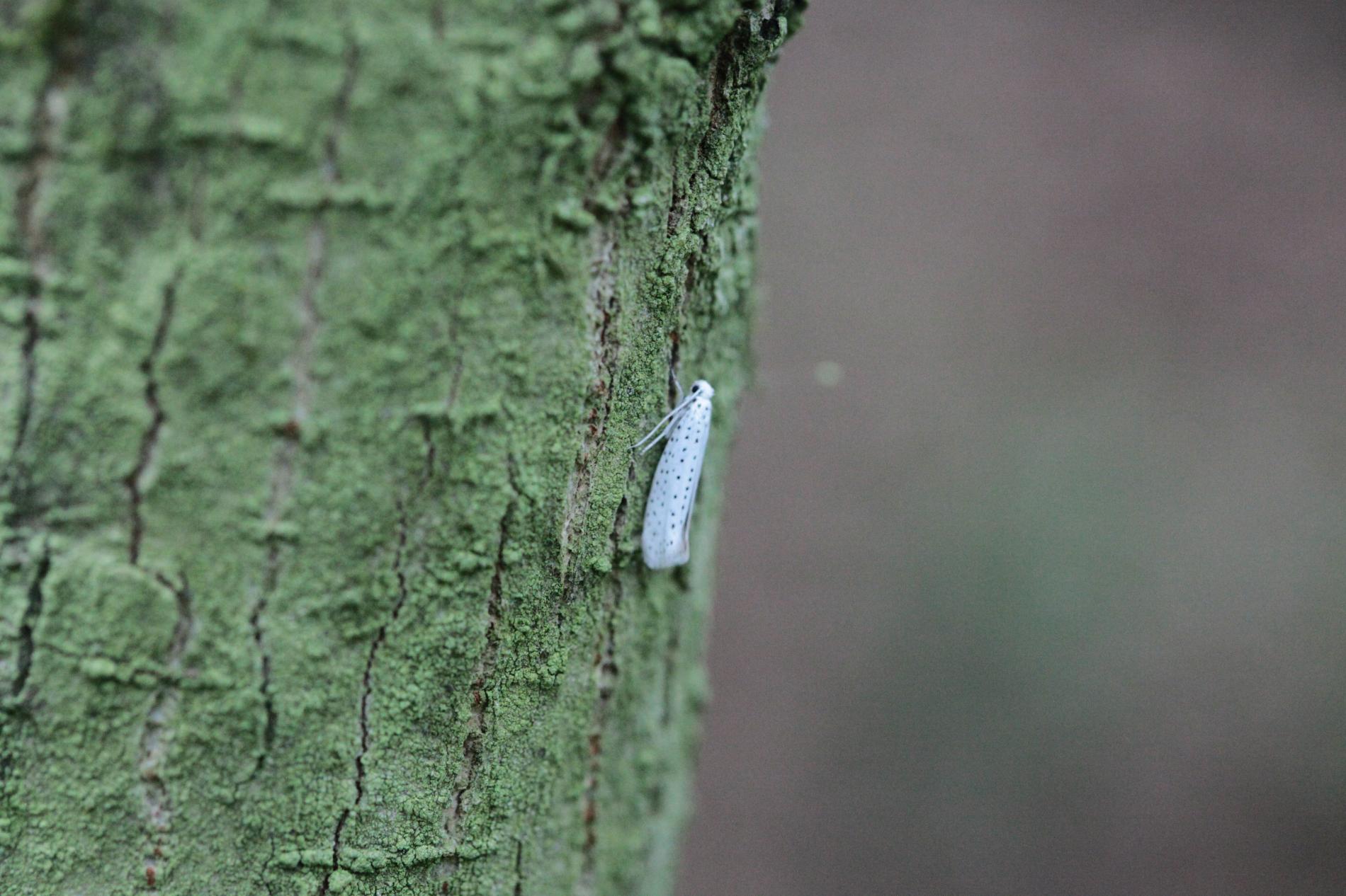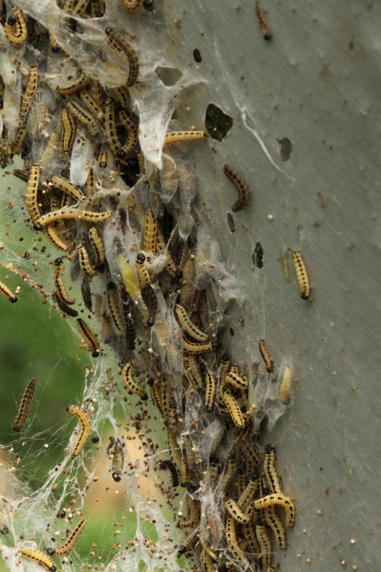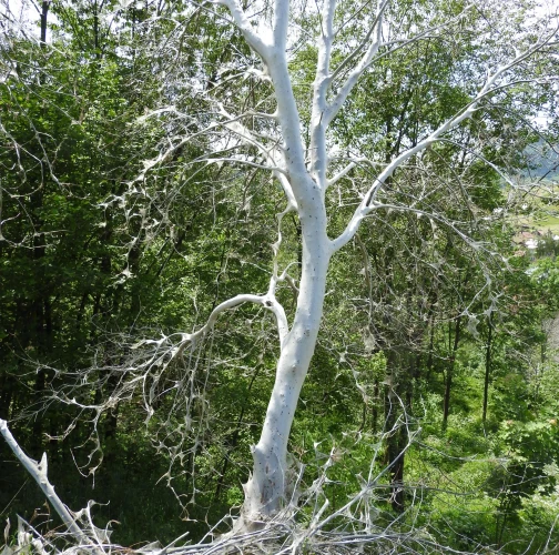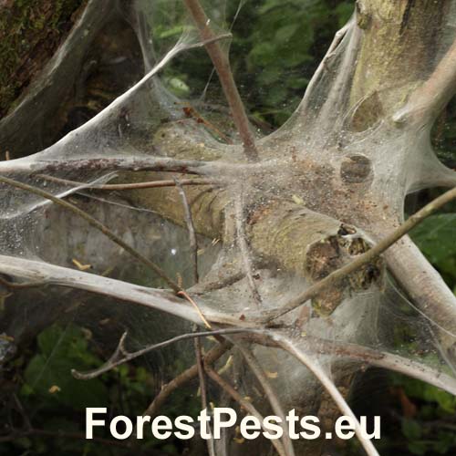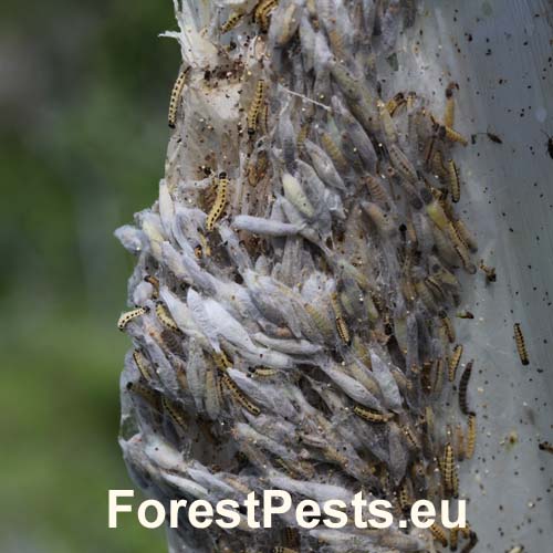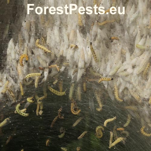 On the leaves of Prunus padus (= racemosa) Lam. This tiny, black and white butterfly occasionally reaches outbreak levels and make severe defoliations, whose white caterpillars live in the nests that they spin on tree branches. Whole trees use to be wrapped in a cobweb. It overwinters like an egg. Caterpillars hatch in the spring. Caterpillars usually live gregarious until they pupate (until the end of June). The adults fliy from July to August. It can cause up to 100 % defoliation of tree during gradation. Sometimes it wraps other trees with cobweb fibers too, but it does not cause any damage to them. It never damages any other tree species except Prunus racemosa - fruit trees or any other types of trees. Cobweb fibers and caterpillars or cocoons do not cause allergenic reactions and are harmless to humans.