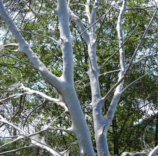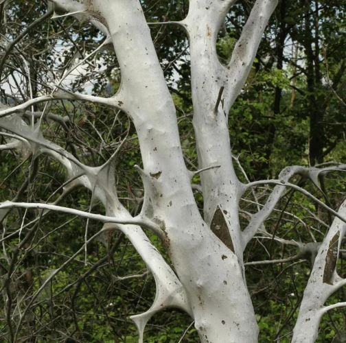 White coatings on the trunks and branches of the sagebrush. Webs are very strong and compact.