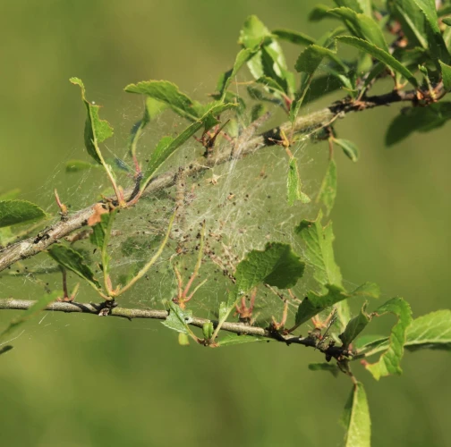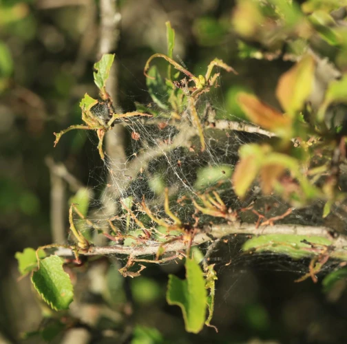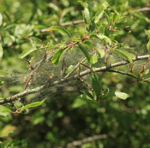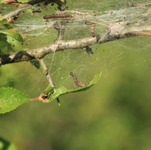 Defoliation of trees. White silk webs on branches and branches. The presence of caterpillars.