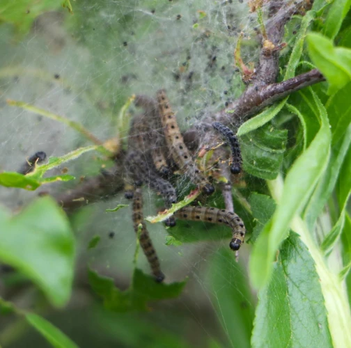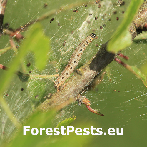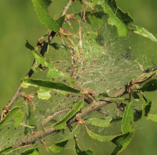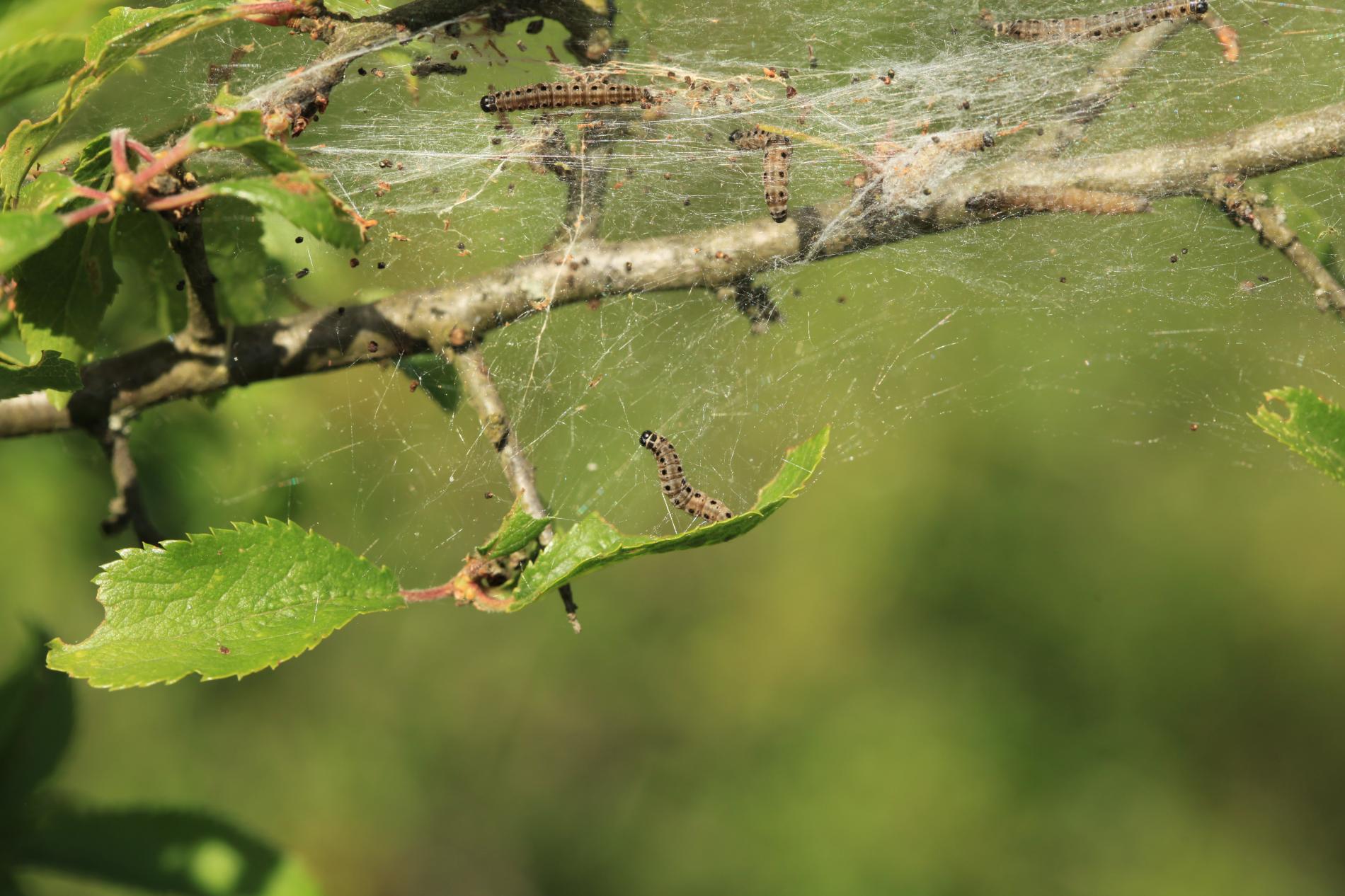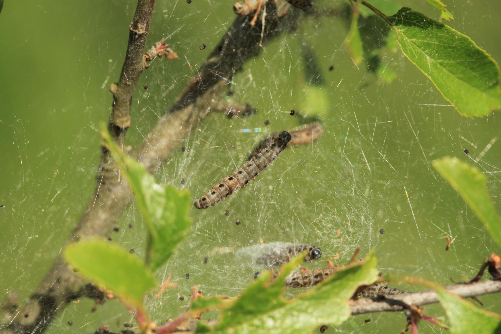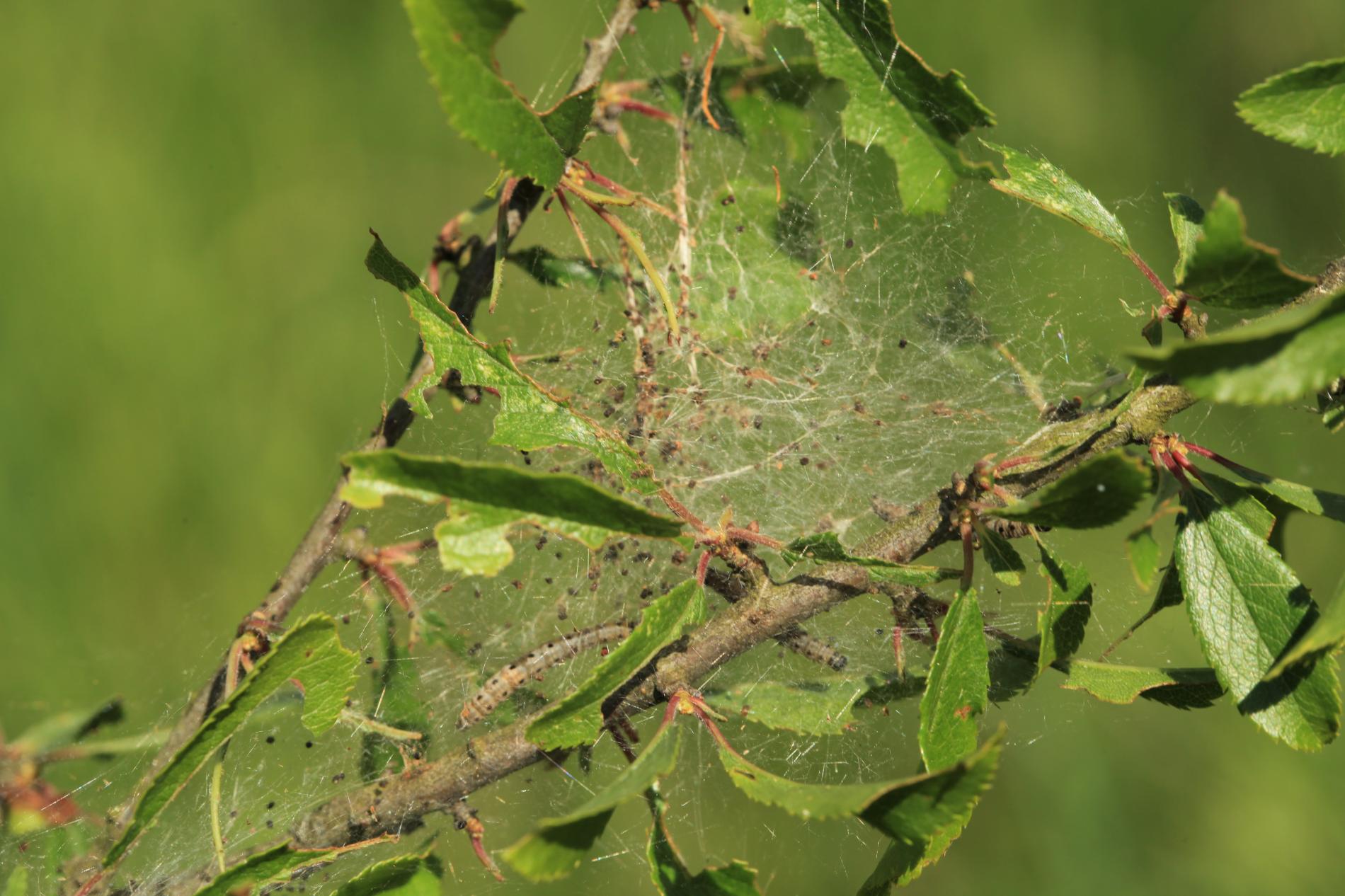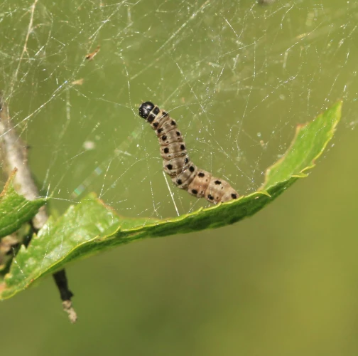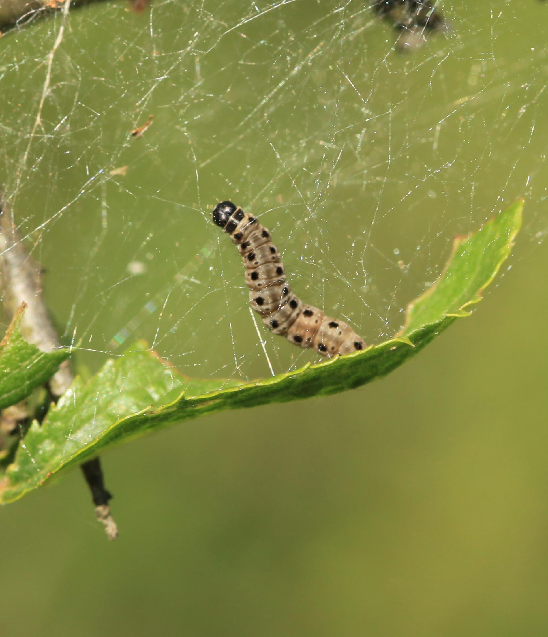 Yponomeuta padella, commonly known as the Orchard Ermine Moth, is a species of moth belonging to the family Yponomeutidae. This moth is known for its distinctive appearance, characterized by white wings with numerous black spots. The larvae of Yponomeuta padella are particularly fascinating as they construct communal silken webs on various host trees (mainly on Prunus spinosa and Crataegus spp.), often creating a striking visual effect by enveloping branches in a white webbing. These webs serve both as shelter and a means of protection from predators. Yponomeuta padella is found in various habitats across Europe and parts of Asia. Larvae can cause damage to host trees, particularly fruit trees and ornamental shrubs. The larvae often defoliating entire branches or sections of trees. While the damage caused by Yponomeuta padella may not usually result in the death of the host tree, severe infestations can weaken the plant, reduce its ability to photosynthesize, and impact its overall health. This can lead to reduced fruit production and affect also the aesthetic value of ornamental shrubs.