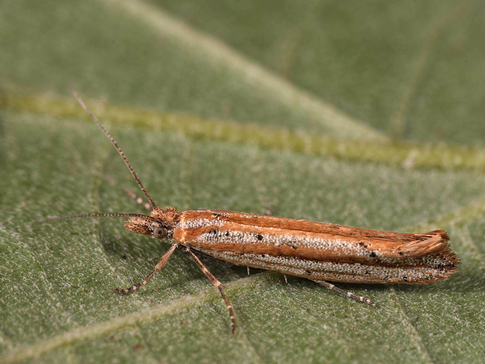 Ypsolopha ustella is an ocher-brown moth of the family Ypsolophidae. Wingspan approx. 15-20 mm. It flies in one generation from July to April (the image hibernates). The caterpillar is green, the last pair of wings is pointing backwards and the caterpillar has an elongated shape. It lives among spun leaves from May to June. It has many similar related species.
