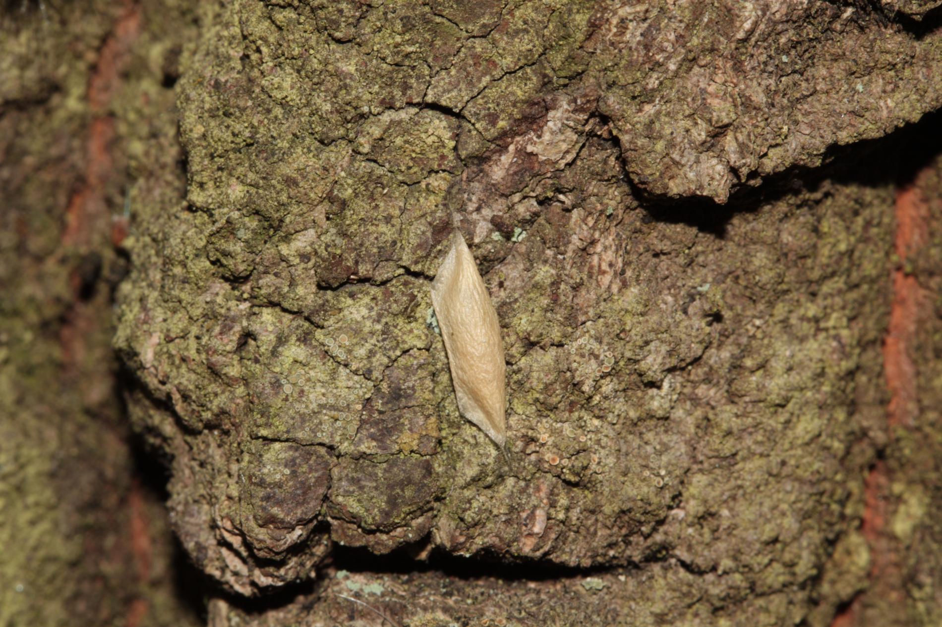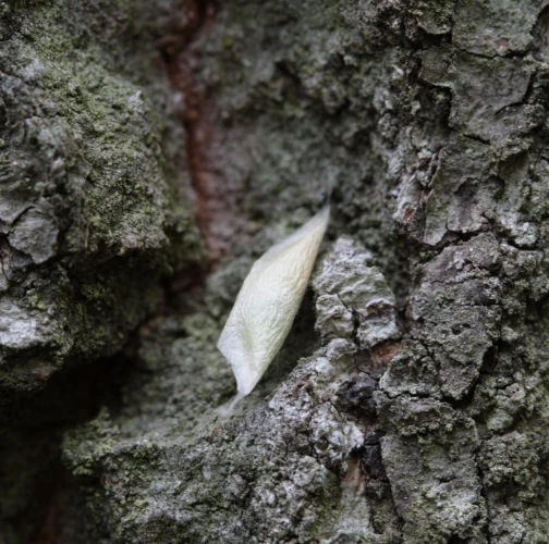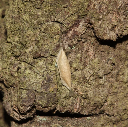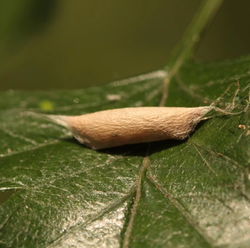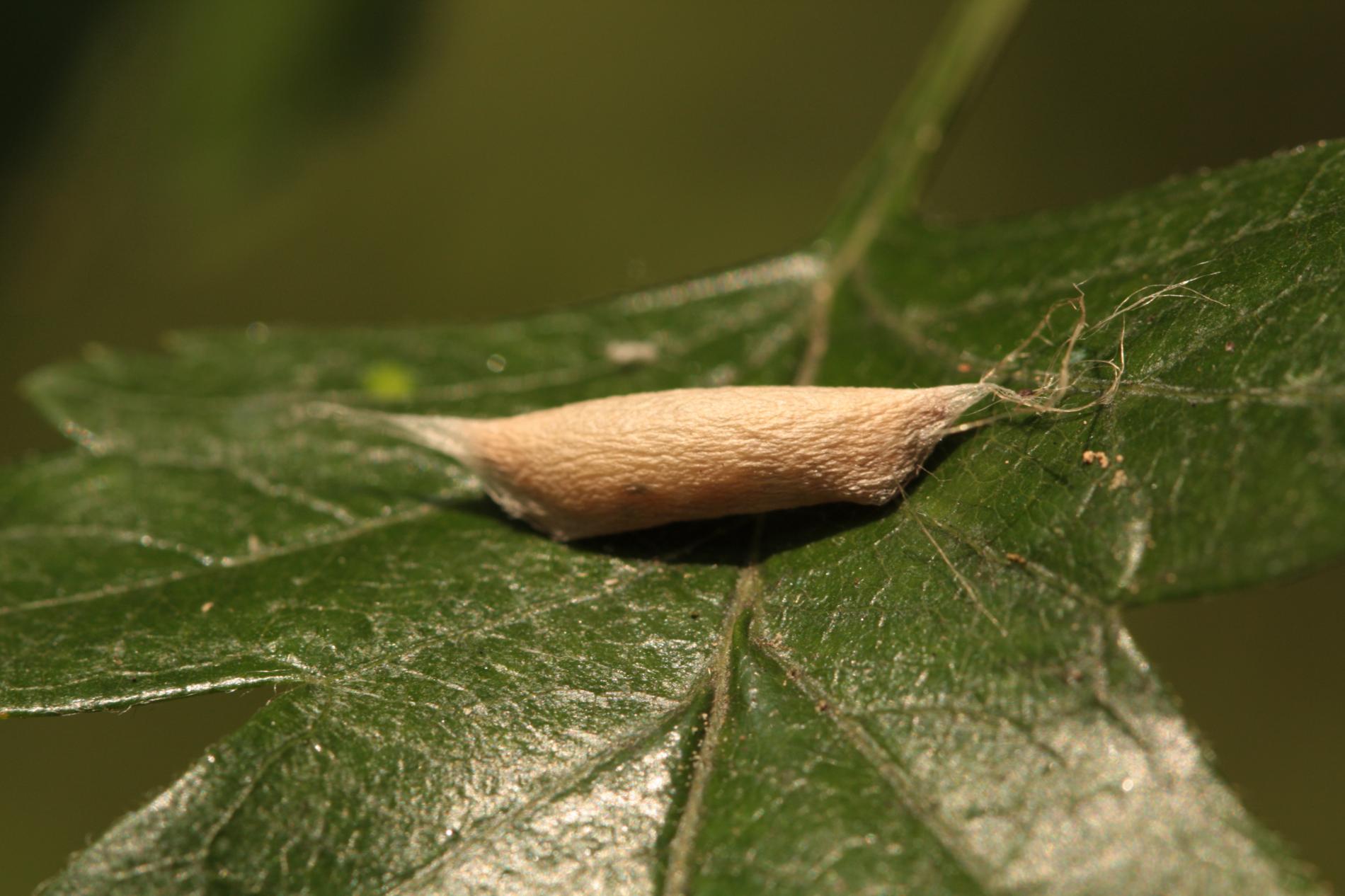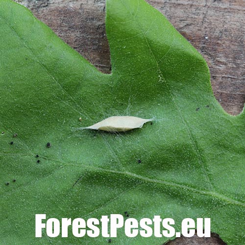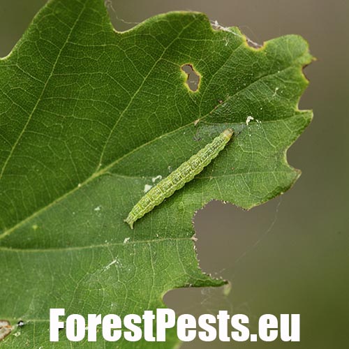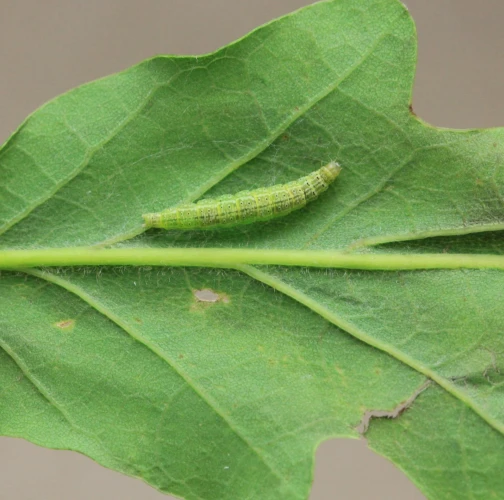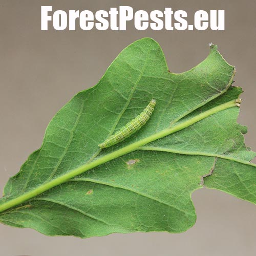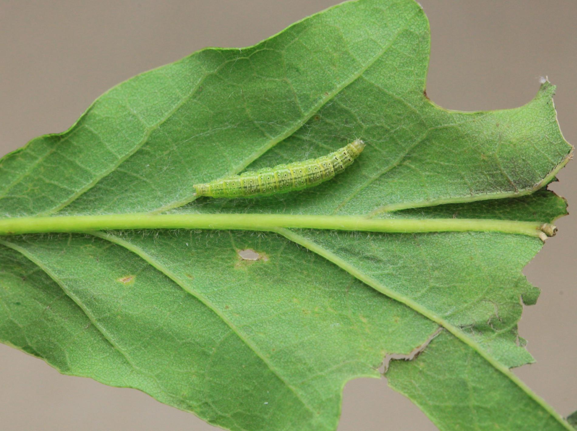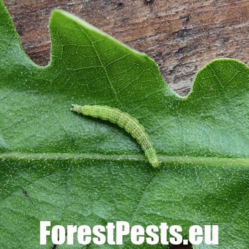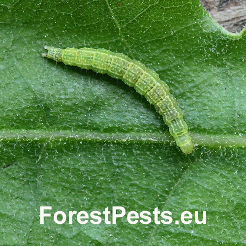 The caterpillar is green, the last pair of wings is pointing backwards and the caterpillar has an elongated shape. It lives among spun leaves.