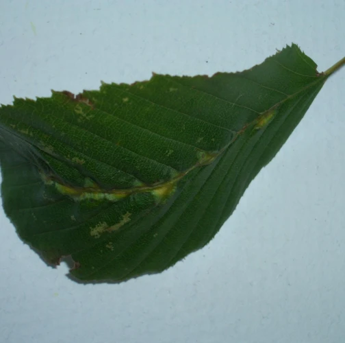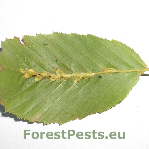 Elongated galls, 3–5 cm long, are found on the undersides of leaves along the midrib or side veins. Each gall houses a white larva. Galls can also appear on the fruits of the hornbeam.