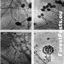 Two photos above - sporangia, two photos below Oogonia with amphigenic antheridium, distinct plerotic oospore. Photo: http://www.phytophthoradb.org/file/html_fppd/phytophthora/cambivora/Figure_2.htm)