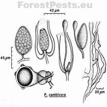 Oogonia ♀ they are spherical; more than 50% of the surface is covered with balls or bumps. Oogonia form after the mycelium mate with the opposite type of the same species of P. cambivora or another species (e.g., P. cinnamomi or P. cryptogea). The oogonia diameter is 30-58 µm (with an average of 48 µm). The wall thickness of the oogonia is up to 2 µm. In the end, hyphae form.