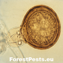 The oogonia are round, often with a level base, with a smooth surface, translucent to yellowish-brown with a diameter of 21 - 58 µm (average 40 µm).